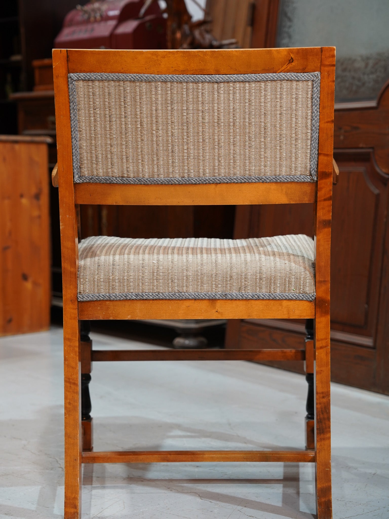 座面と背もたれは布張りのクッションで、ゆったりと腰掛けることができます。長年大切に使われてきたことが伝わる、温かみのある佇まいです。
