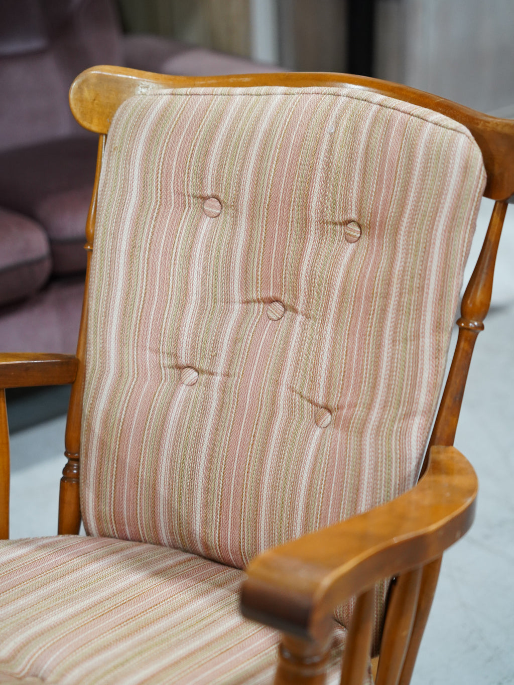 脚部やアーム、背もたれのフレームには、美しい木目を持つ天然木が使用されています。深い飴色にも見える色合いは、使い込むほどに味わいを増し、お部屋に落ち着きと上質な雰囲気をもたらします。