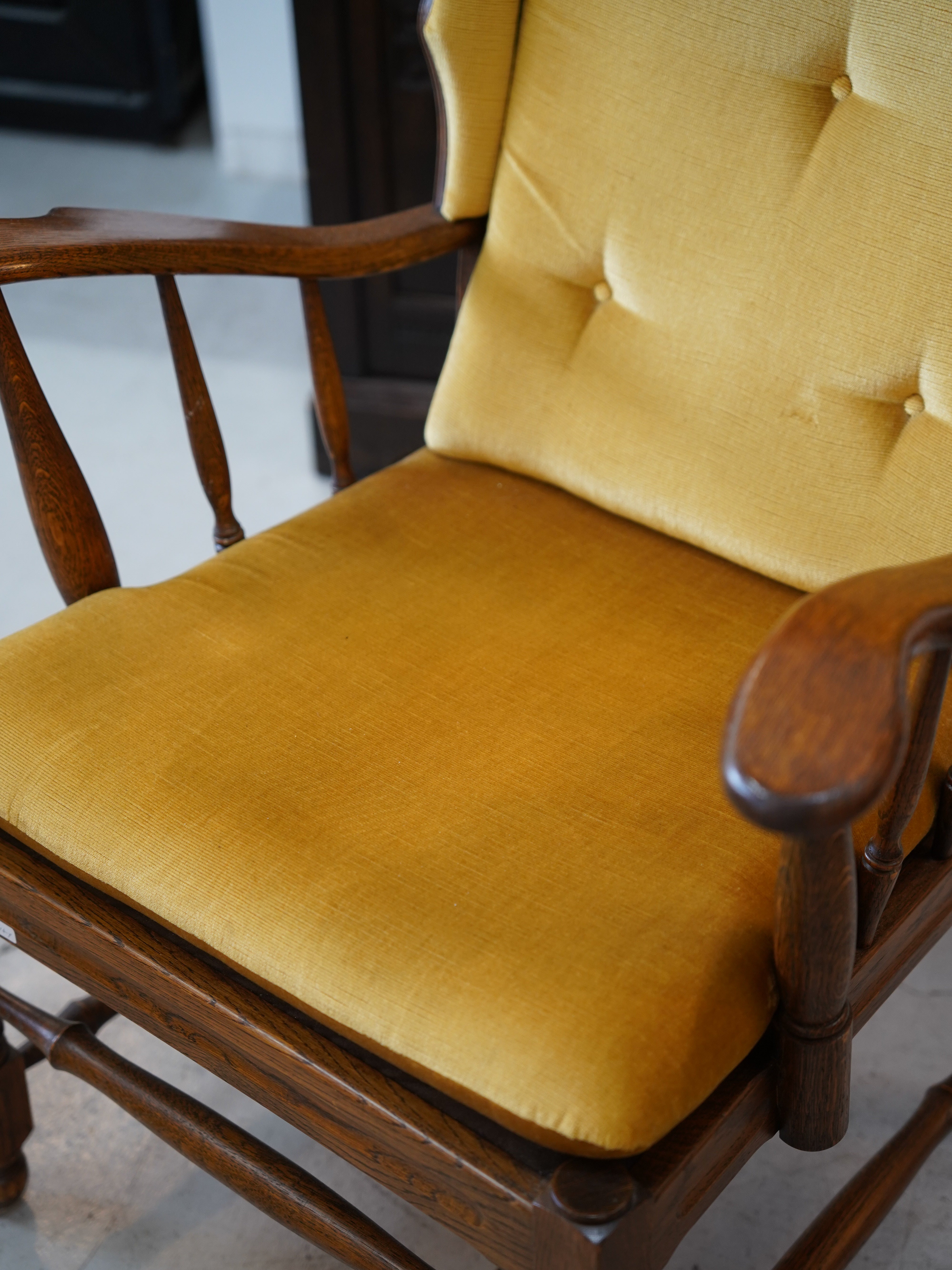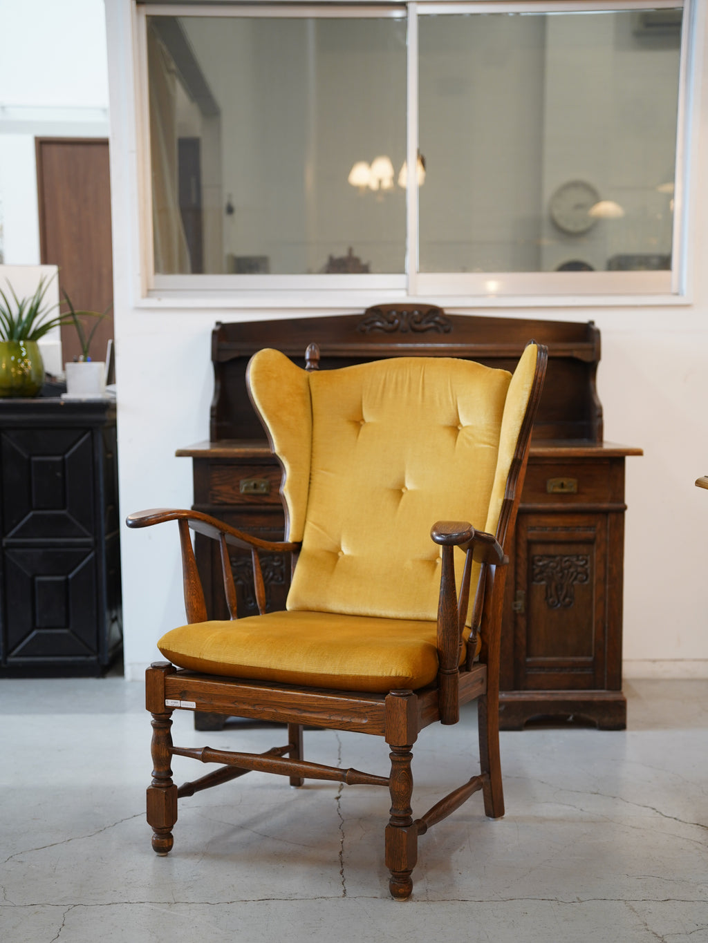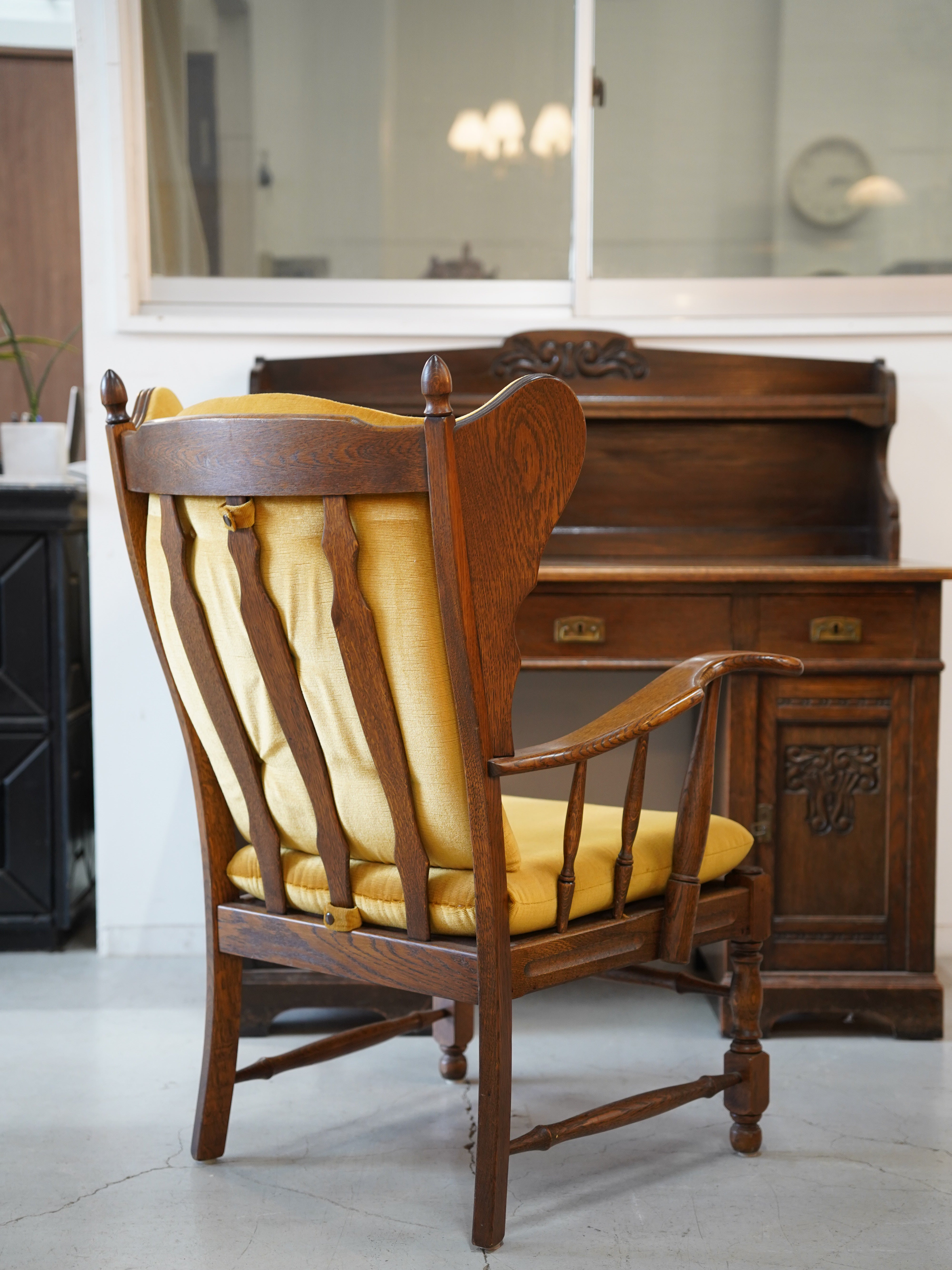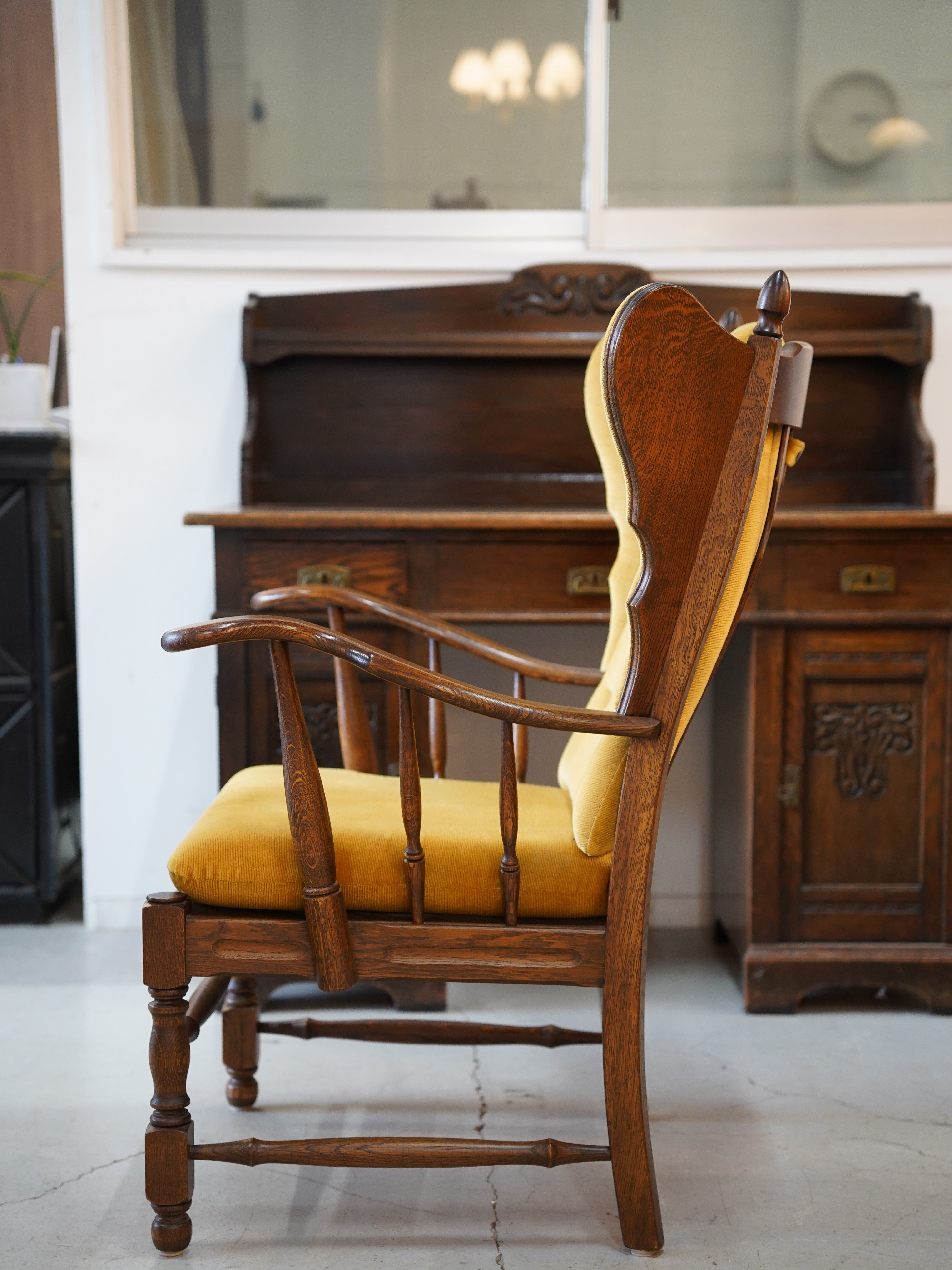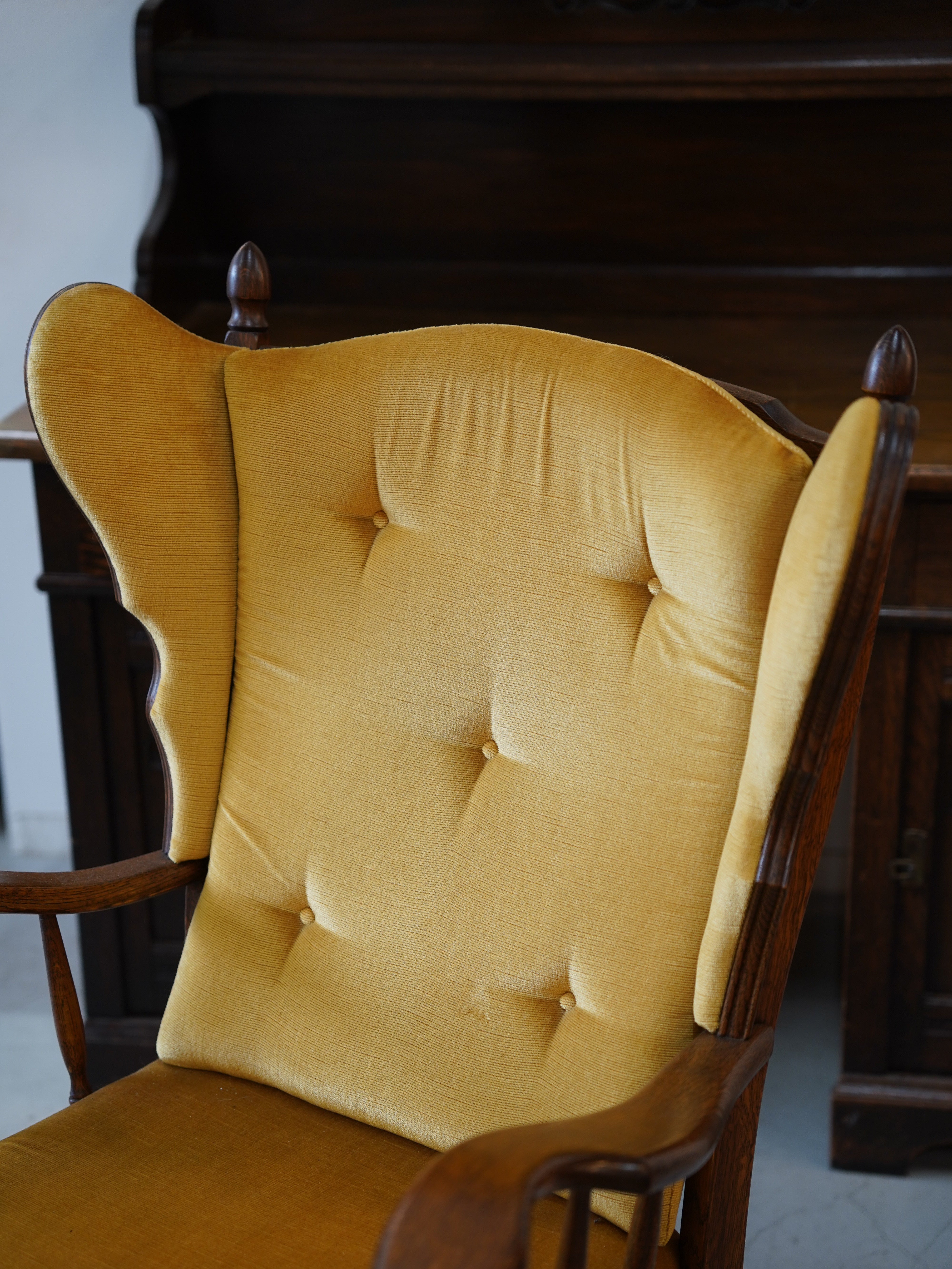 背もたれの高い個性的なデザインが特徴の、ヴィンテージ・ウィングバックチェアです。