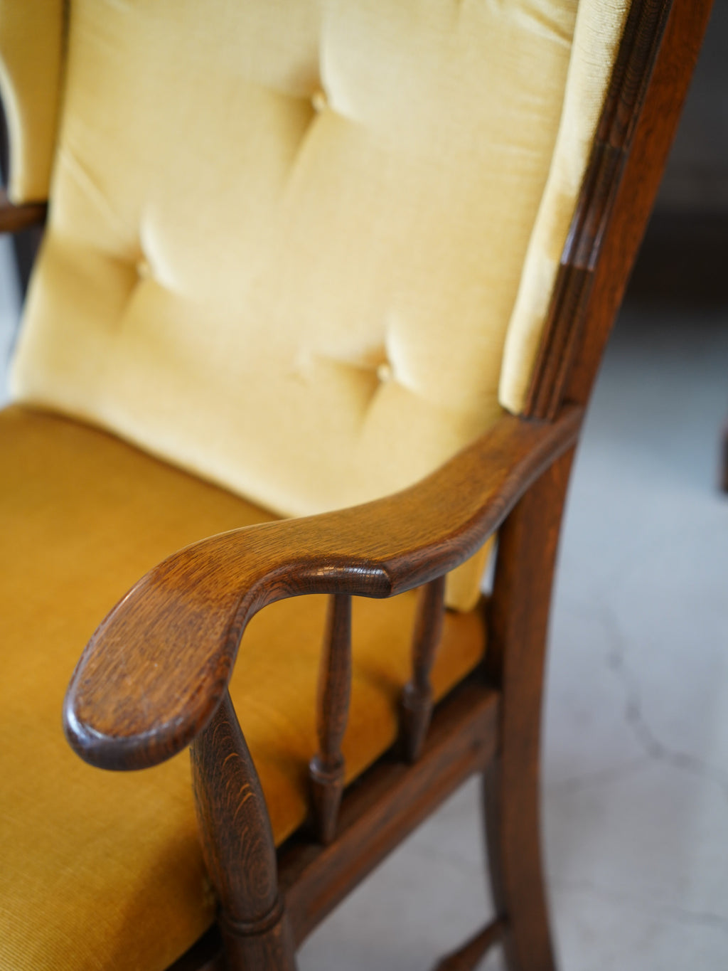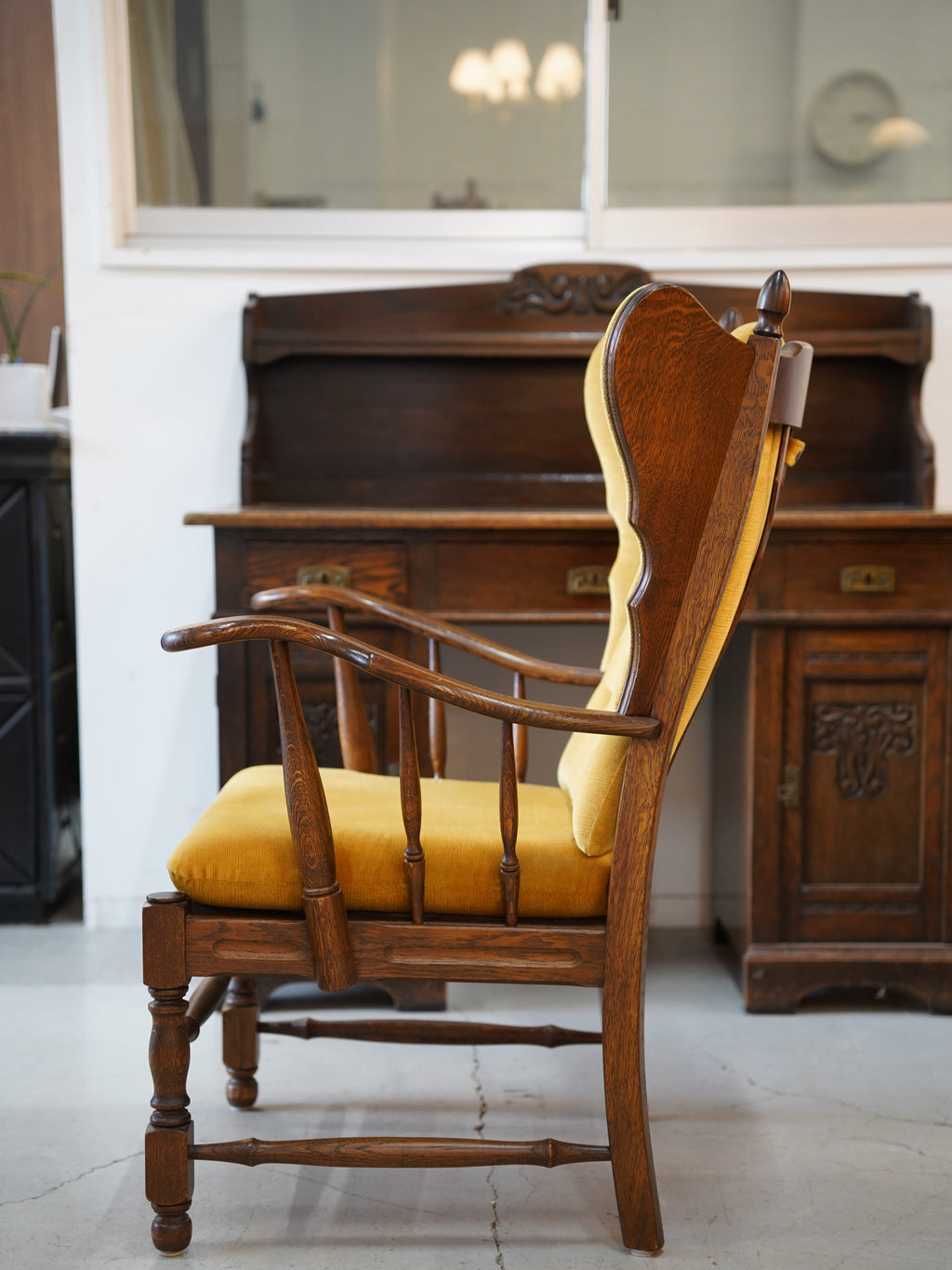美しい木製のフレームと、鮮やかなイエローのファブリックの組み合わせが、空間に温かさと華やかさをもたらします。