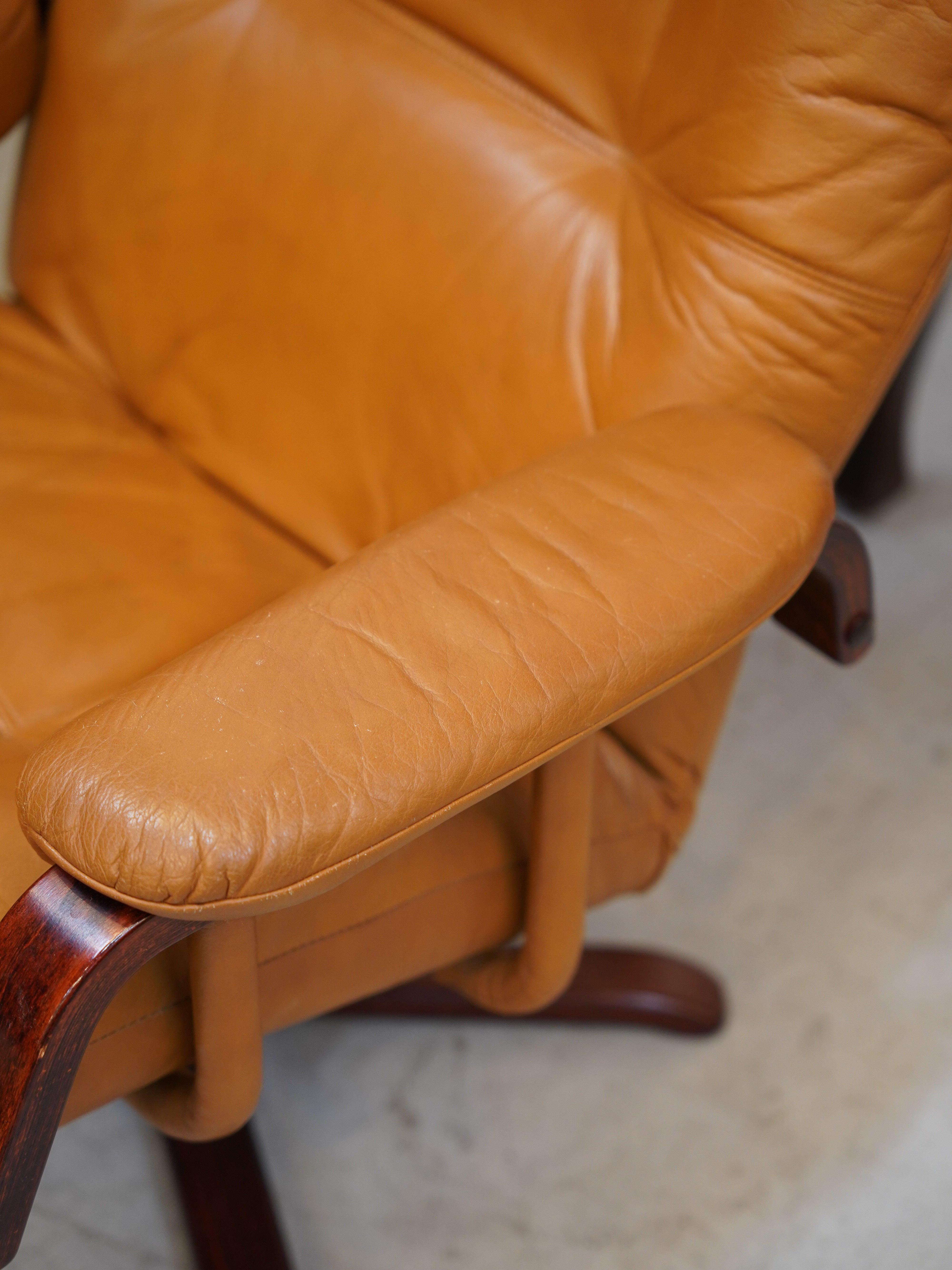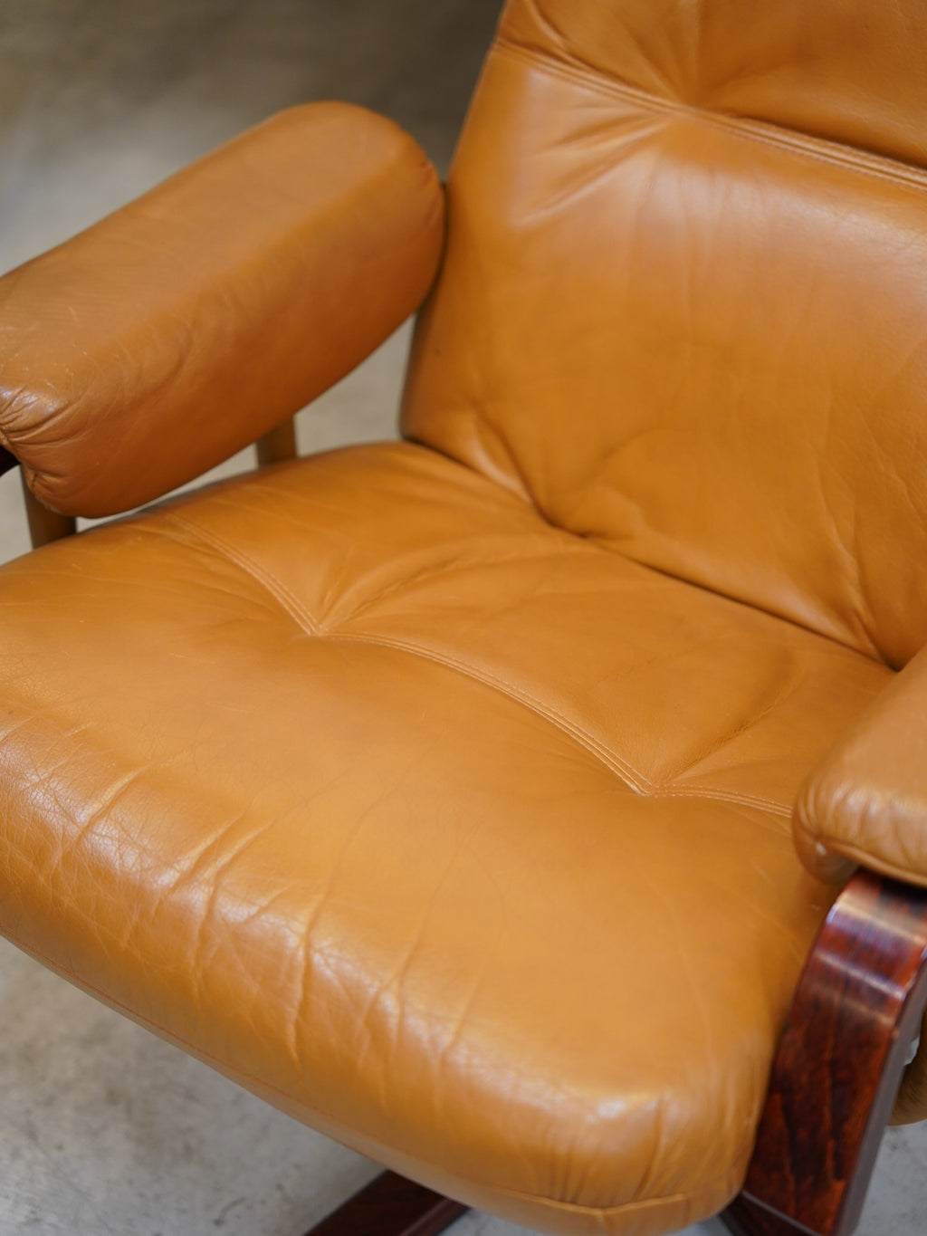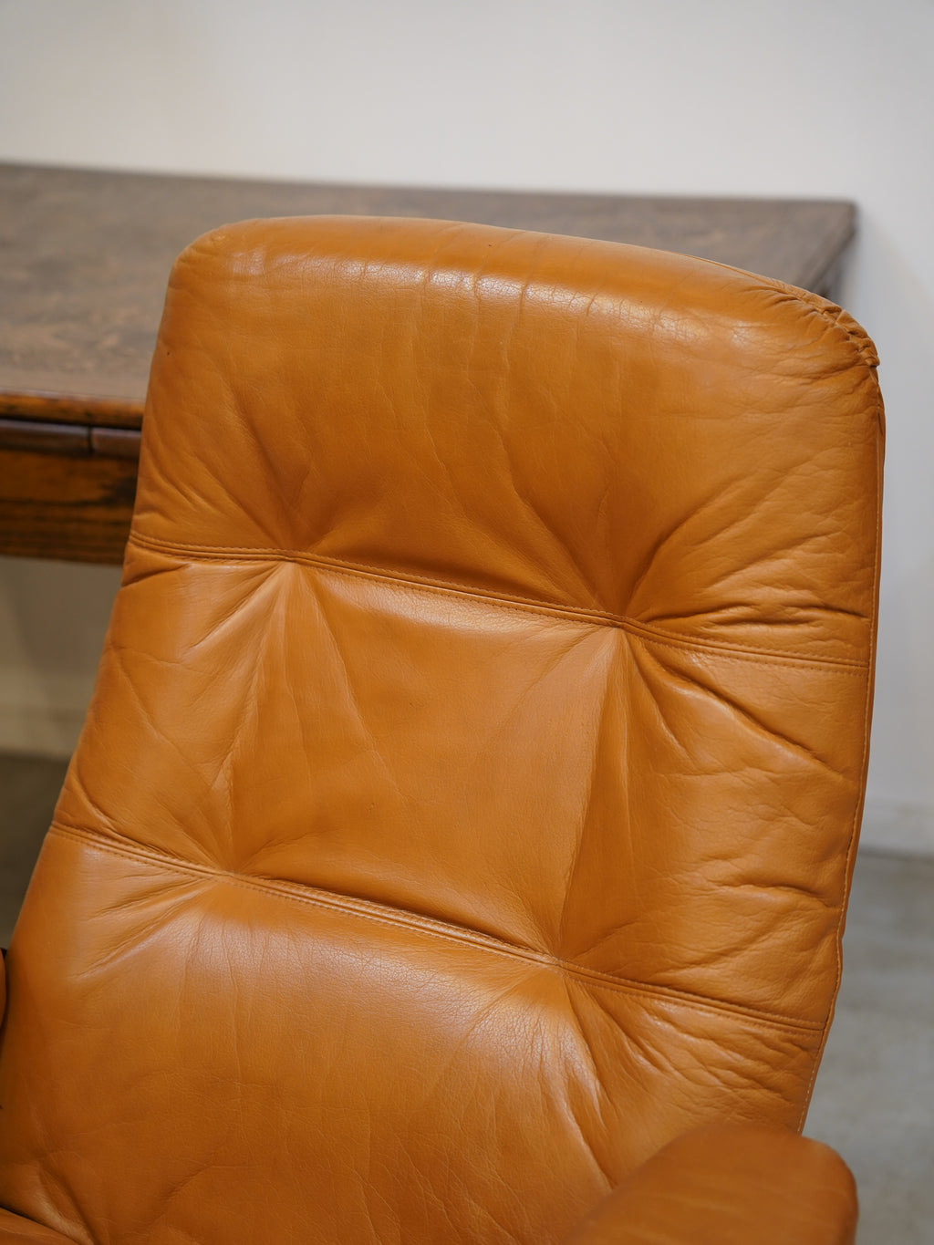 上質な本革が使用されており、使い込まれたことによる深みと艶が増し、ヴィンテージならではの風格を醸し出しています。背もたれから座面にかけてのキルティング加工が、レトロモダンな雰囲気を高めています。