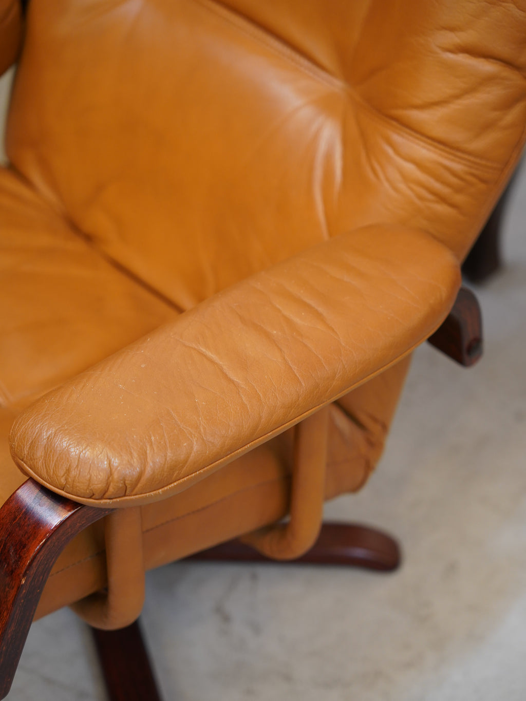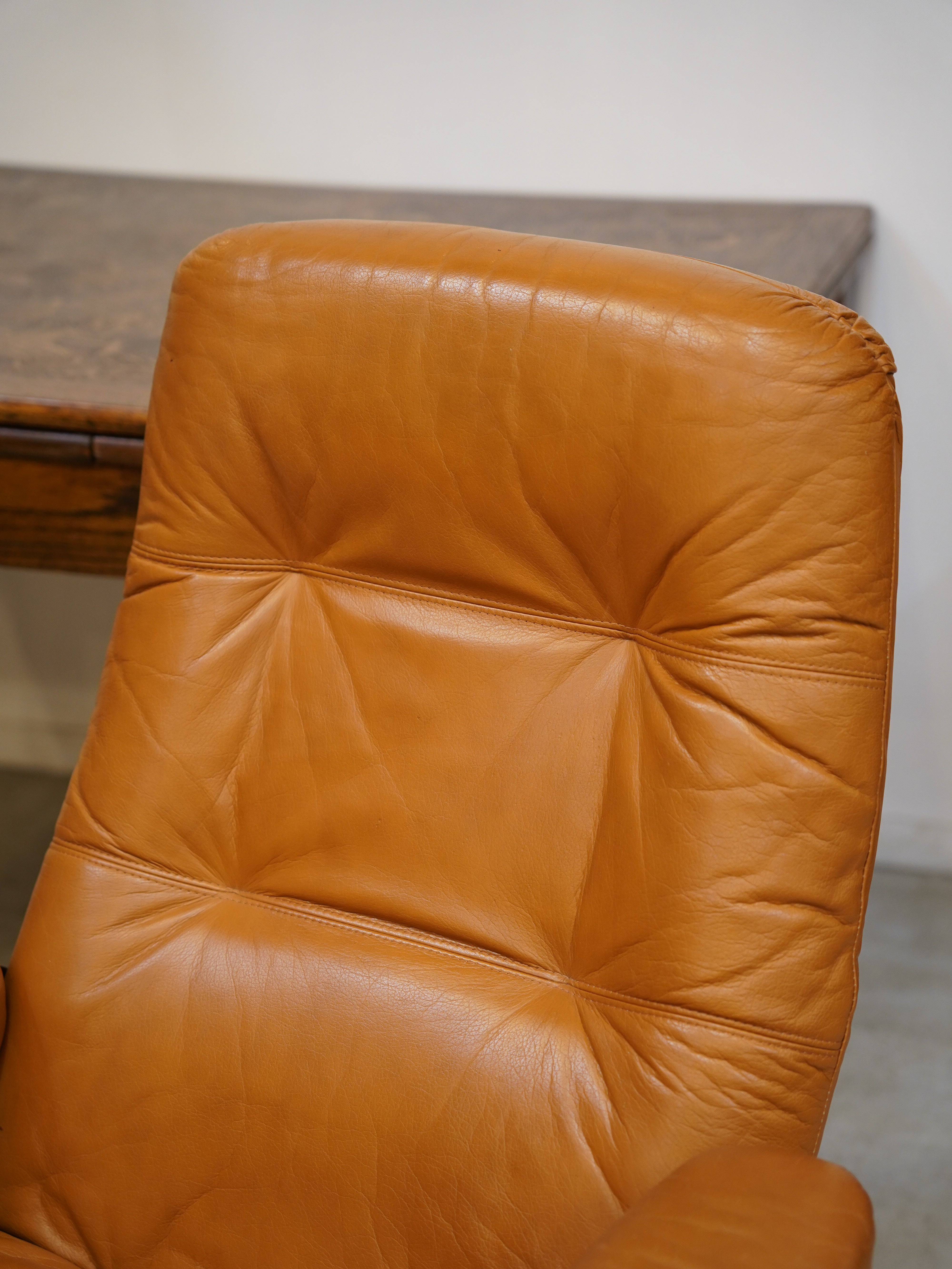 上質な本革が使用されており、使い込まれたことによる深みと艶が増し、ヴィンテージならではの風格を醸し出しています。背もたれから座面にかけてのキルティング加工が、レトロモダンな雰囲気を高めています。
