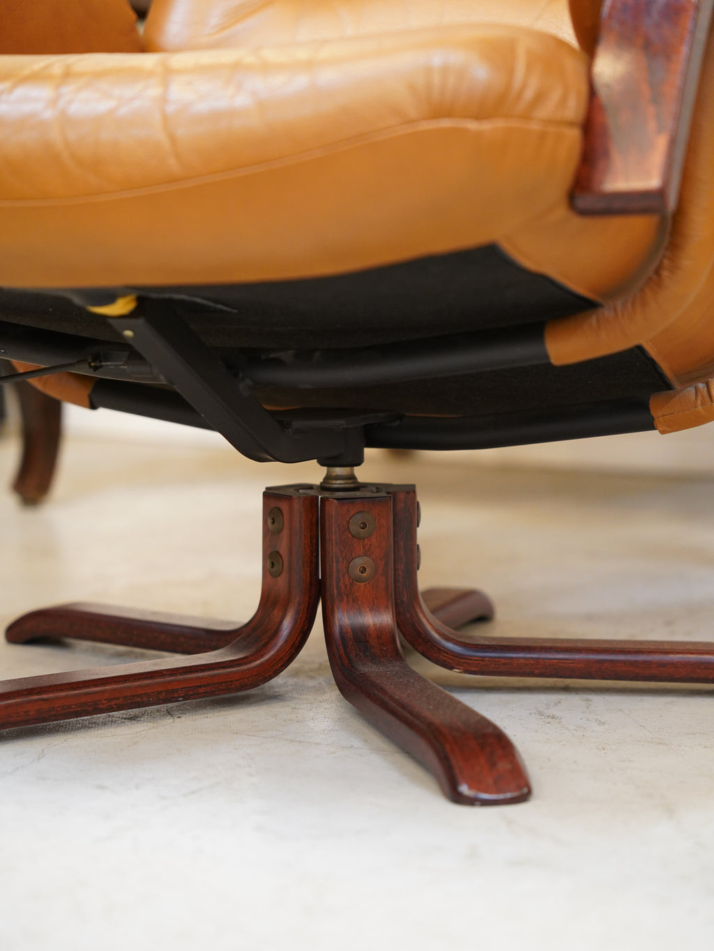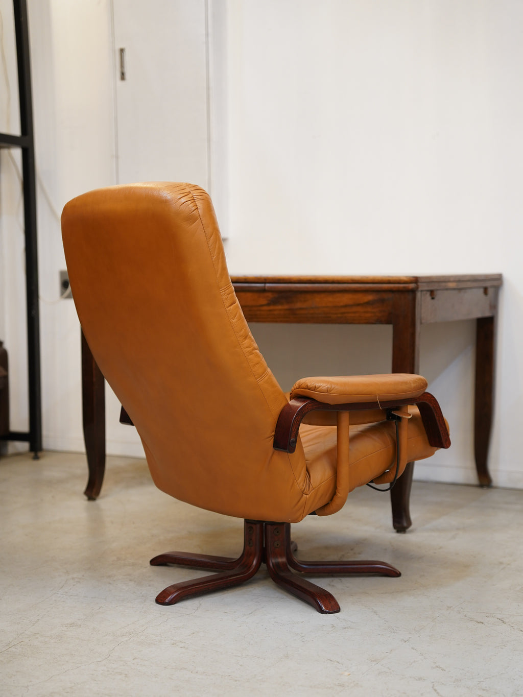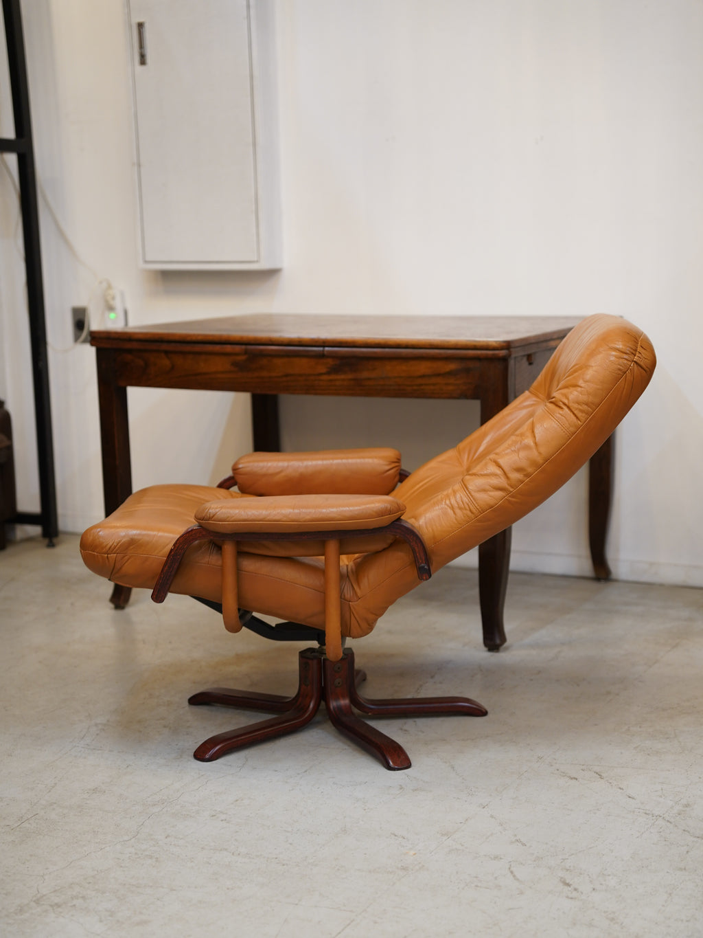 温かみのある木製で特にアームレストと星型のベースは、ミッドセンチュリー期のデザイン家具らしい重厚感があります。