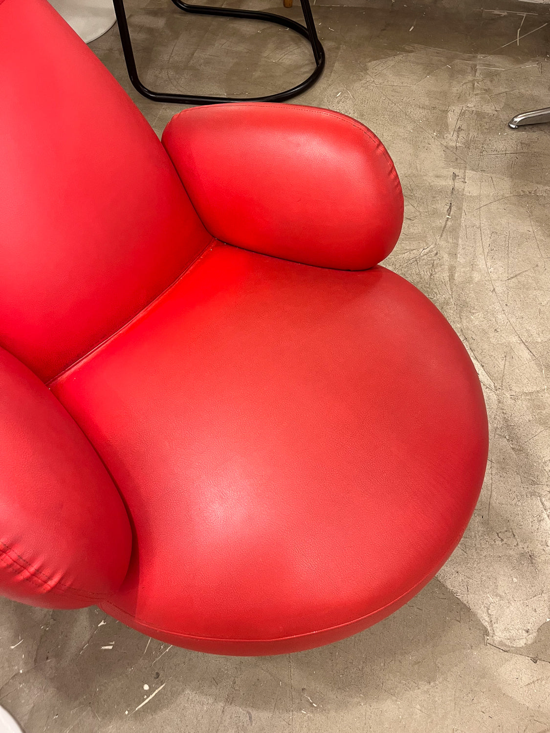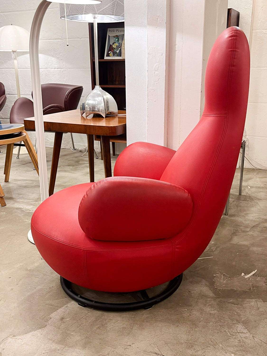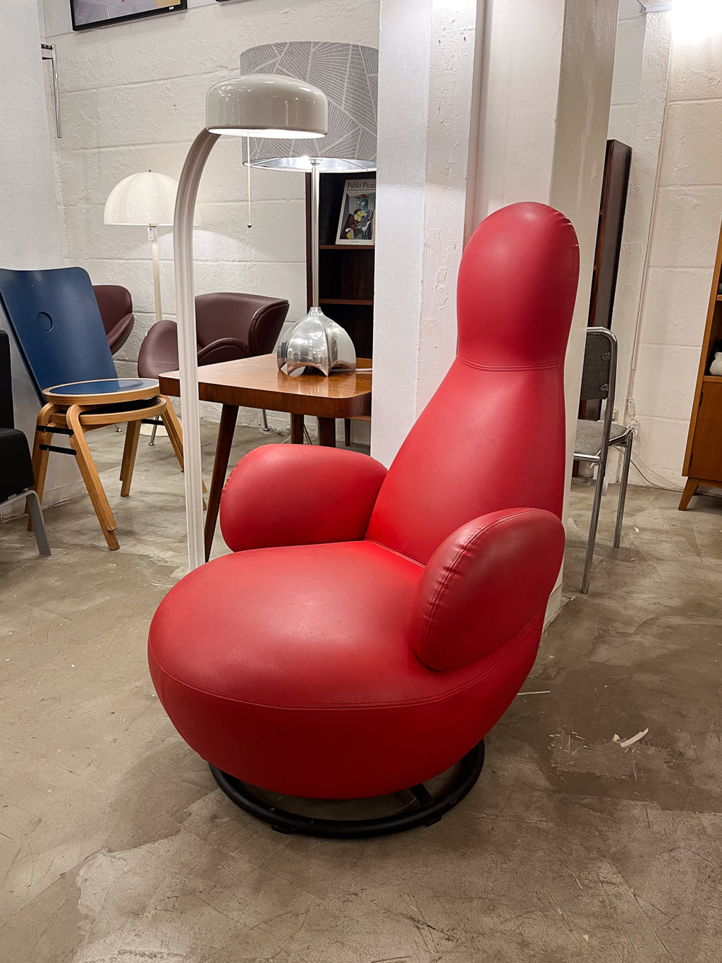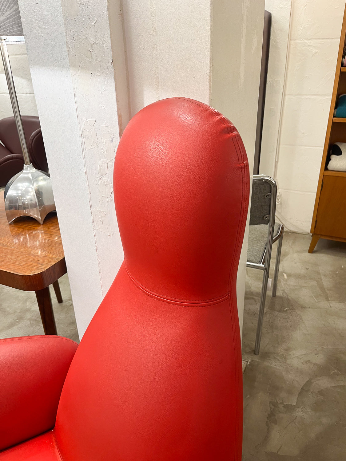 丸みを帯びたシート部分と、背もたれから頭部にかけて縦に伸びるユニークな形状が特徴的で、空間に遊び心とモダンなアクセントを加えます。