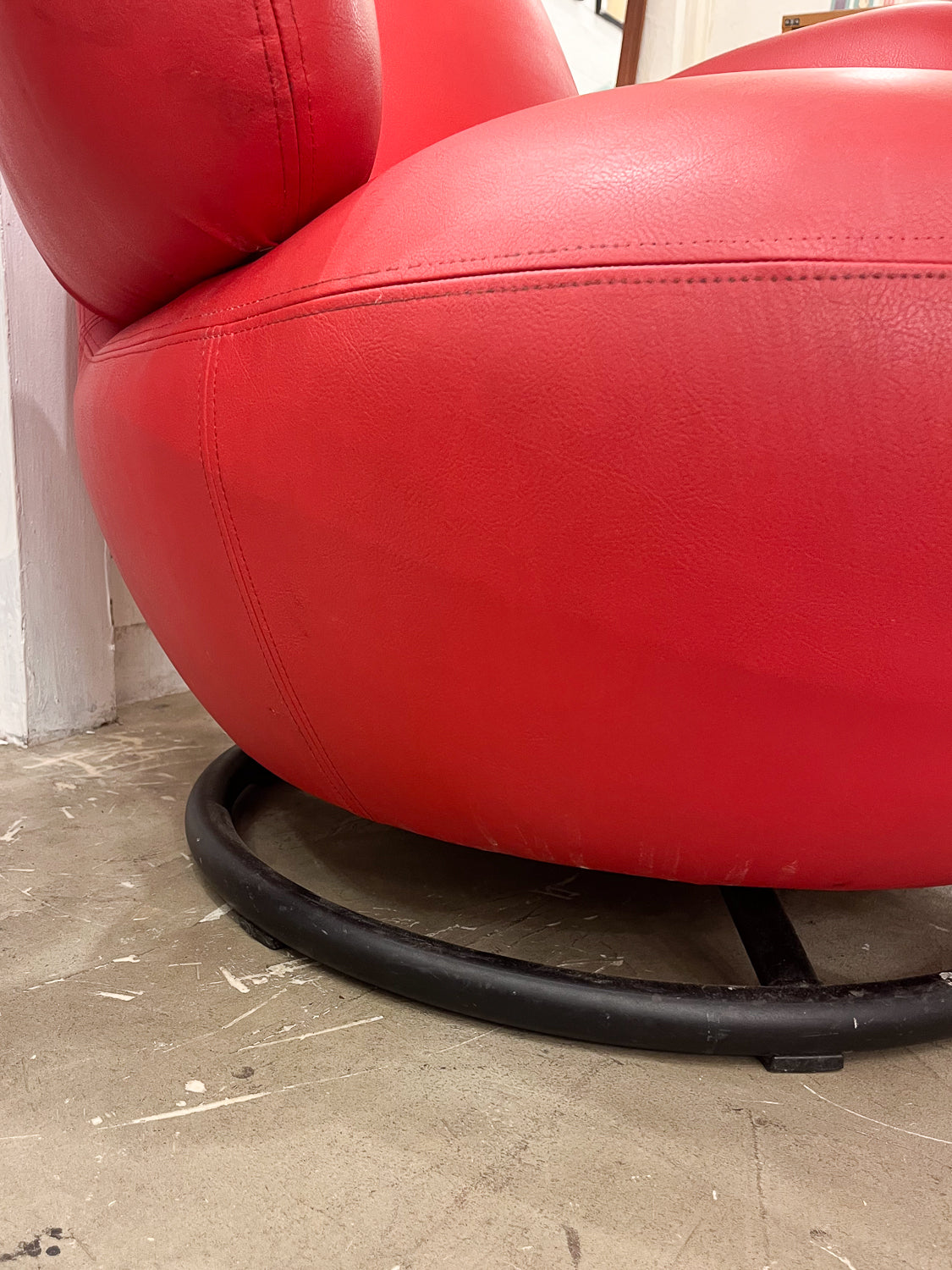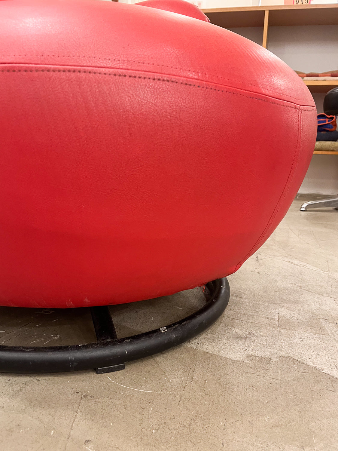 ベースには黒い円形の回転台座が取り付けられており、座面が360度スムーズに回転する仕様です。これにより、自由な姿勢でリラックスでき、実用性も兼ね備えています。