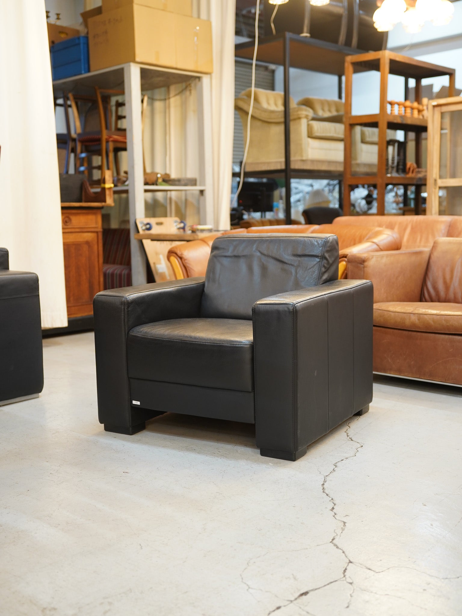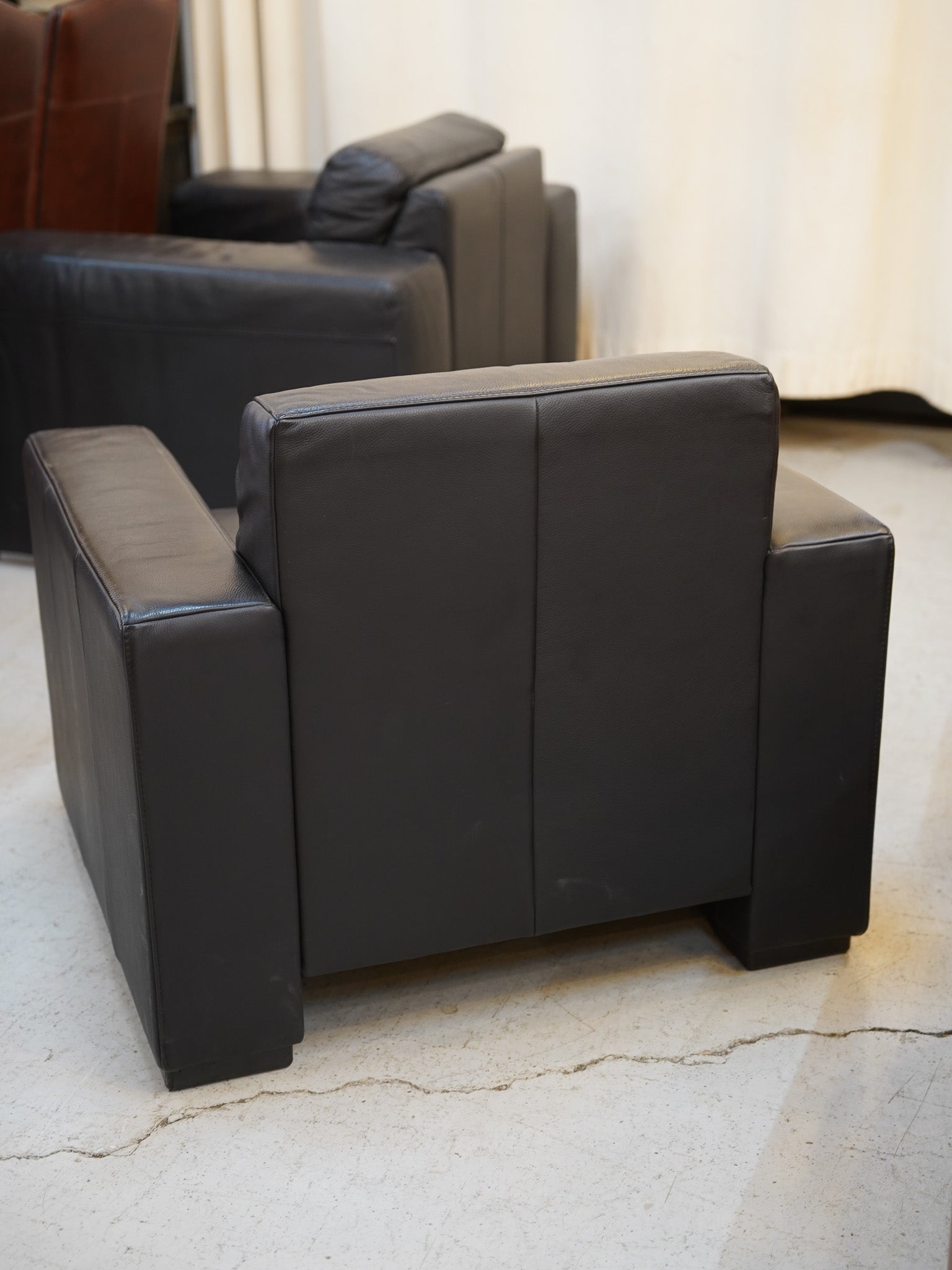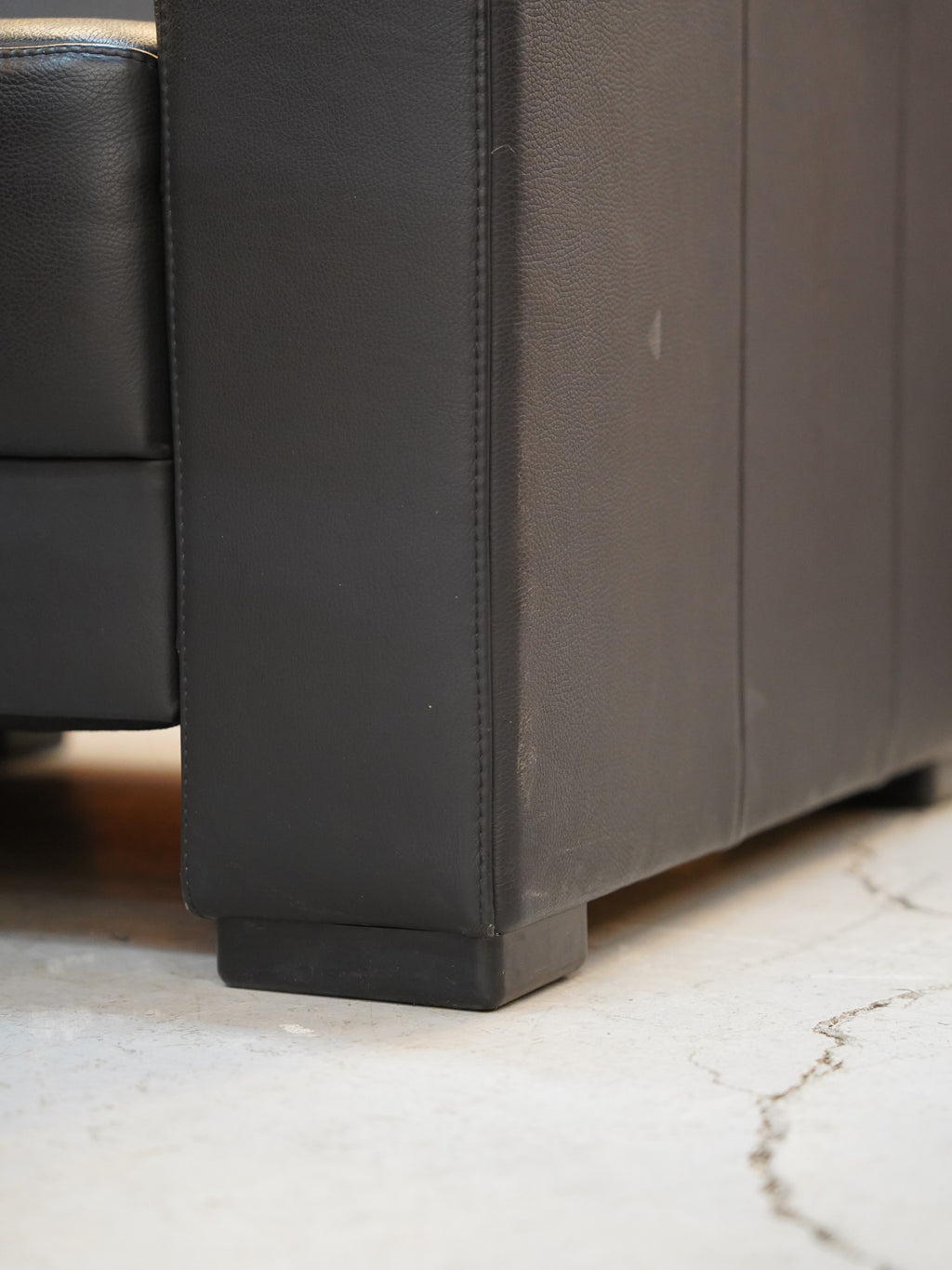 直線を基調としたシャープなフォルムが魅力の、ヴィンテージのモダンレザー1シーターソファ。