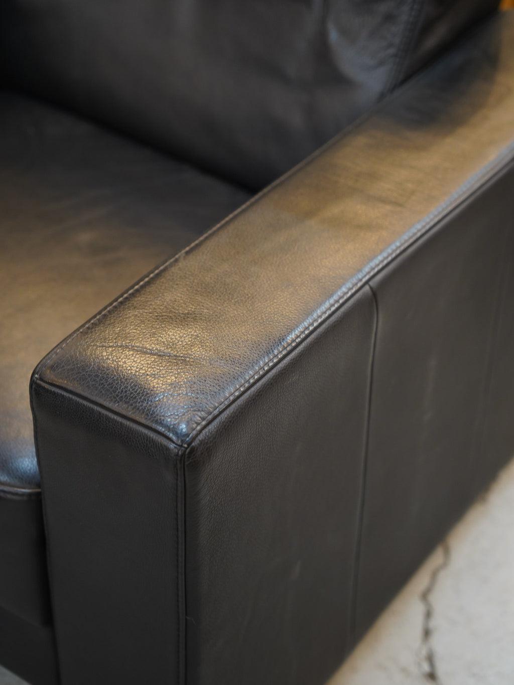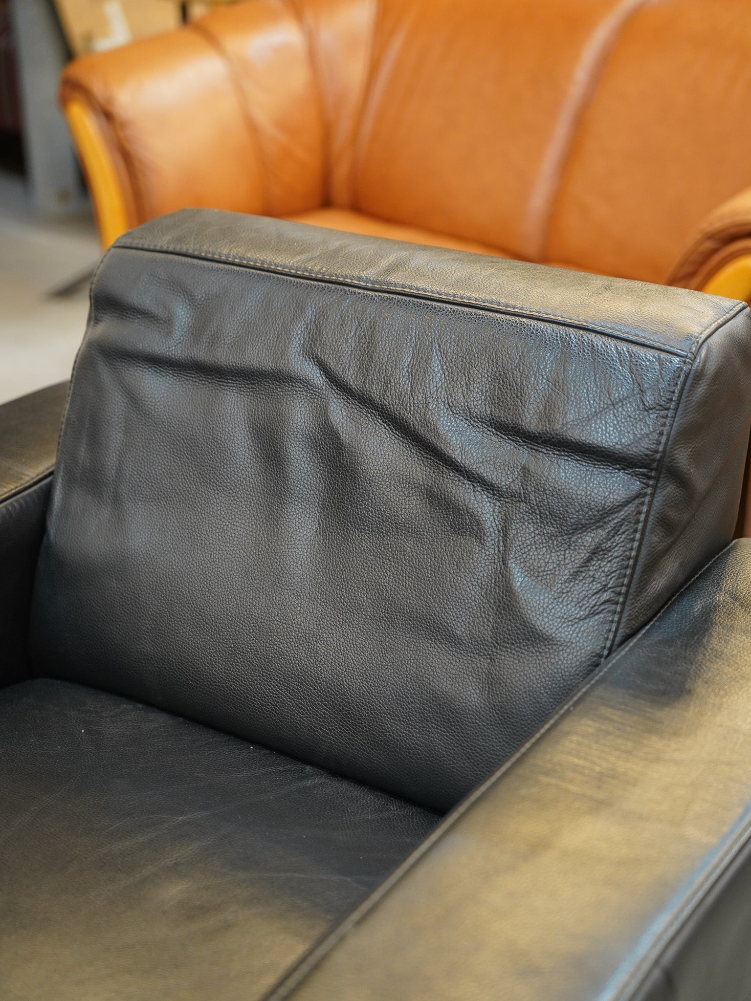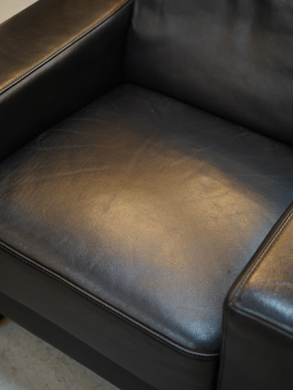 直線を基調としたシャープなフォルムが魅力の、ヴィンテージのモダンレザー1シーターソファ。