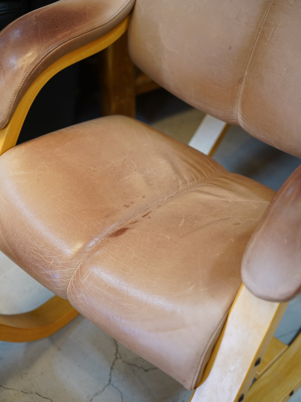 プライウッドのフレームは、揺れの動きを計算し尽くしたしなやかな曲線美を誇ります。クッションは柔らかなタンカラーのレザーで、頭部から膝下までを多層的にサポートします。