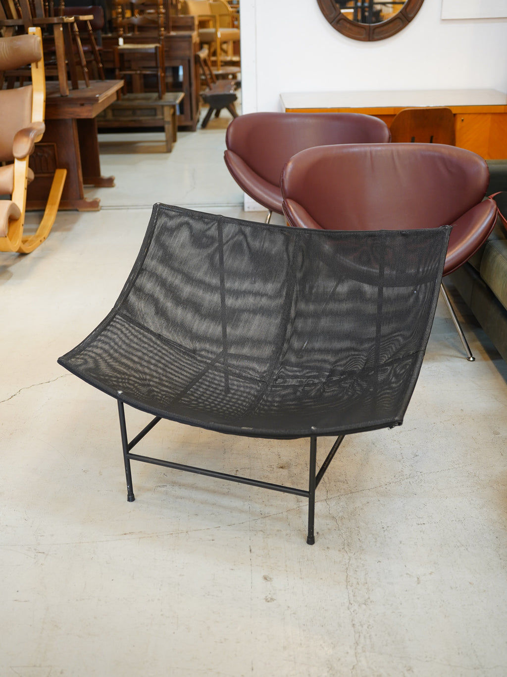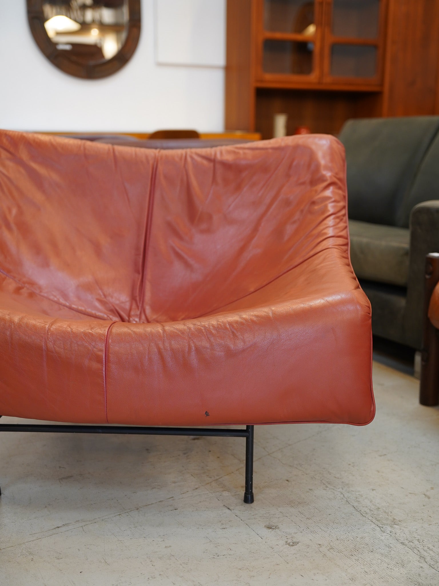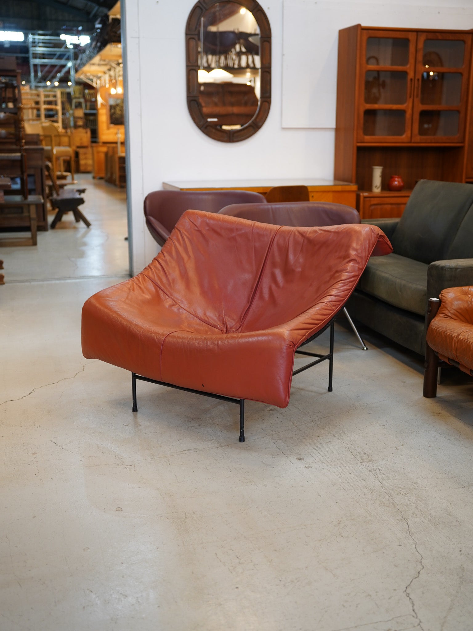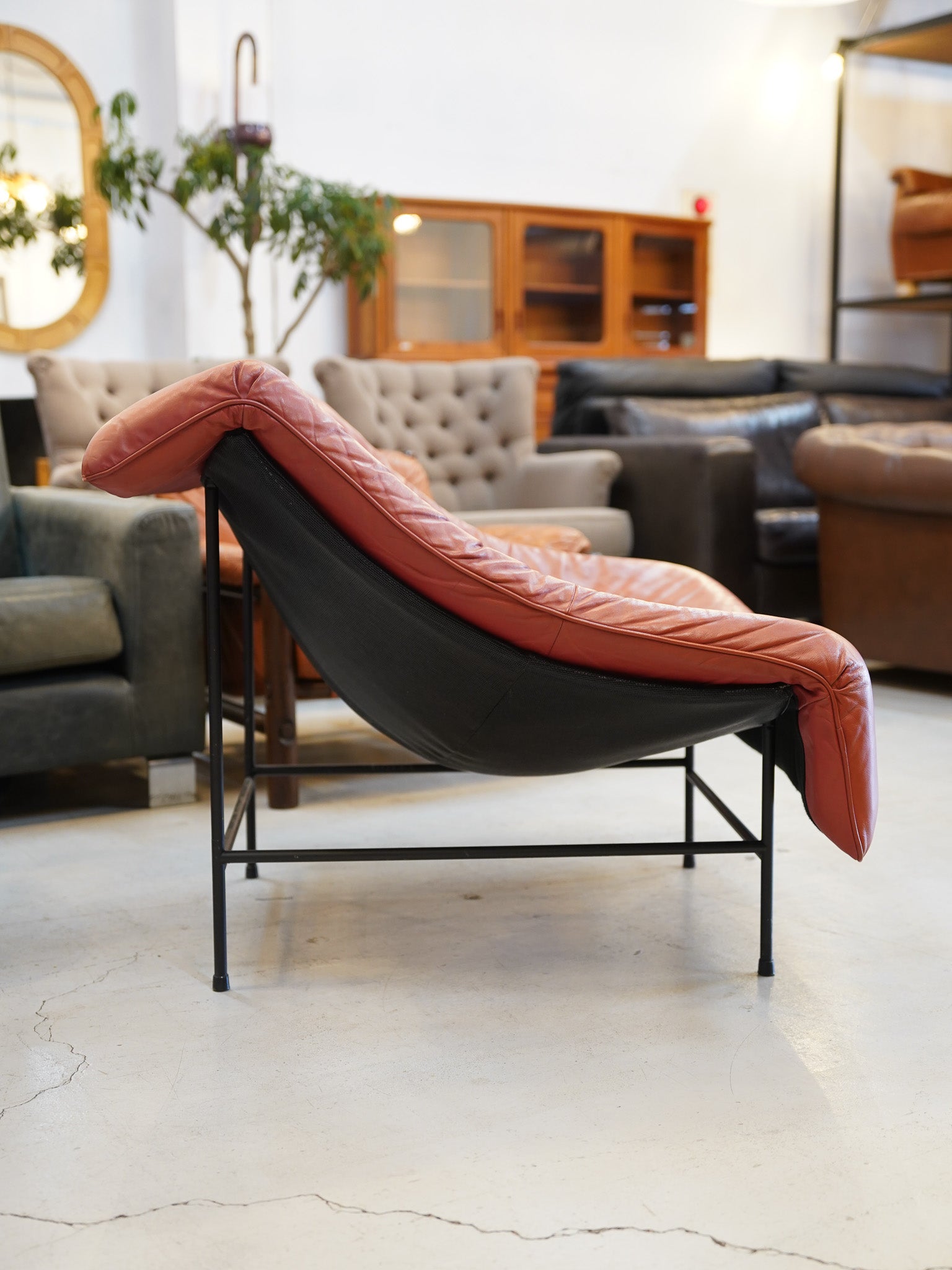華奢に見える細身のフレームでありながら、身体を包み込むような快適な座り心地を提供します。ミッドセンチュリーモダンの機能性と、革素材の温もりを兼ね備えた、特別な一点物のデザイナーズチェアです。