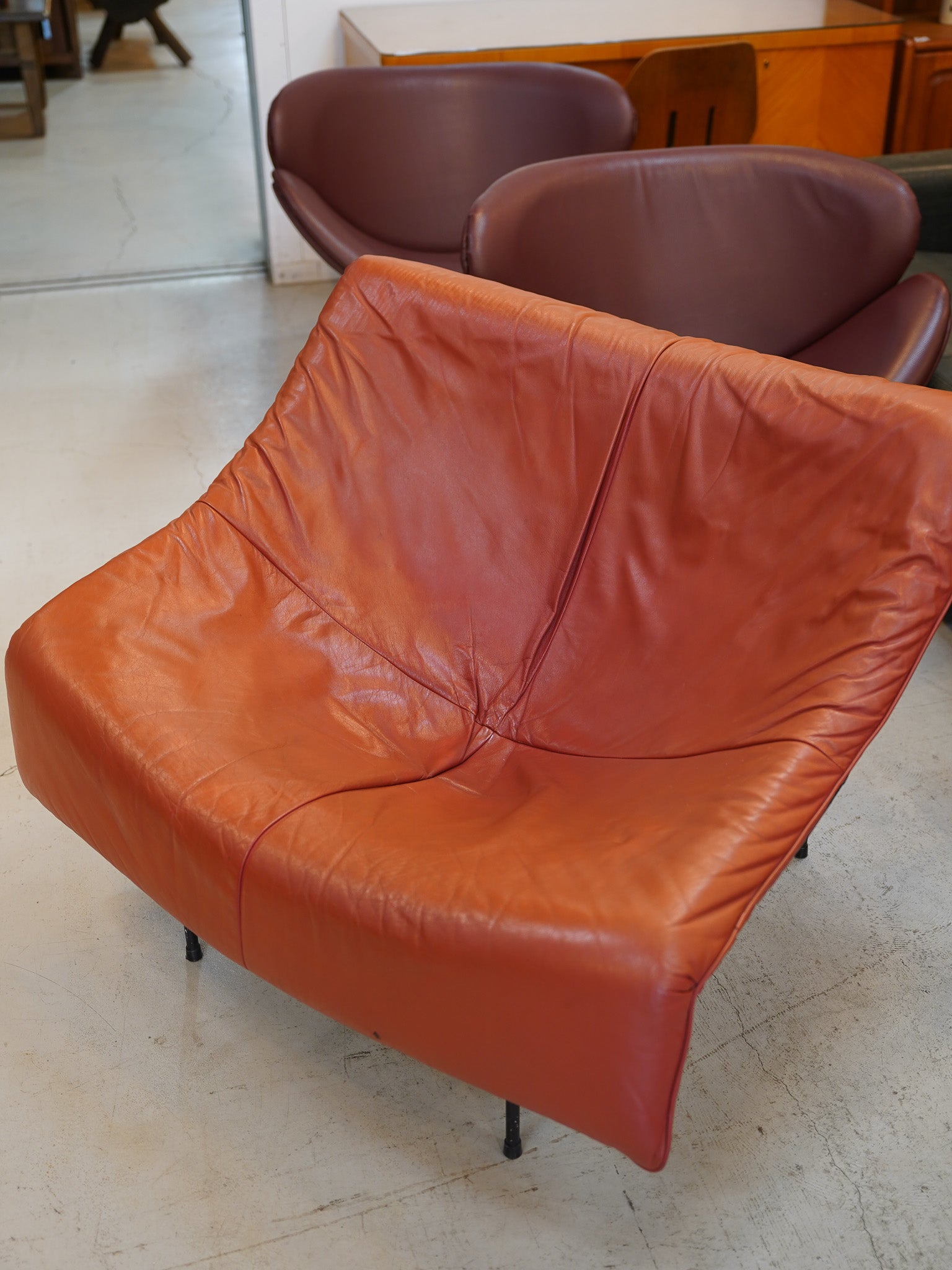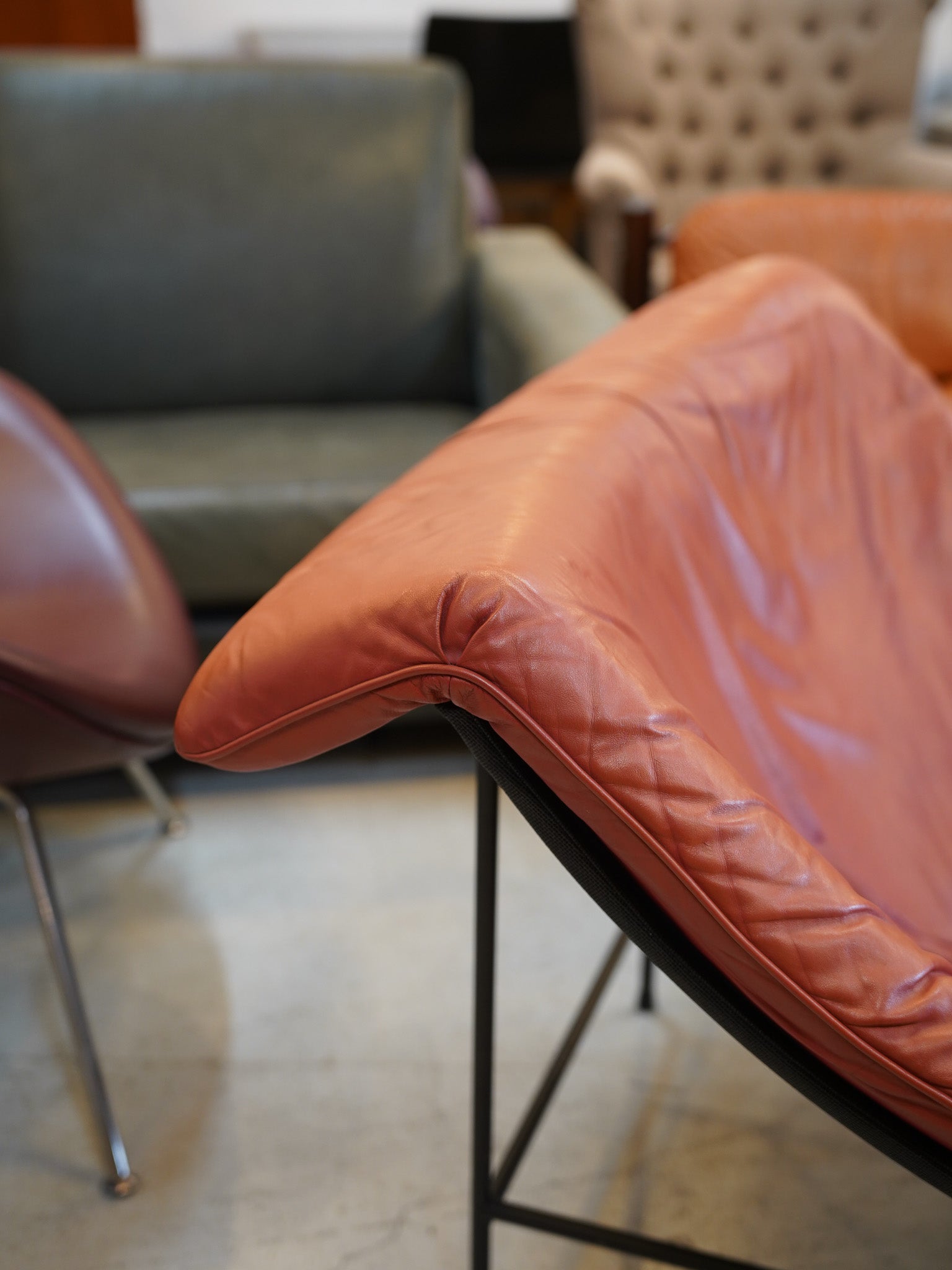 張り地には、使い込まれた上質なレザーが使用され、その豊かなシワや光沢がヴィンテージならではの深い味わいを醸し出します。