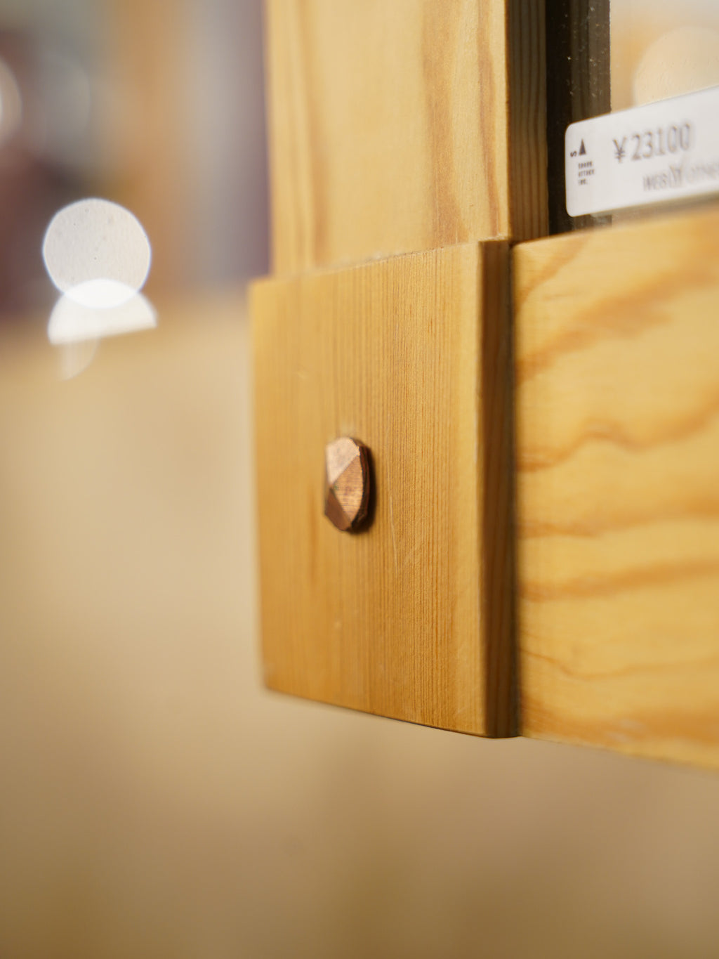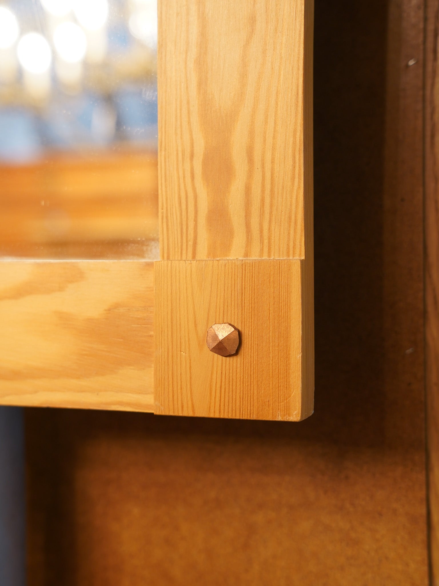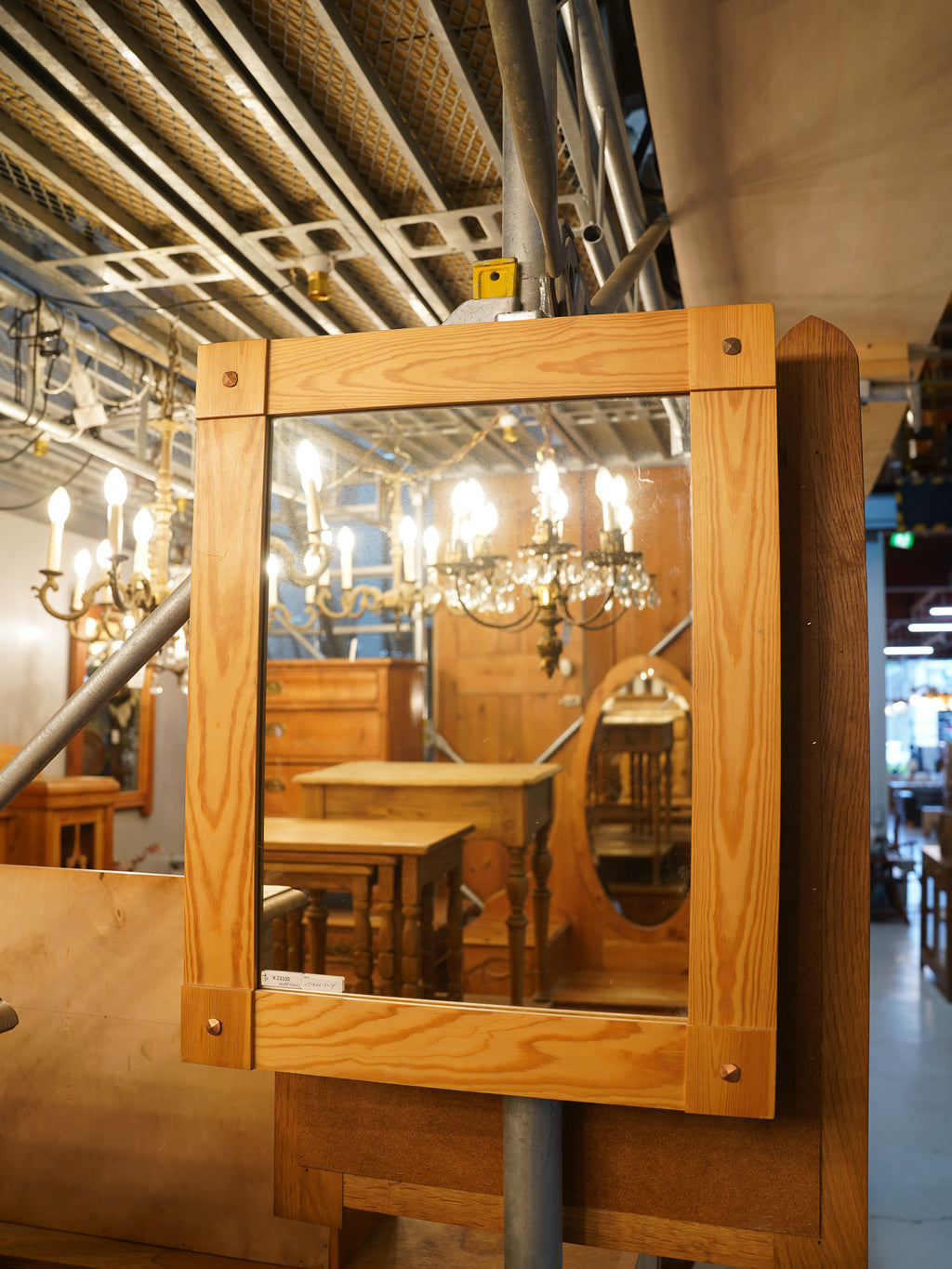 こちらのミラーは、明るい色合いのパインウッドを大胆に使用した、素朴で力強いデザインが特徴です。