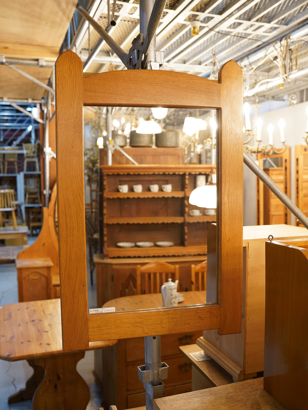 この鏡は、上部の角がわずかに尖ったアーチ状のデザインが特徴的な、縦長の木製フレームミラーです。