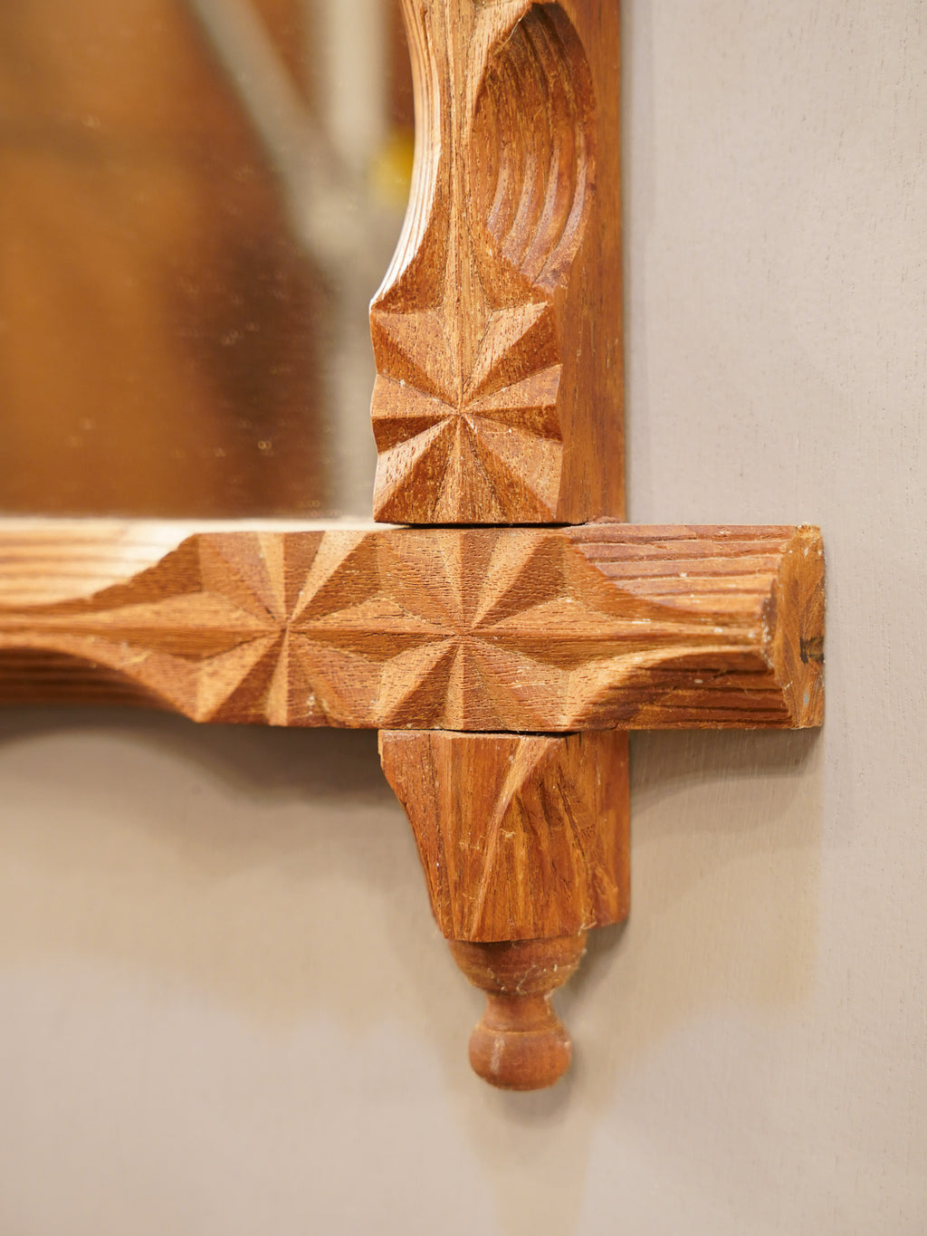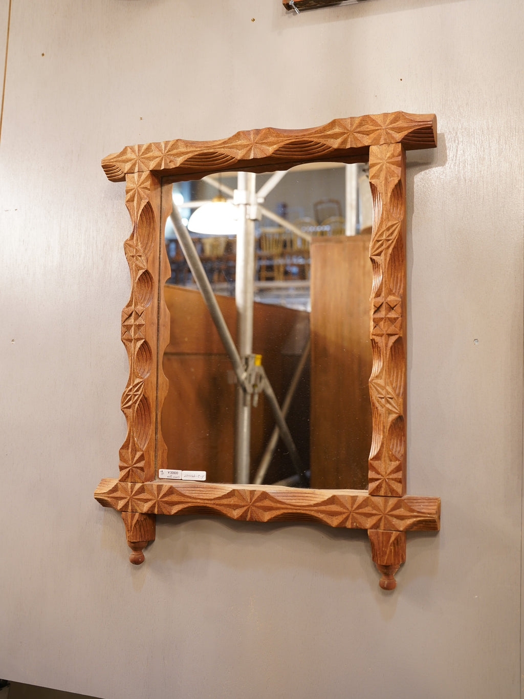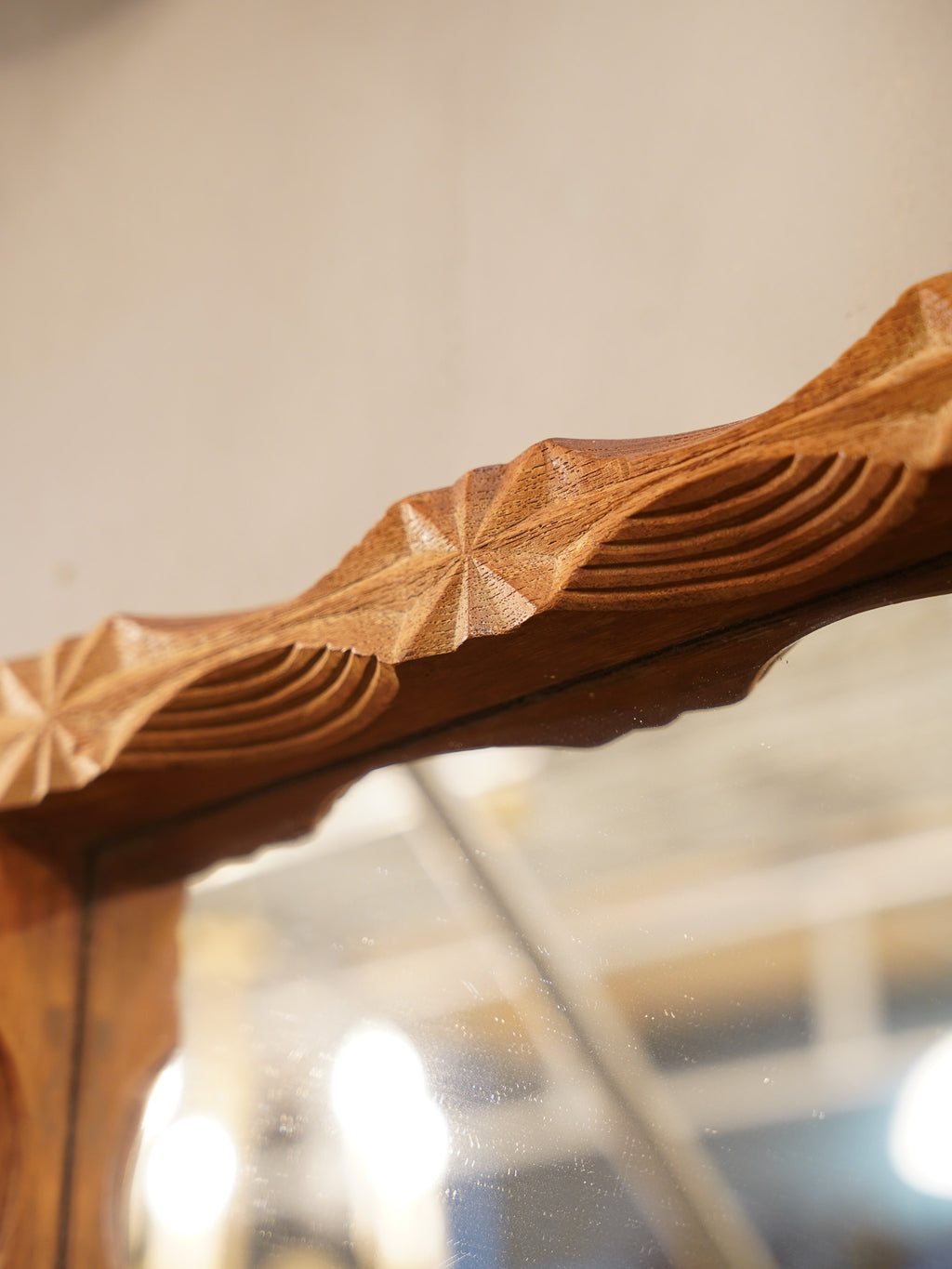 非常に緻密で個性的な木彫り装飾が施された、壁掛け用の木製フレームミラーです。