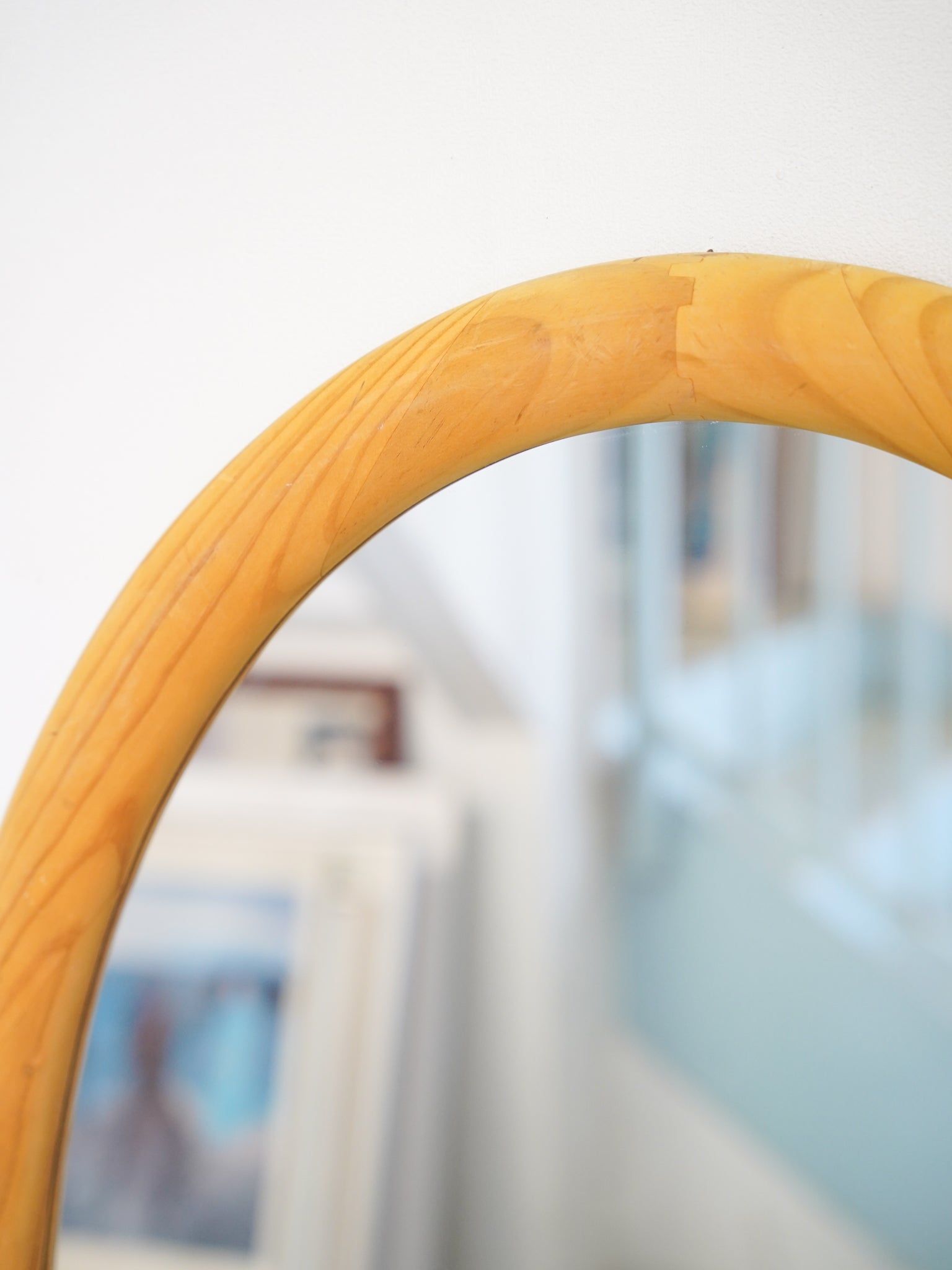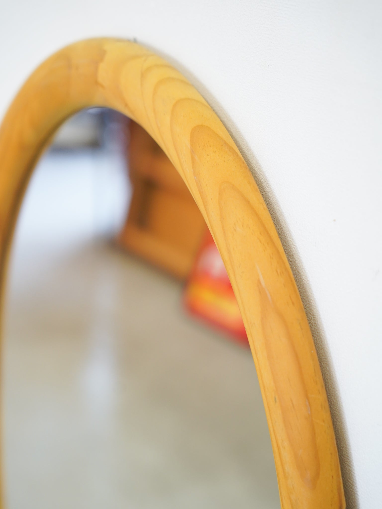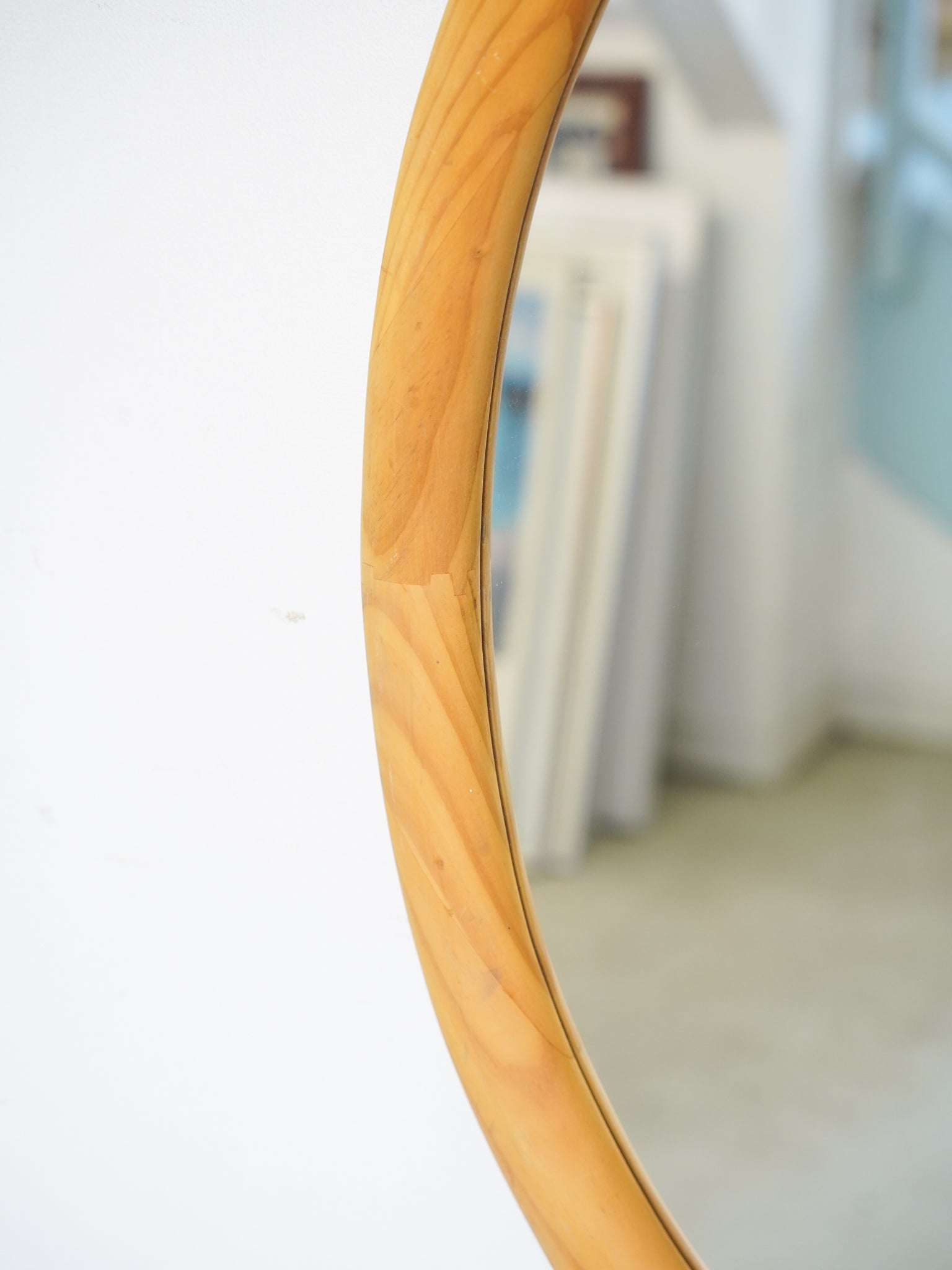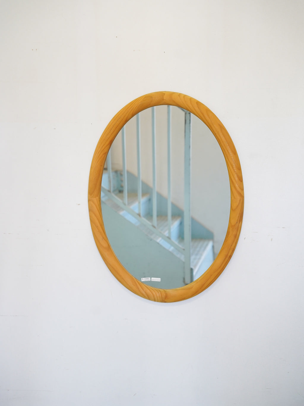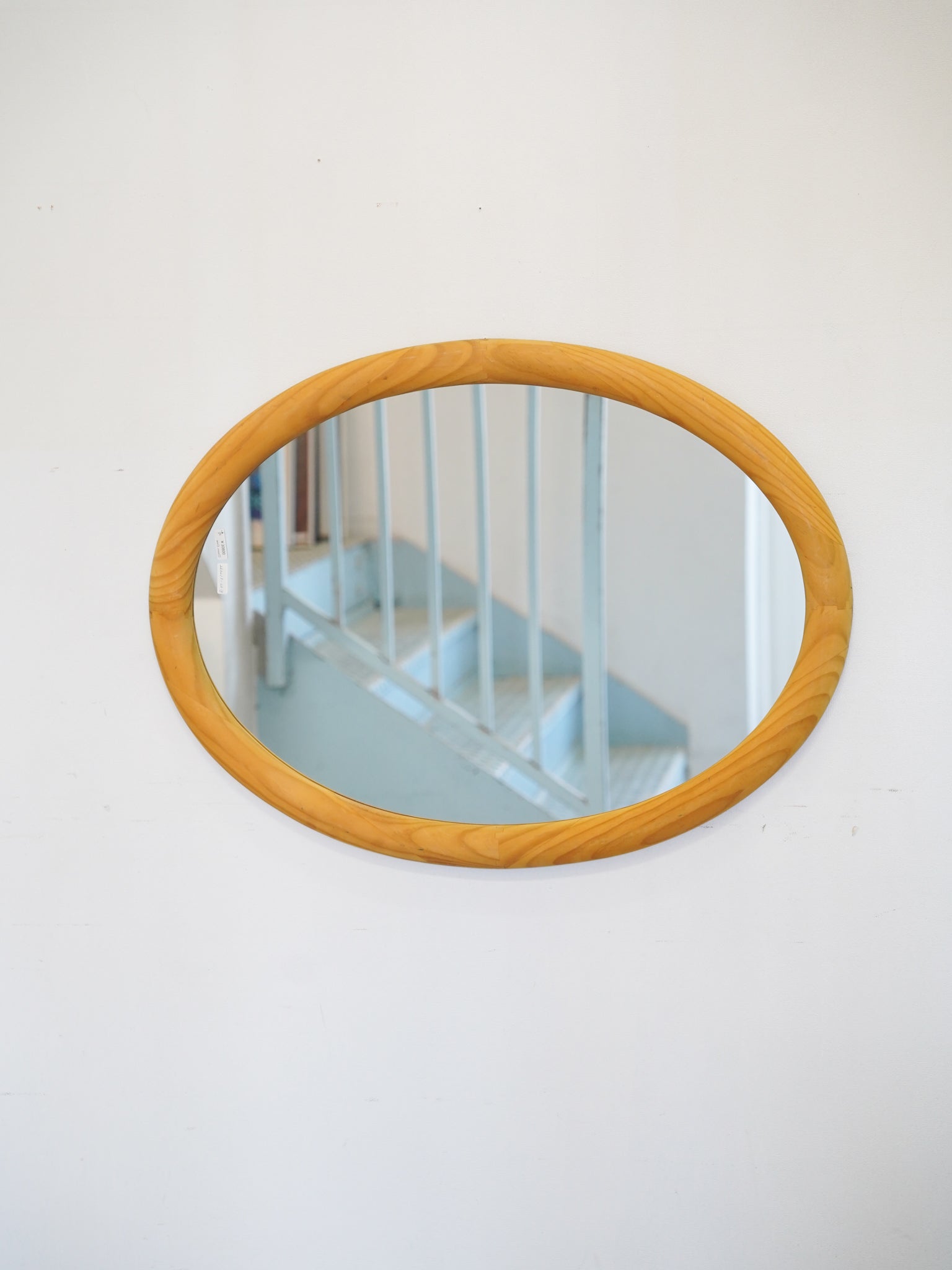 明るい色調のパイン材を使用した、ヴィンテージのオーバルウォールミラーです。