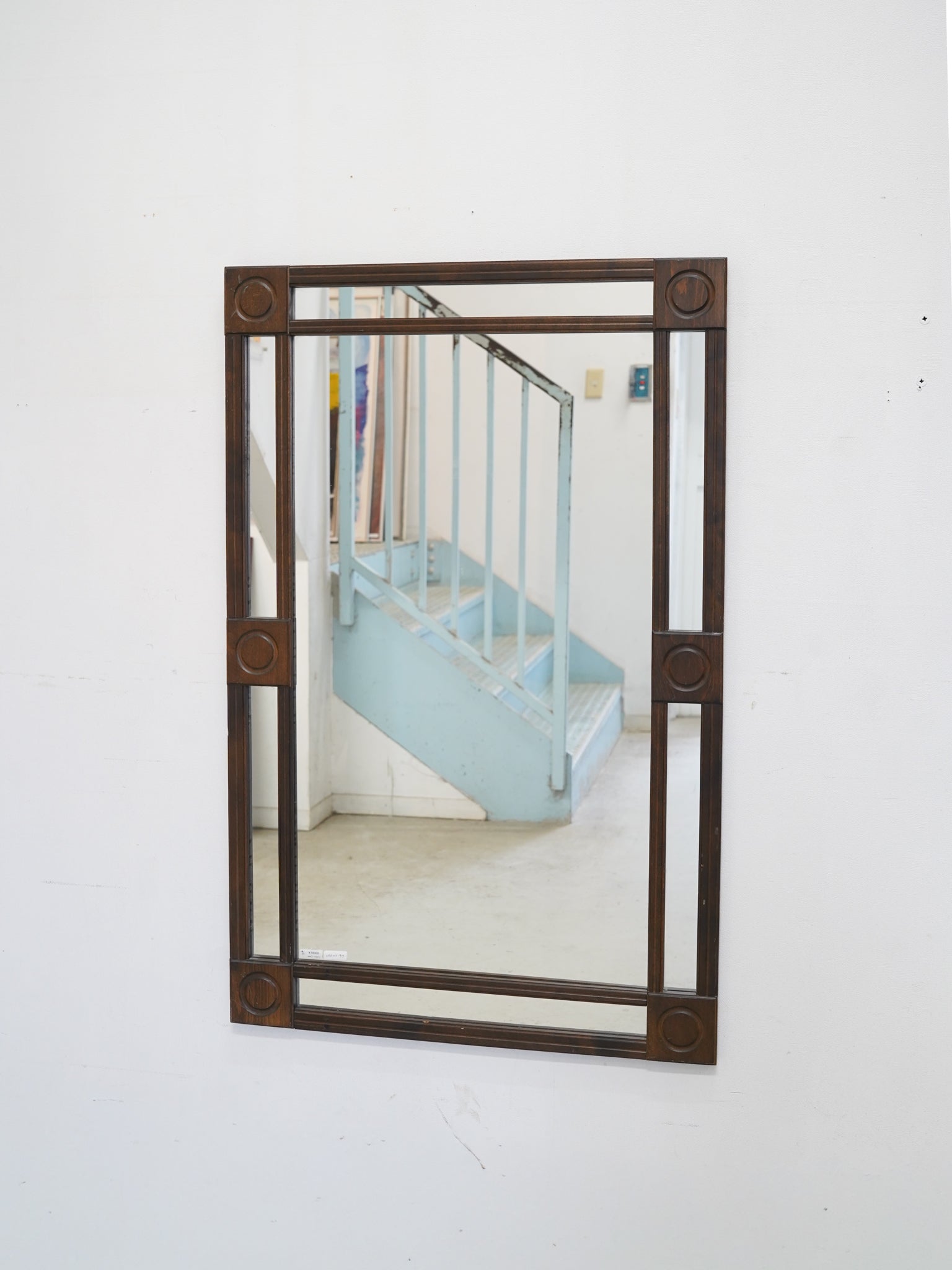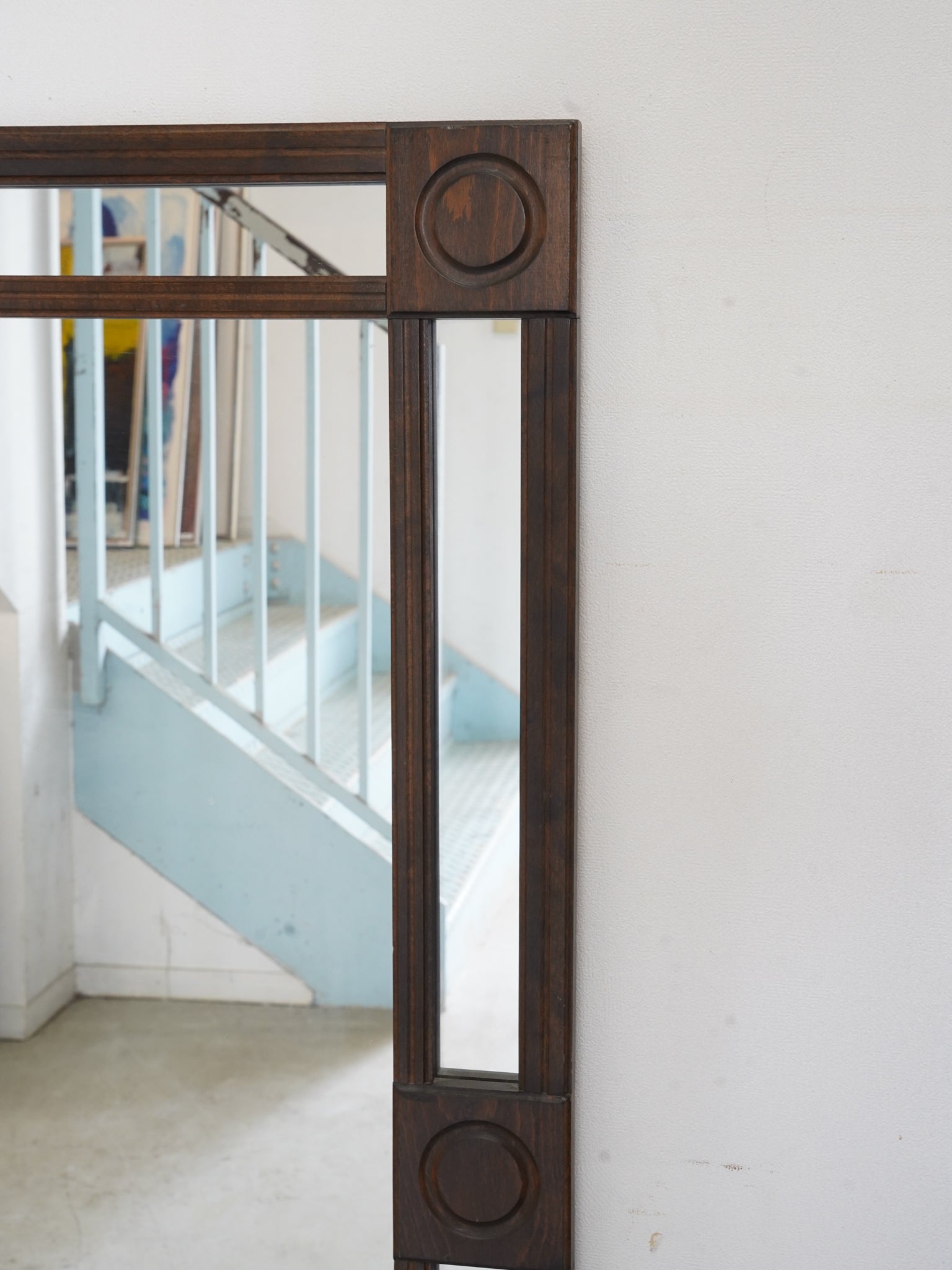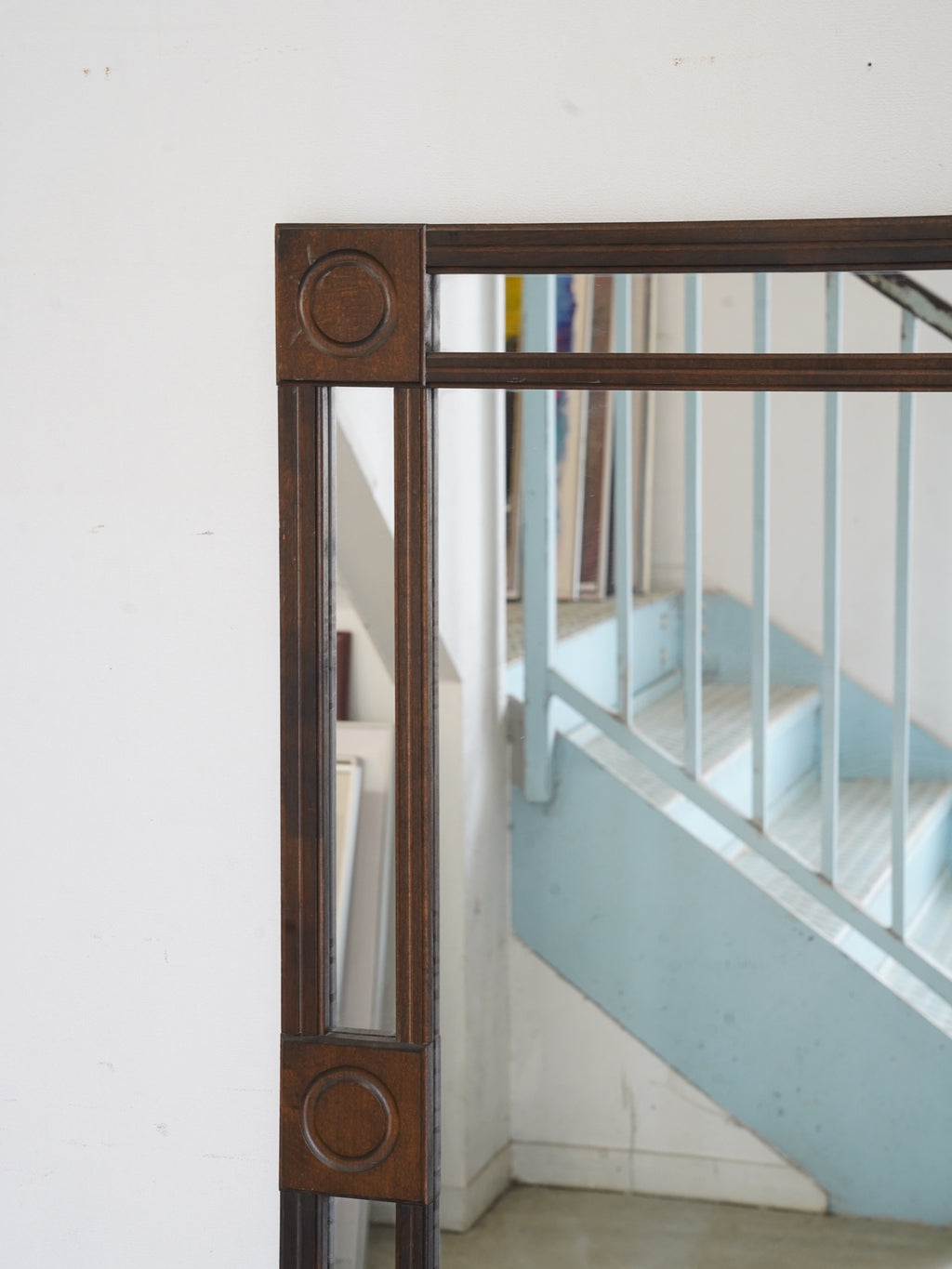 深みのある落ち着いた色調が魅力的な、ヴィンテージの長方形ウォールミラーです。フレームの四隅とサイドに配された円形の彫り込み装飾が、直線的なフォルムにクラシカルなリズムを与えています。