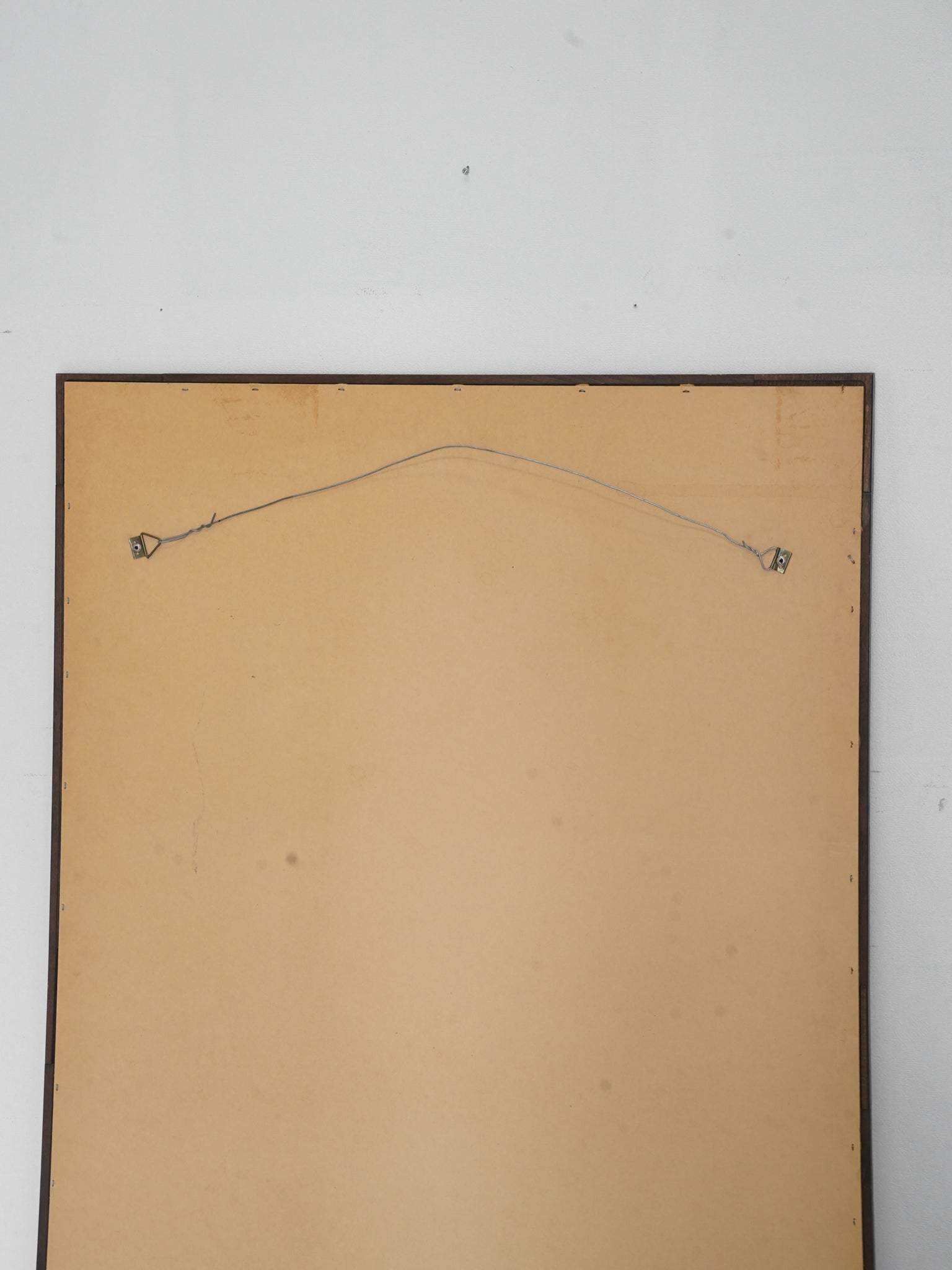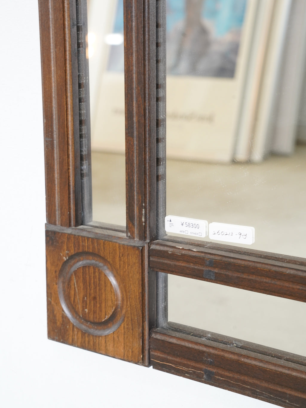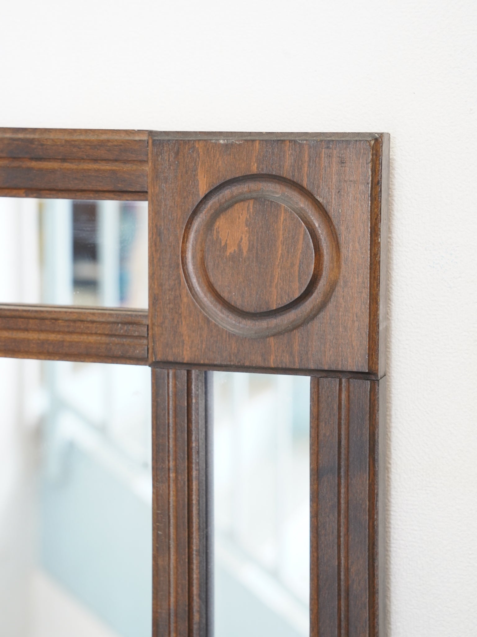 深みのある落ち着いた色調が魅力的な、ヴィンテージの長方形ウォールミラーです。フレームの四隅とサイドに配された円形の彫り込み装飾が、直線的なフォルムにクラシカルなリズムを与えています。