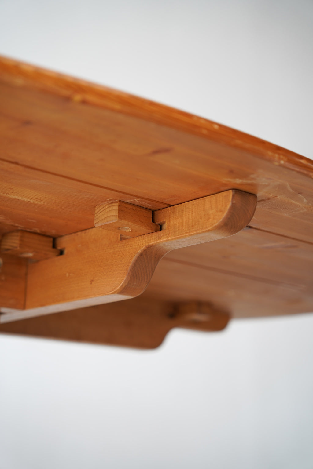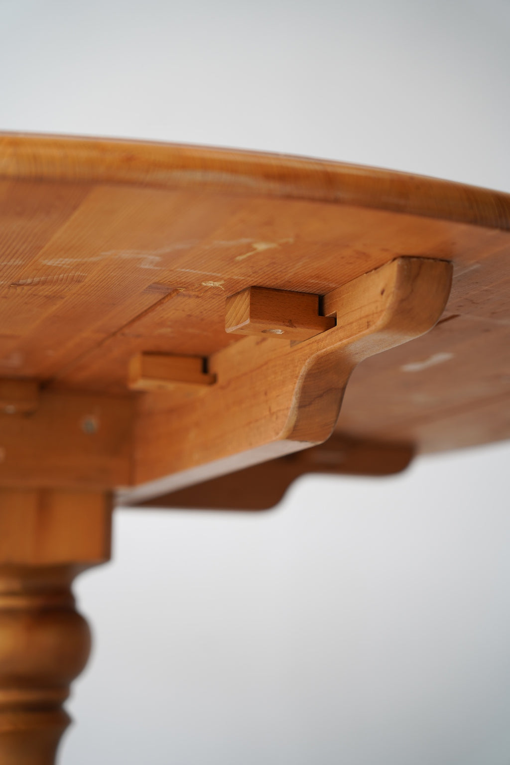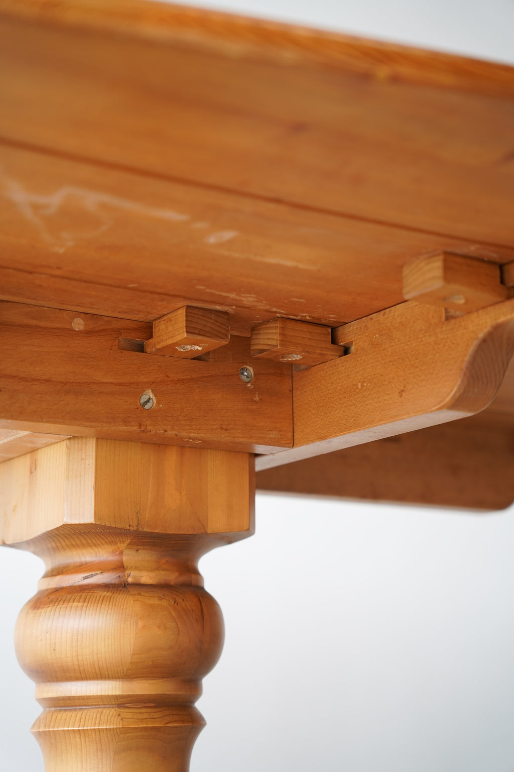 明るい色合いと美しい木目が魅力のパインウッドを使用した、クラシックなダイニングテーブル。
