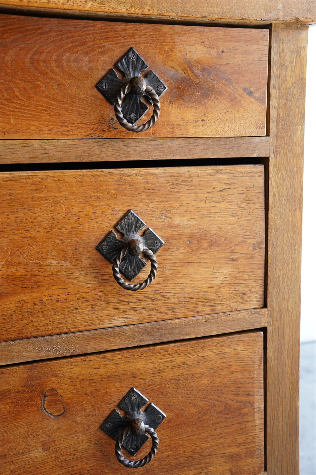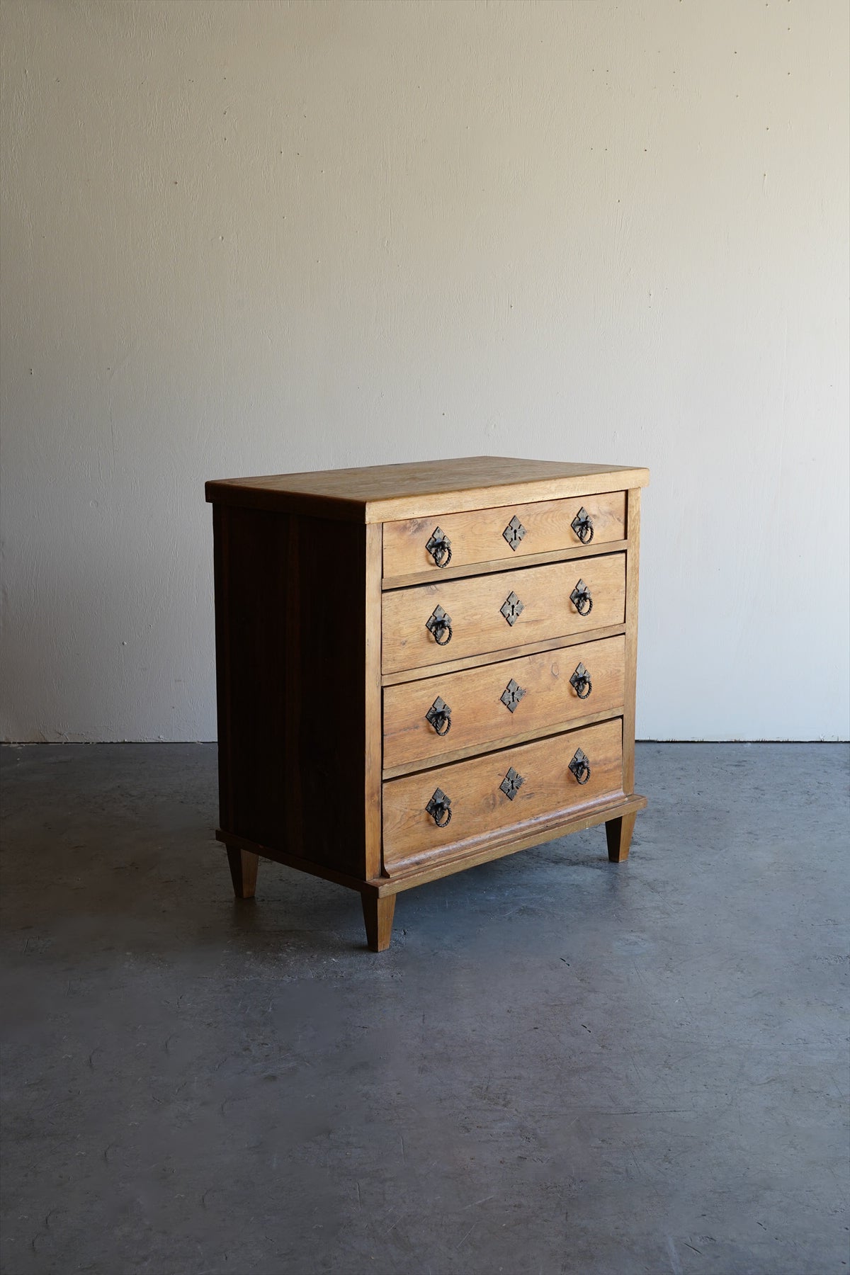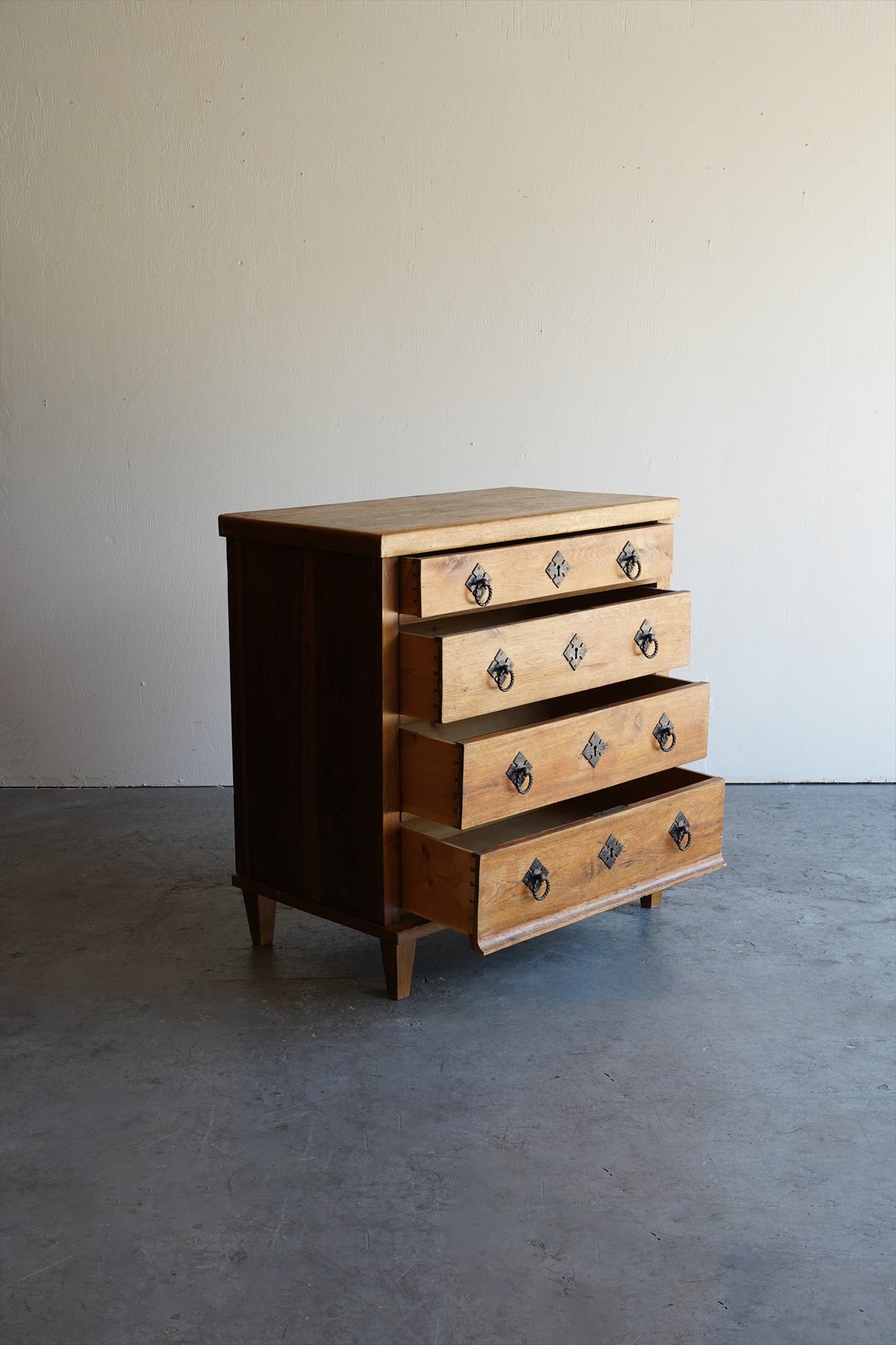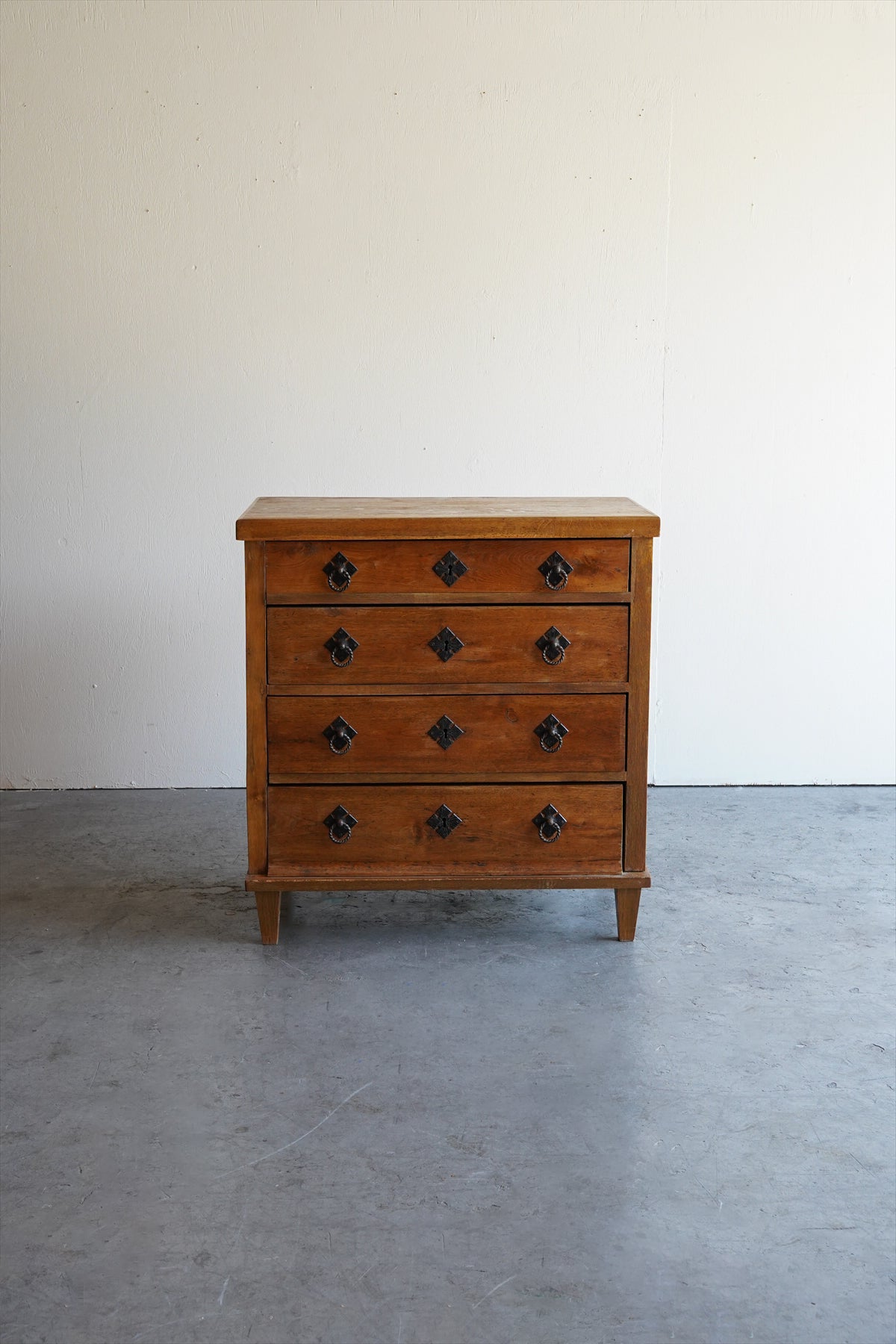 引出しの取っ手には、アンティーク調の金具があしらわれ、菱形の装飾プレートと相まって、素朴でありながらも洗練された雰囲気を醸し出しています。