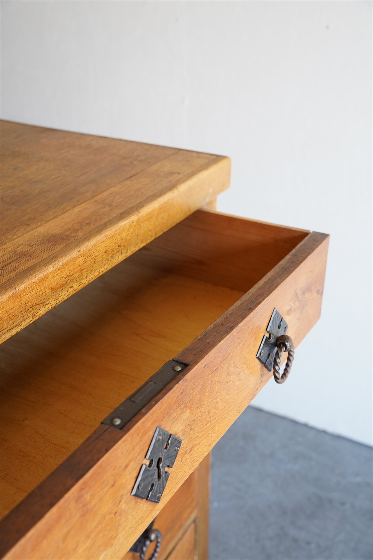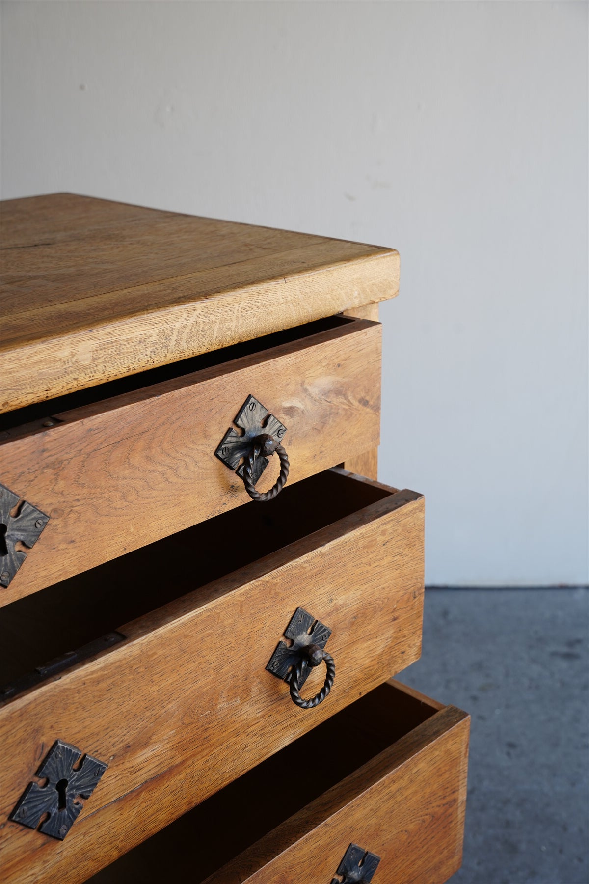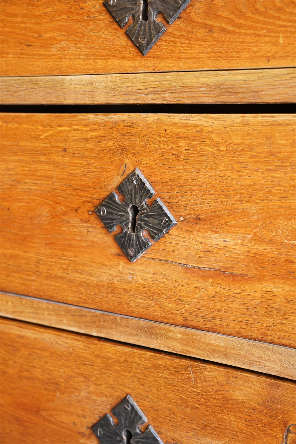引出しの取っ手には、アンティーク調の金具があしらわれ、菱形の装飾プレートと相まって、素朴でありながらも洗練された雰囲気を醸し出しています。