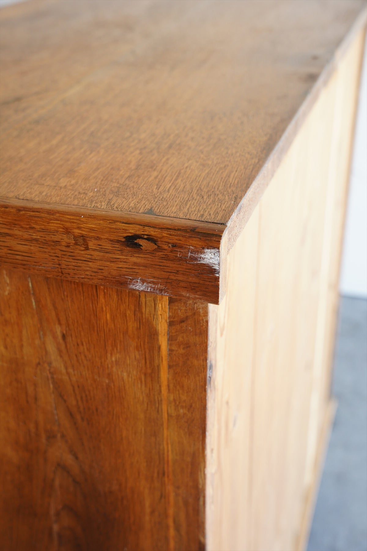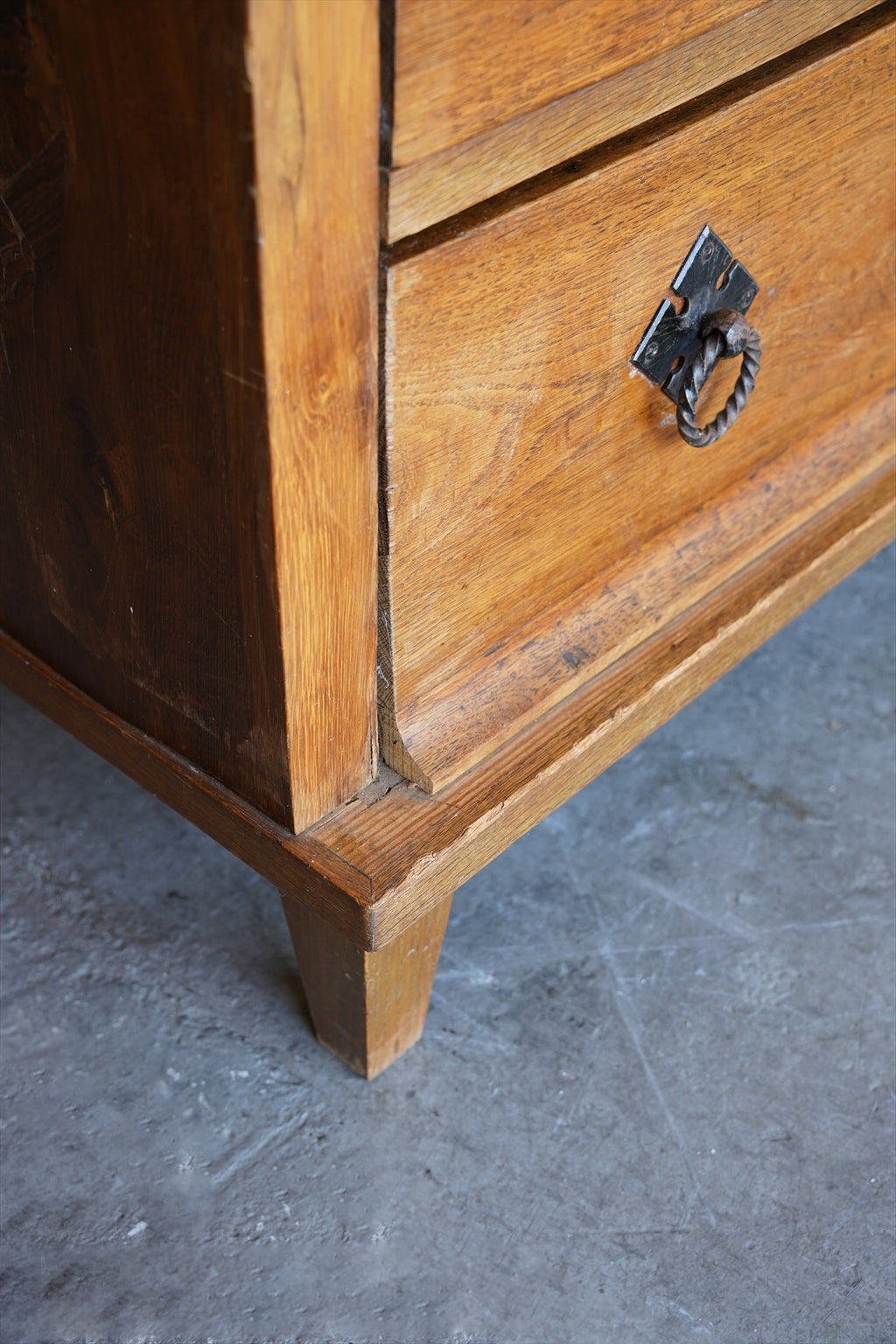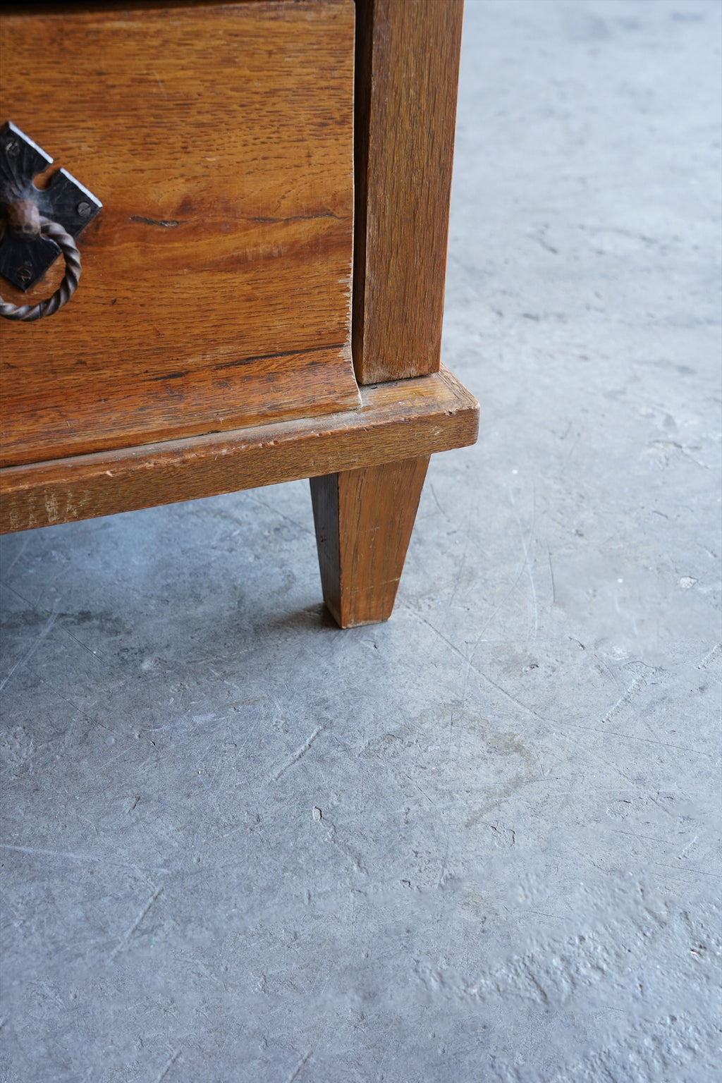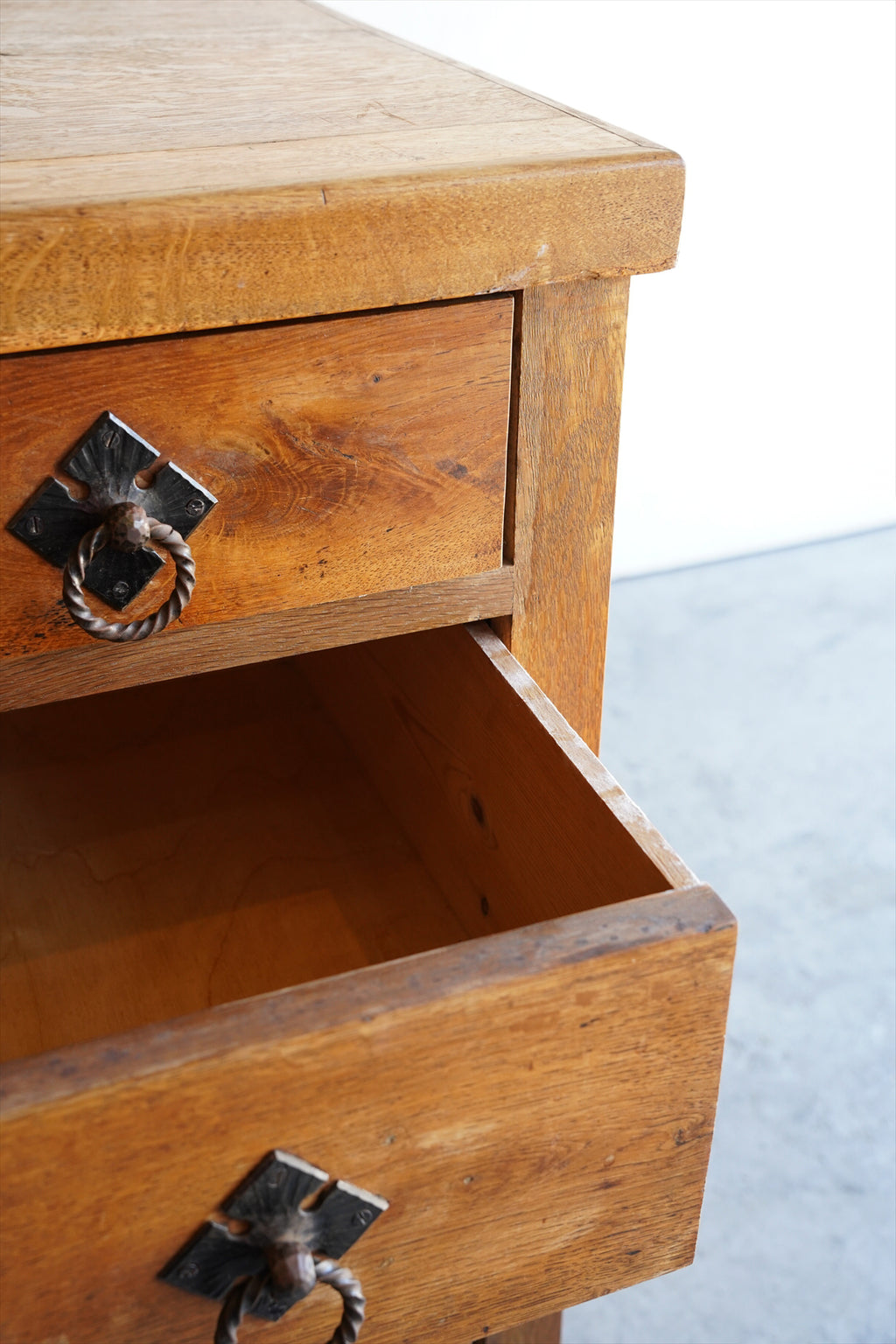 引出しの取っ手には、アンティーク調の金具があしらわれ、菱形の装飾プレートと相まって、素朴でありながらも洗練された雰囲気を醸し出しています。
