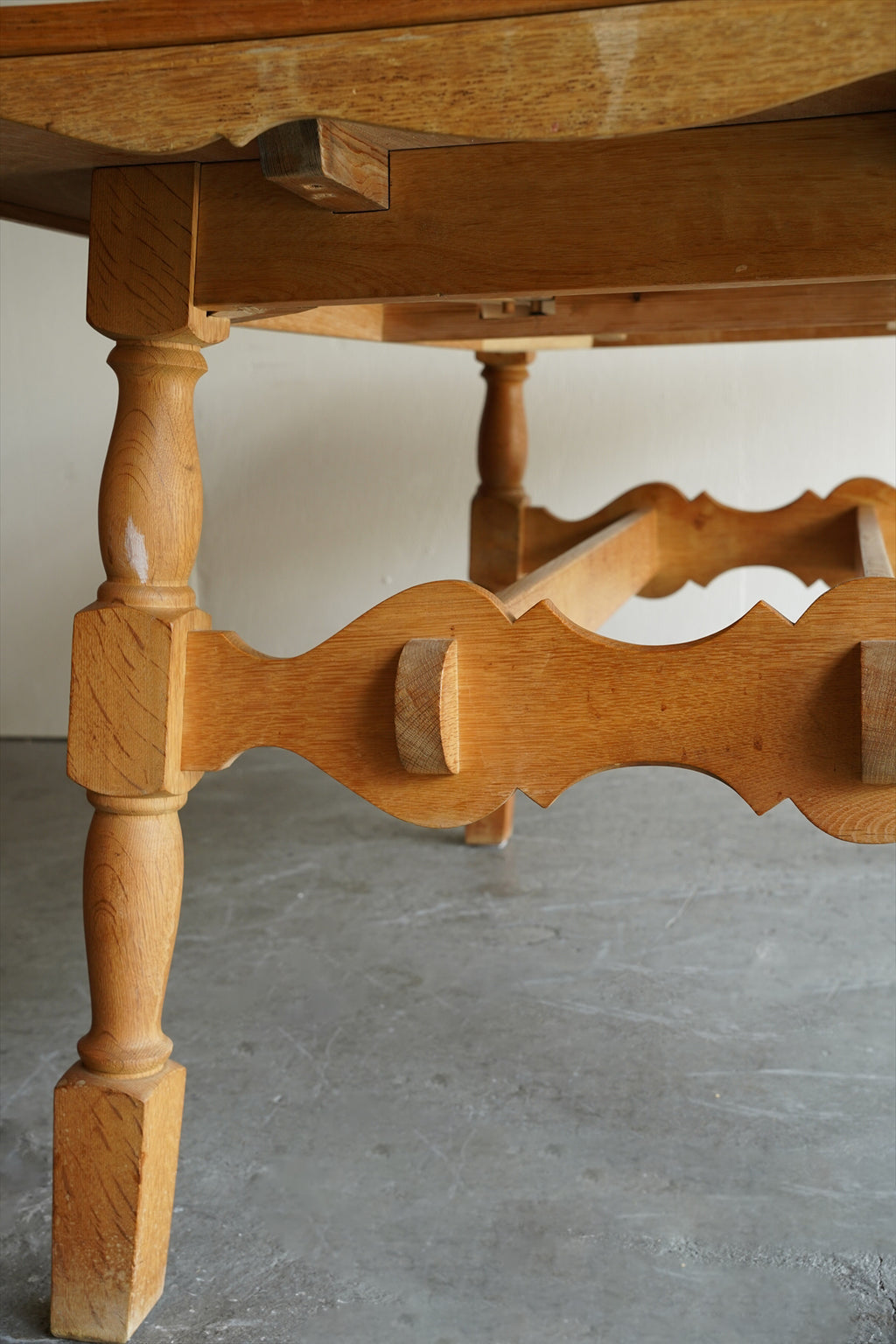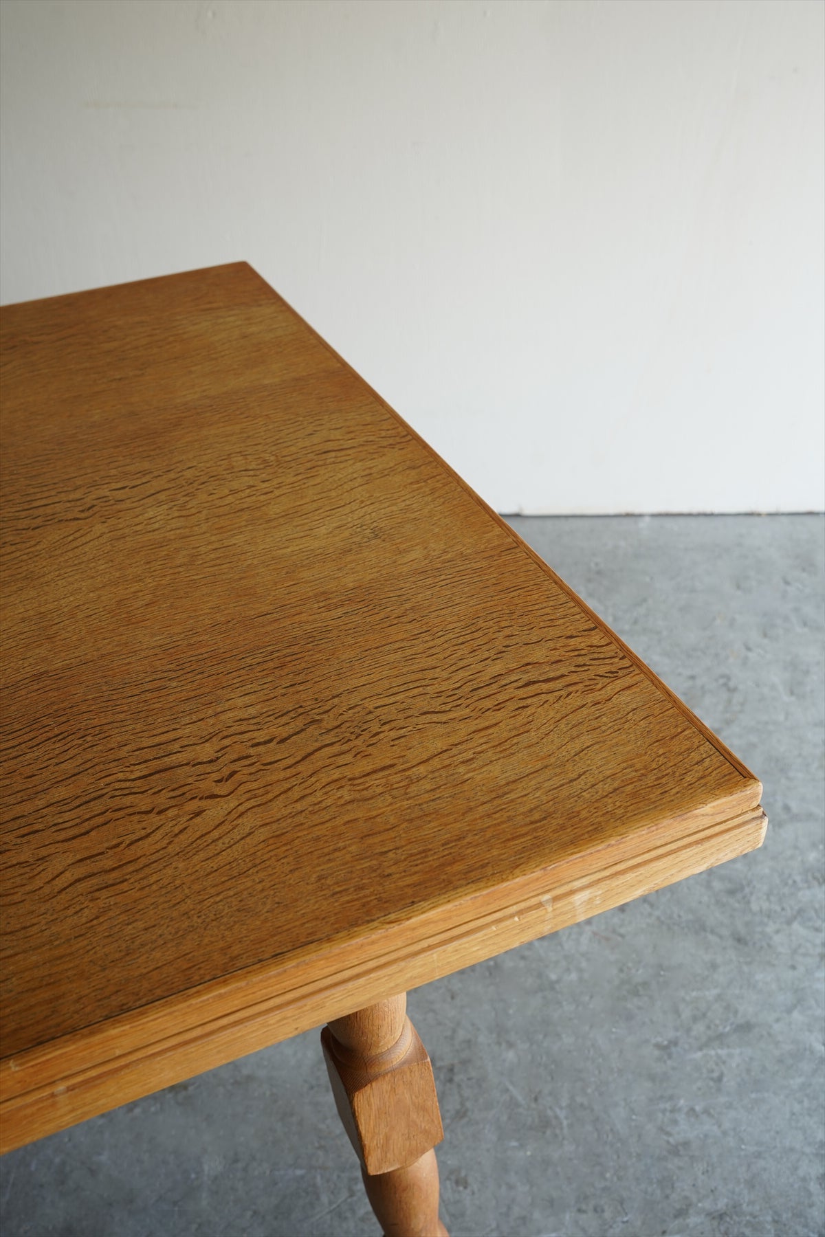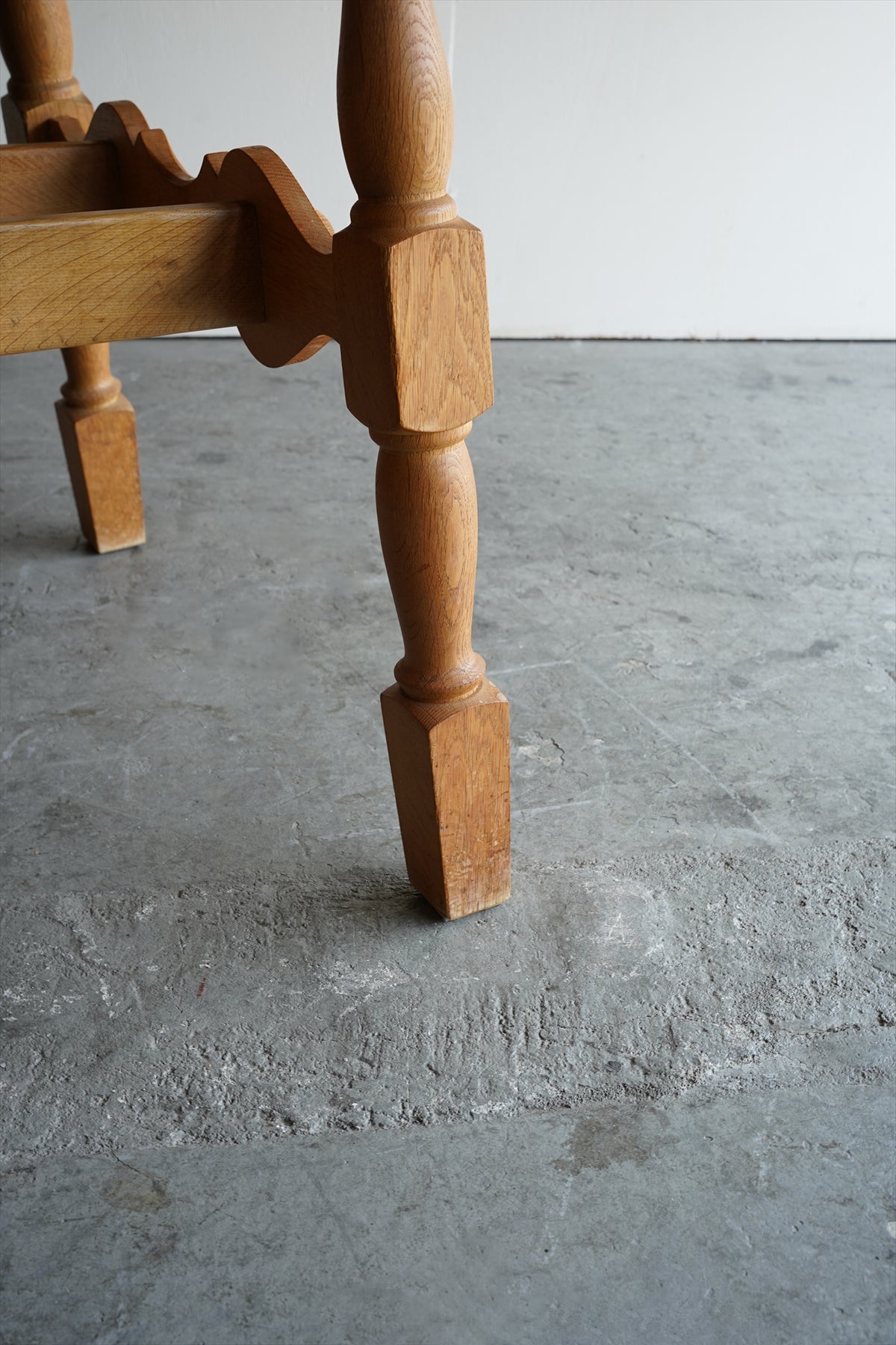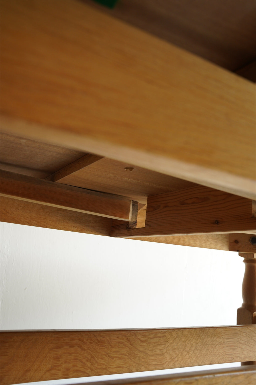 天板の縁は丁寧に面取りされており、脚部の装飾的なデザインと相まって、シンプルながらも個性的な表情を見せてくれます。オーク材特有の力強い木目と、落ち着いた色合いが、ダイニング空間に温かく上品な雰囲気をもたらします。