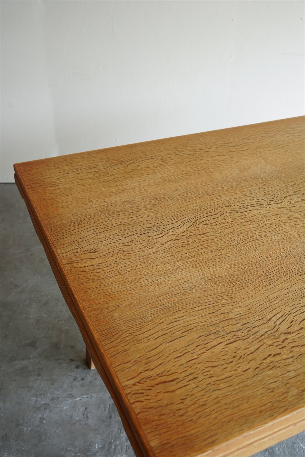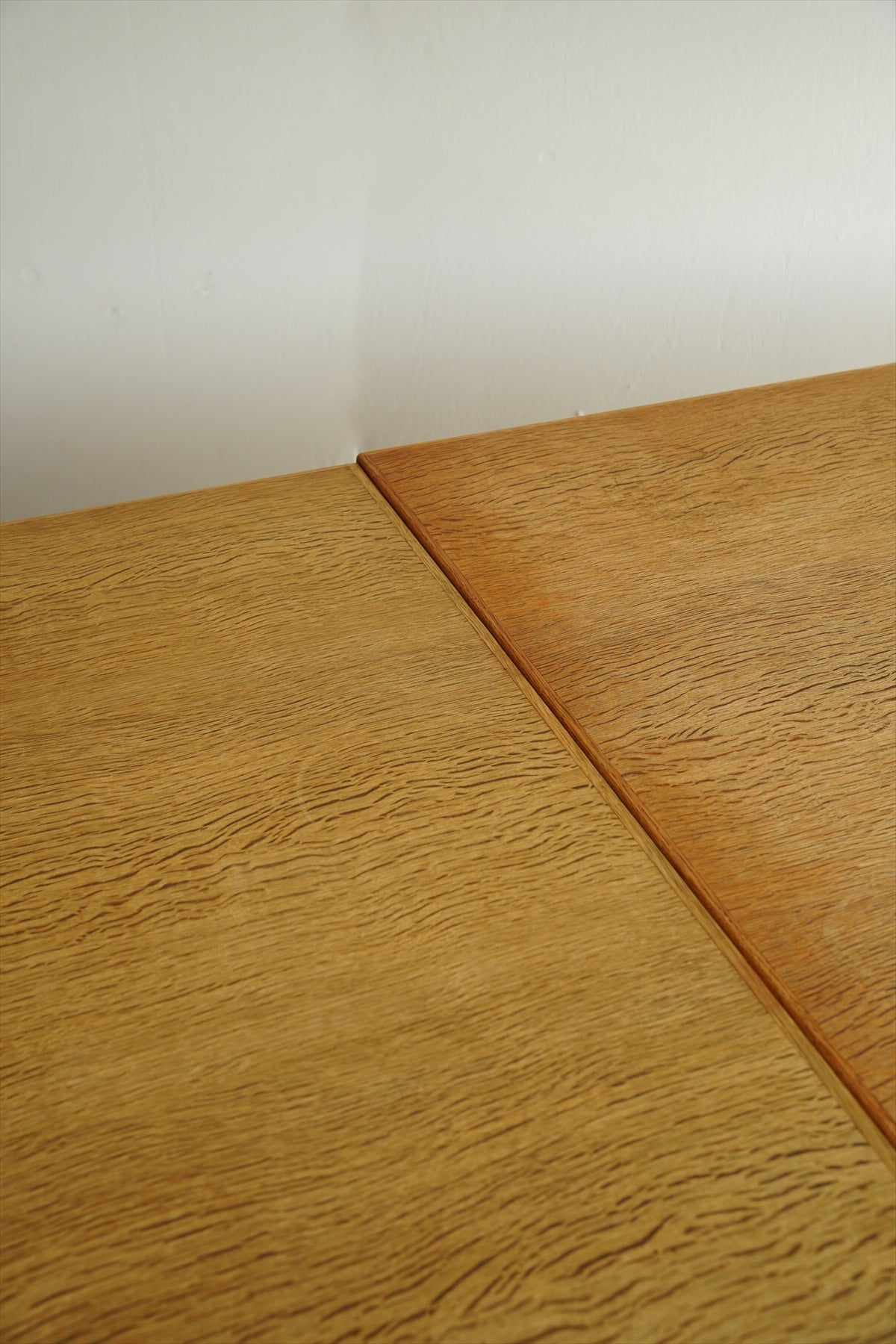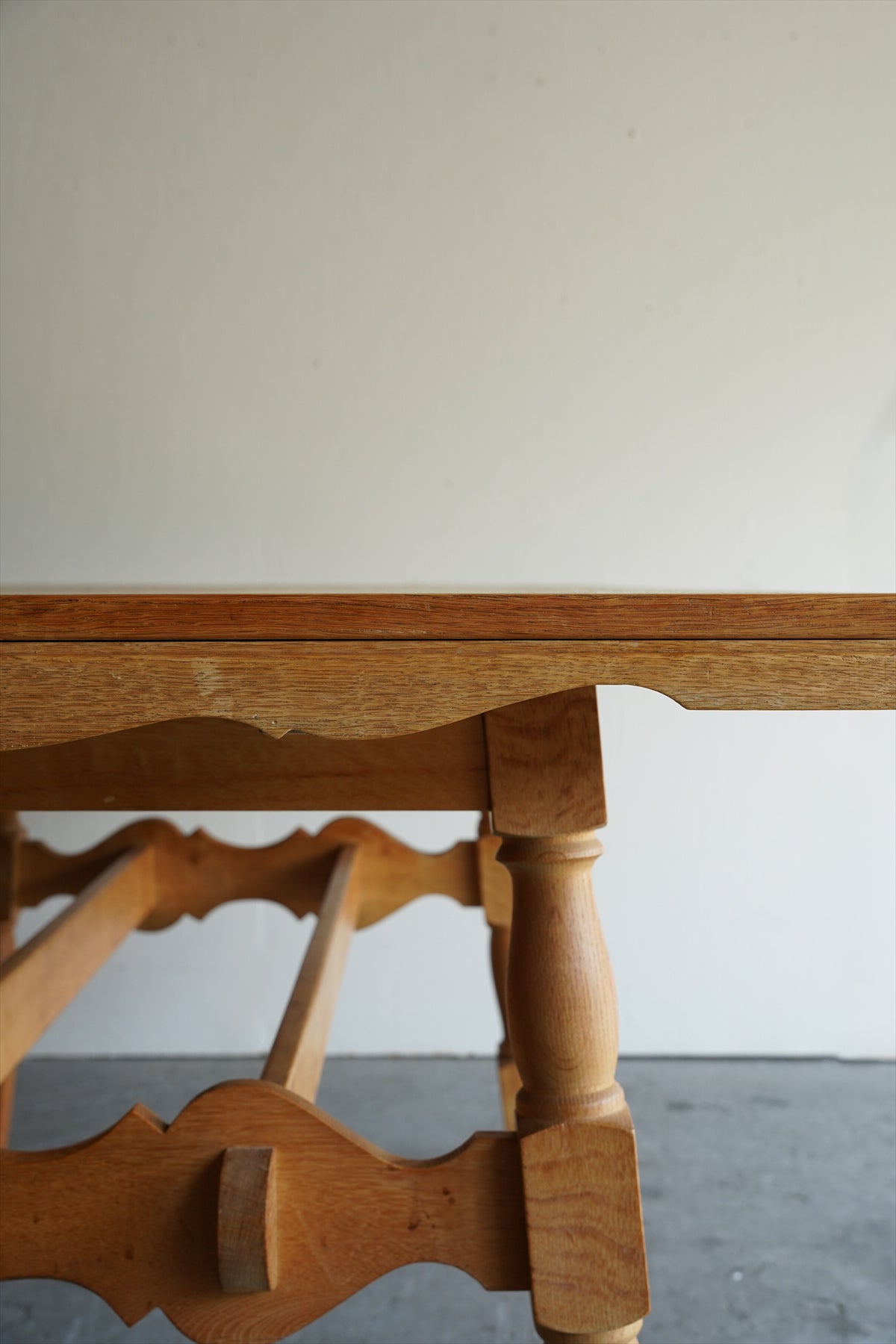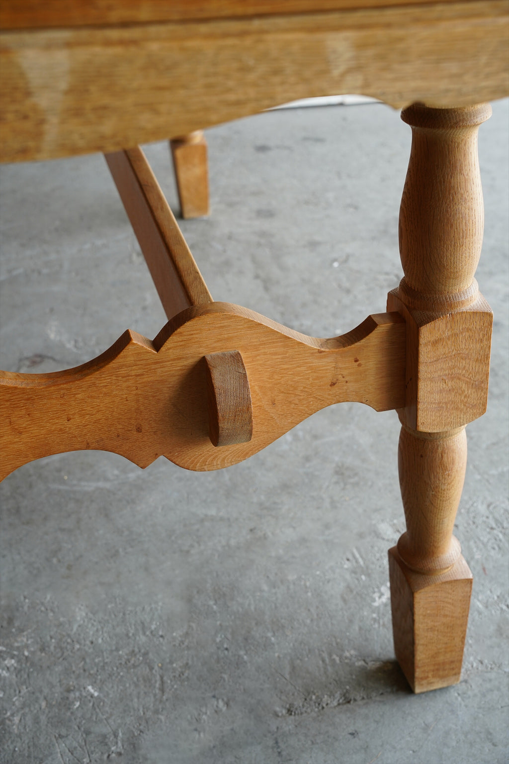 天板の縁は丁寧に面取りされており、脚部の装飾的なデザインと相まって、シンプルながらも個性的な表情を見せてくれます。オーク材特有の力強い木目と、落ち着いた色合いが、ダイニング空間に温かく上品な雰囲気をもたらします。