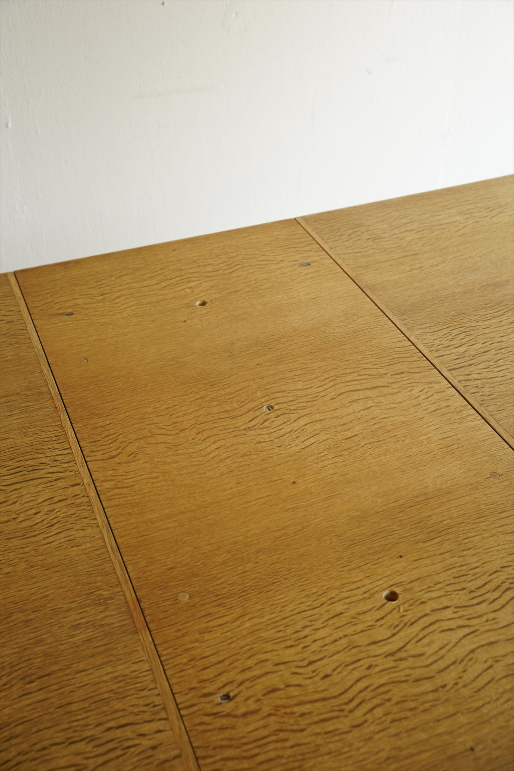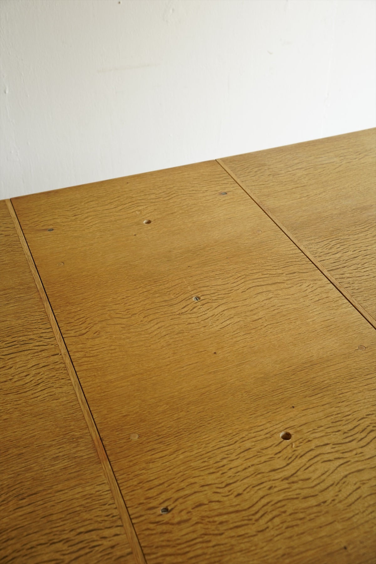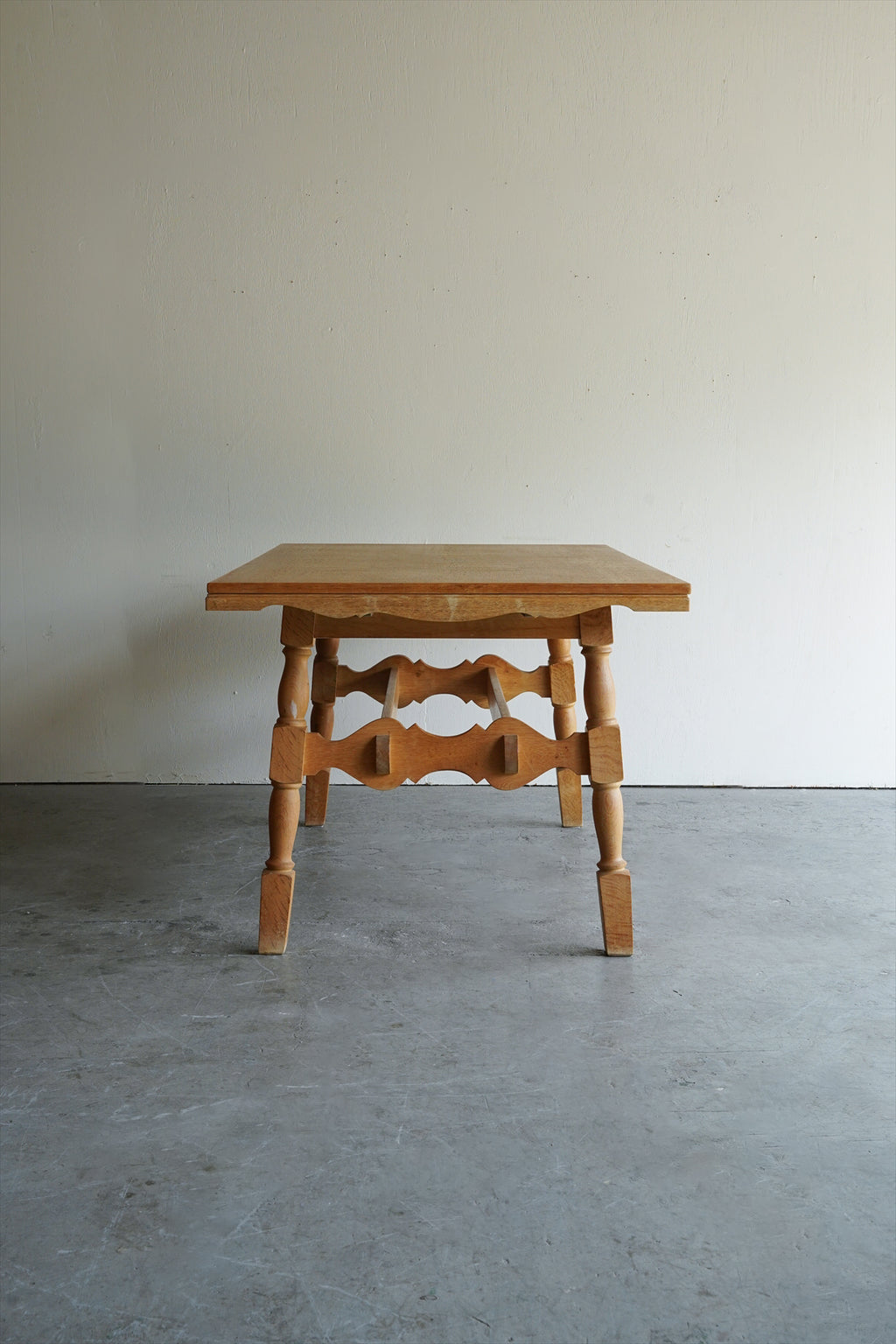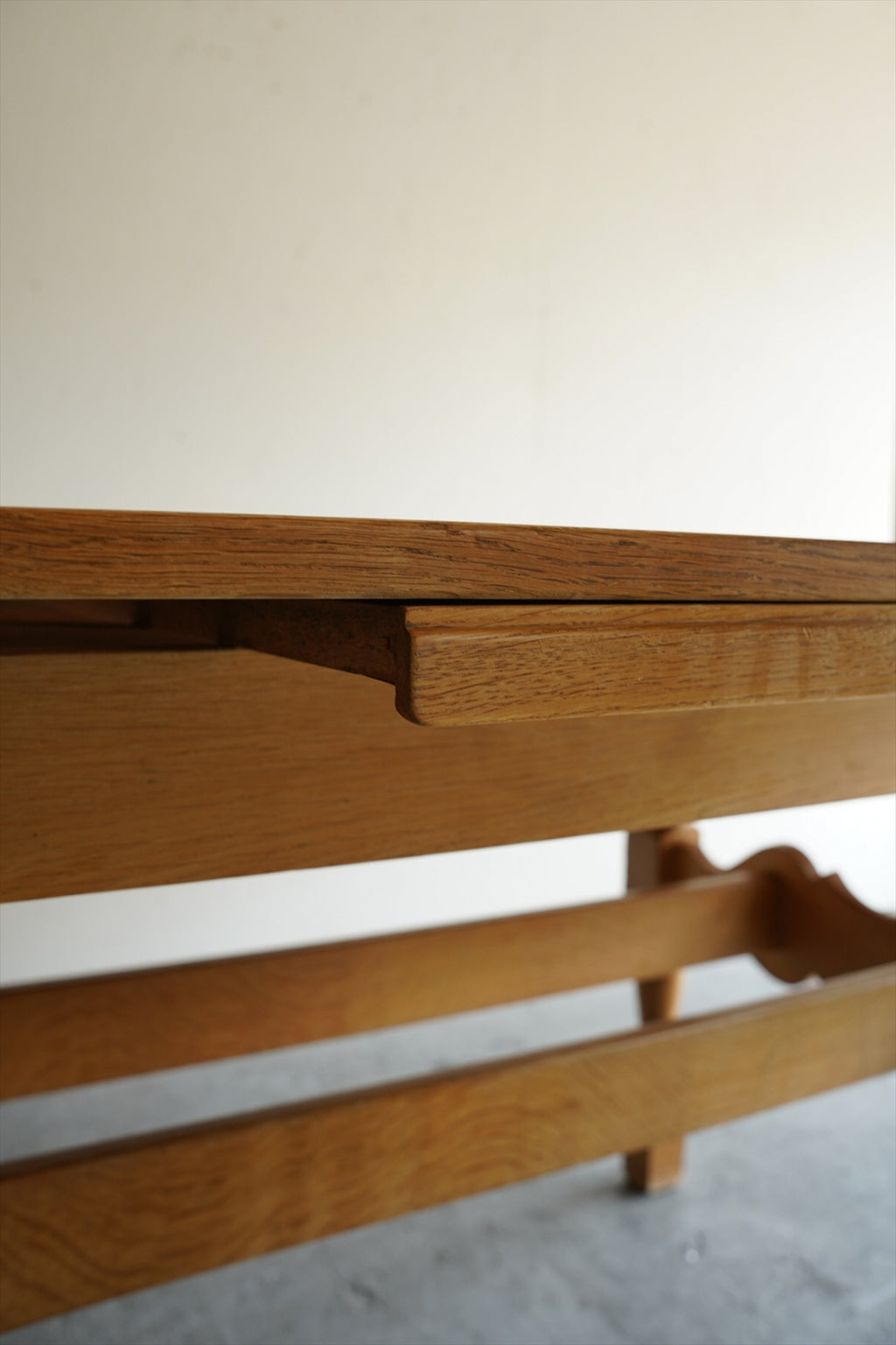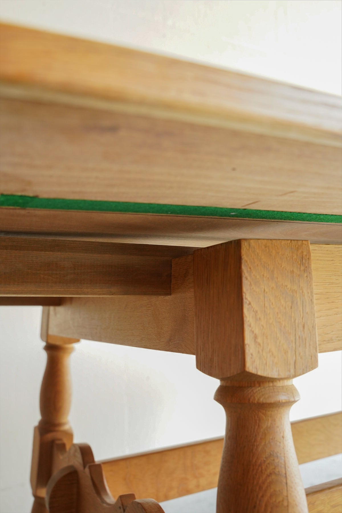 天板の縁は丁寧に面取りされており、脚部の装飾的なデザインと相まって、シンプルながらも個性的な表情を見せてくれます。オーク材特有の力強い木目と、落ち着いた色合いが、ダイニング空間に温かく上品な雰囲気をもたらします。