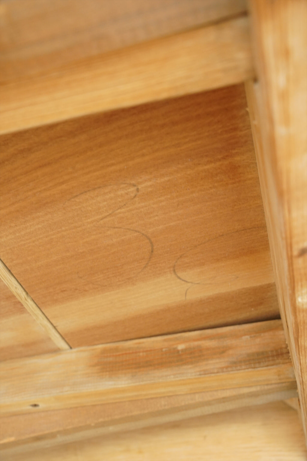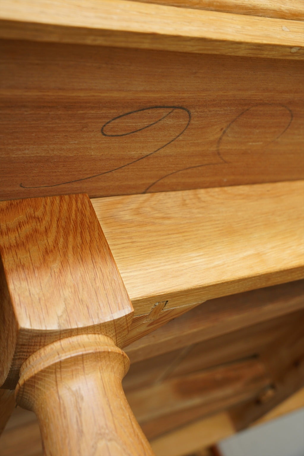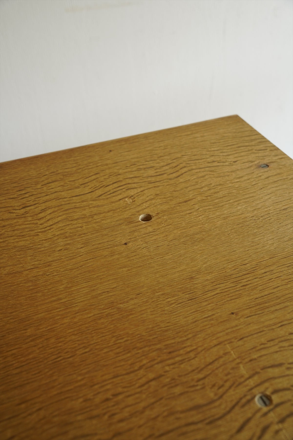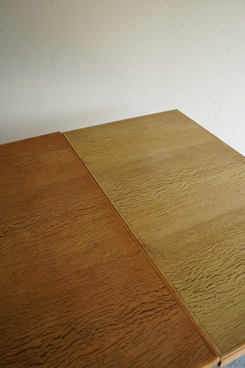 天板の縁は丁寧に面取りされており、脚部の装飾的なデザインと相まって、シンプルながらも個性的な表情を見せてくれます。オーク材特有の力強い木目と、落ち着いた色合いが、ダイニング空間に温かく上品な雰囲気をもたらします。