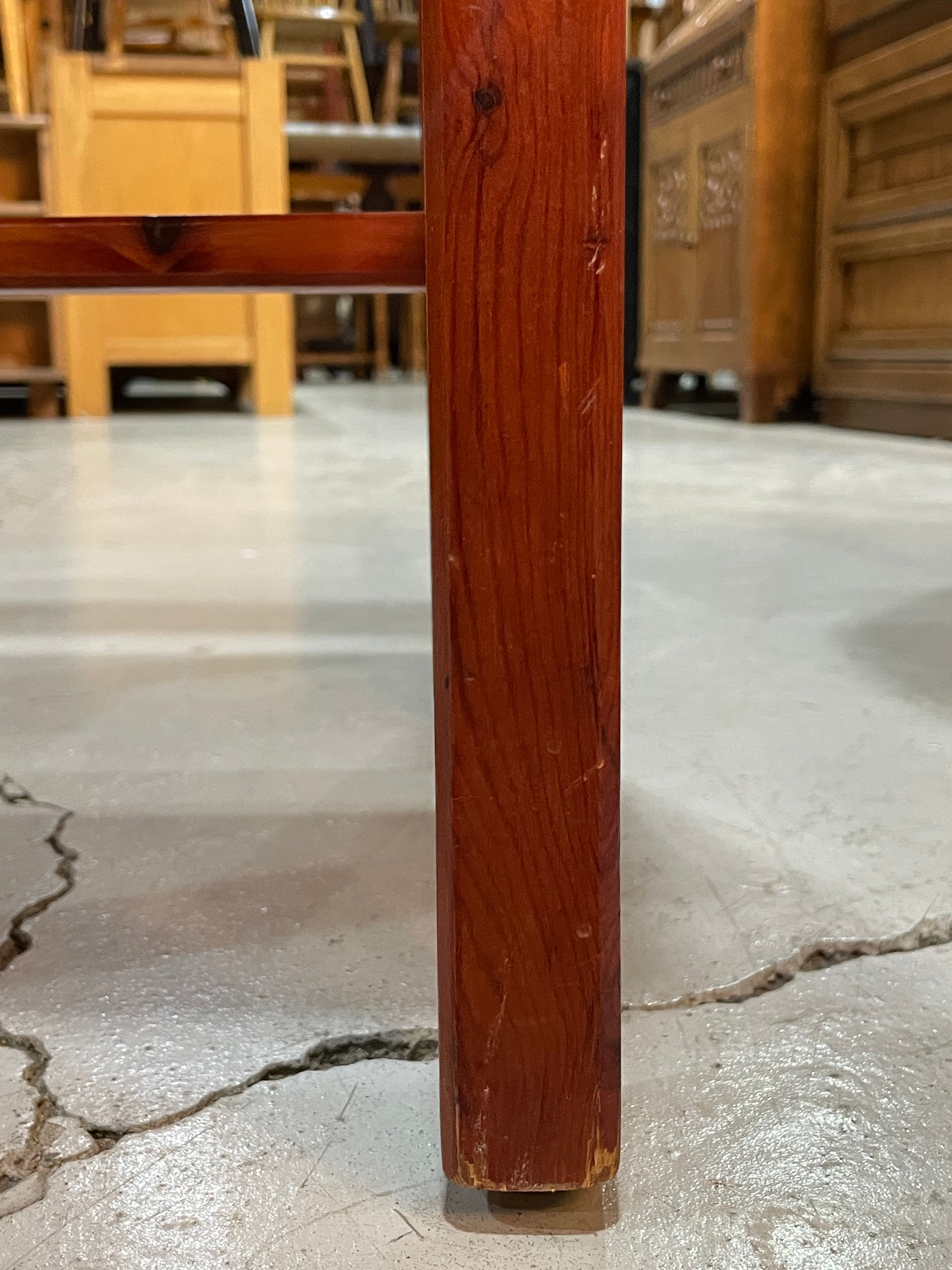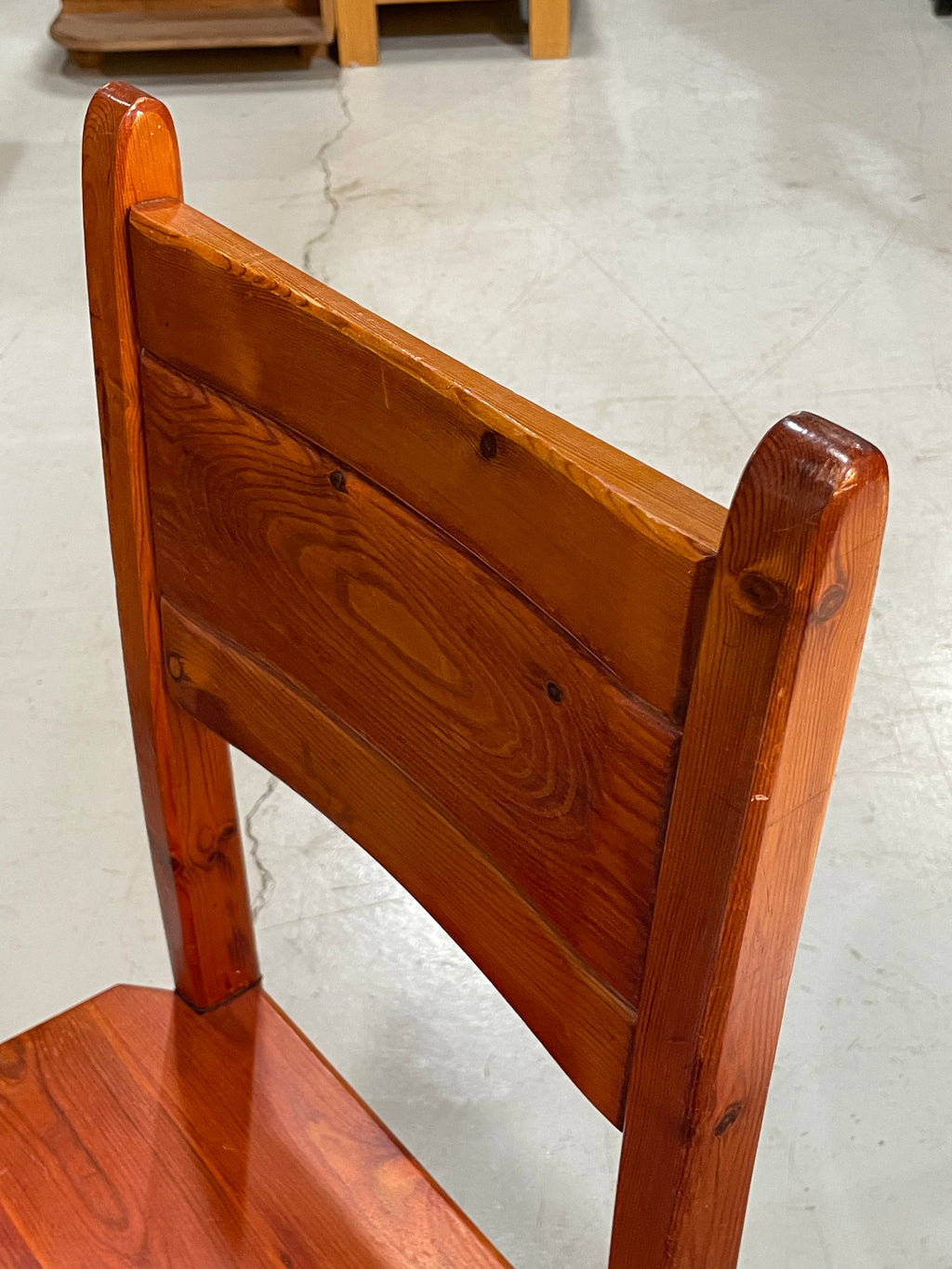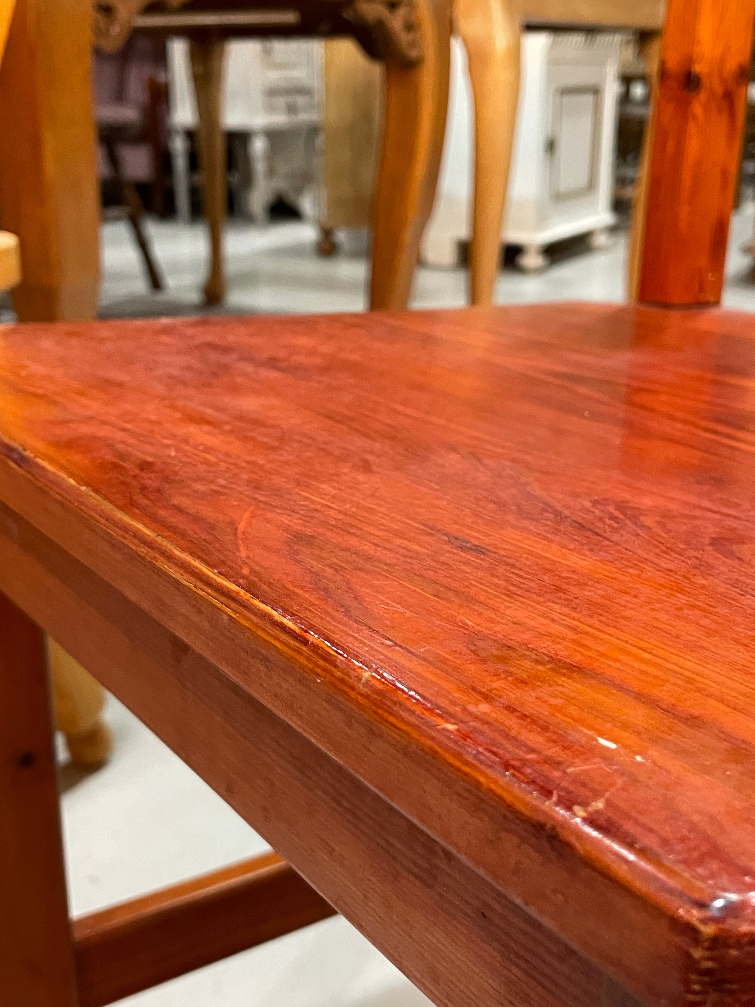 パインウッドの美しい素材を赤茶色のニスで丁寧に仕上げることで、空間に温かさと華やかさをもたらします。直線的なフォルムと、軽量ながらもがっしりとした構造は、日々の使用に耐える実用的な魅力があります。