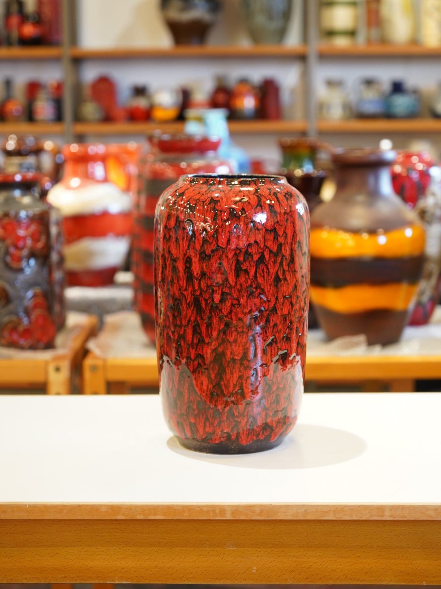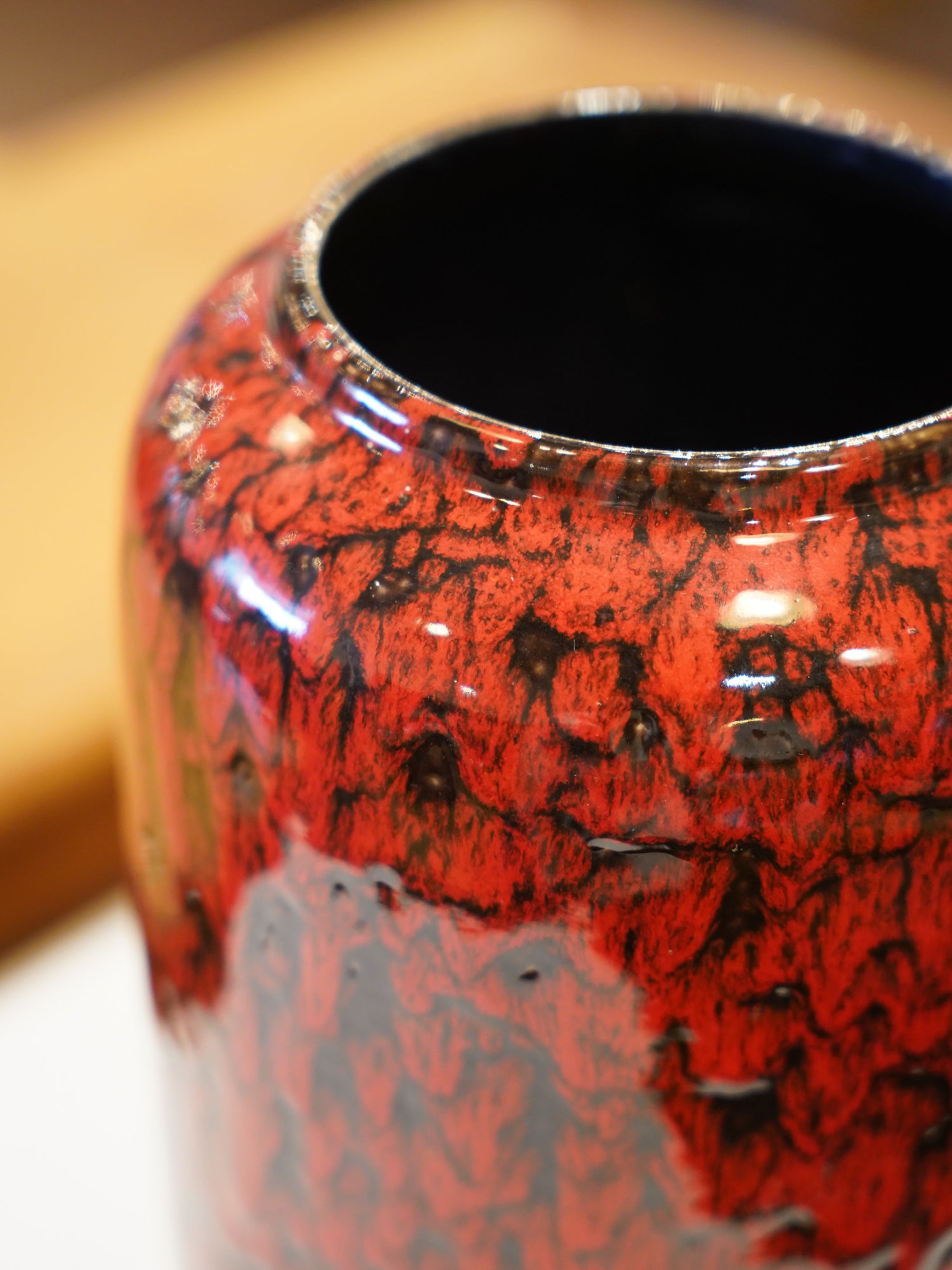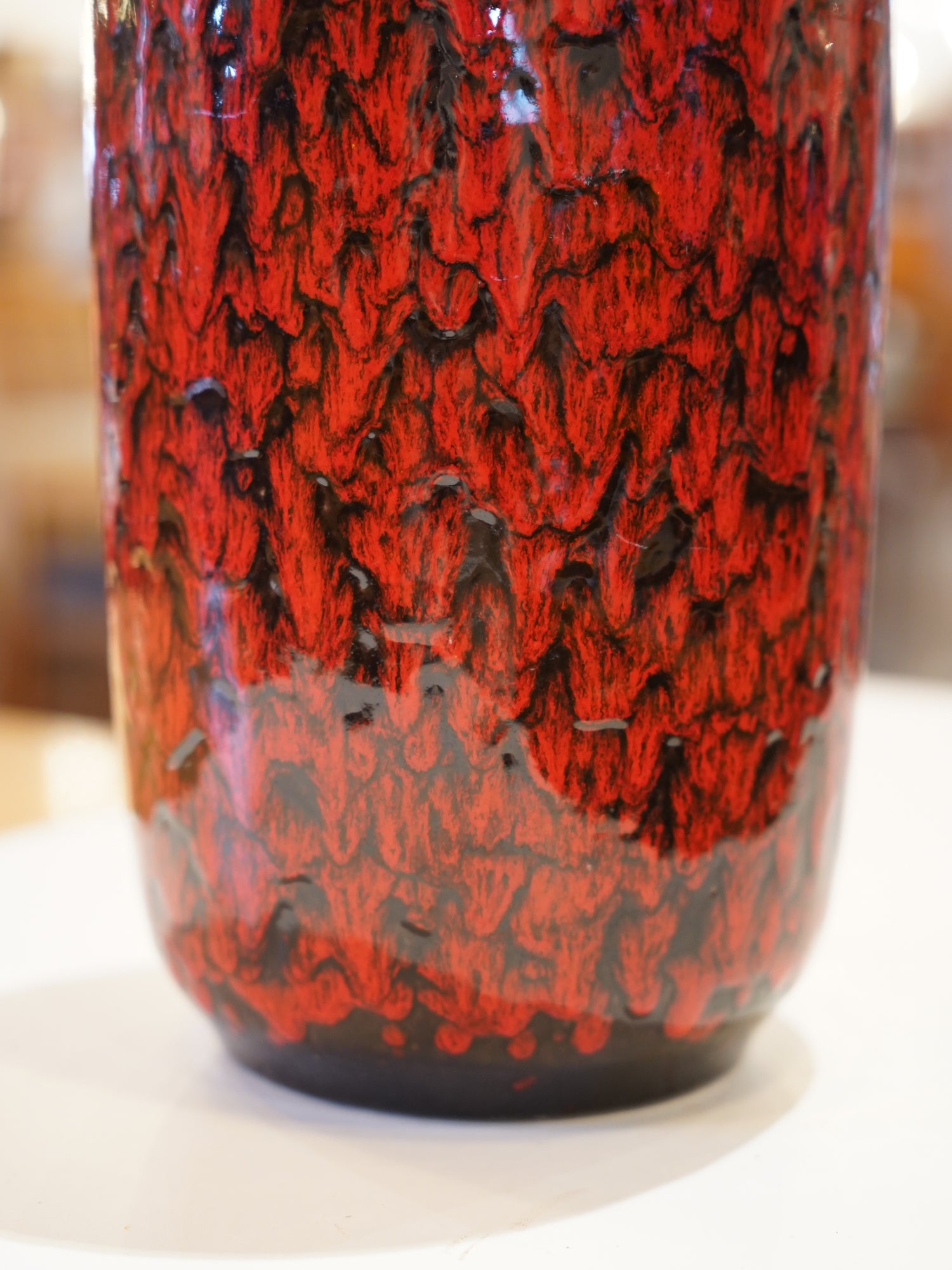 ベースとなるのは、燃え盛るような鮮やかな光沢のある赤釉です。その上から、厚い黒の釉薬が垂直方向やランダムに流れ落ち、赤と黒が激しく交錯するさまは、まるで溶岩が冷え固まる瞬間の様子を捉えたかのようです。これは当時のトレンドであったFat Lavaの中でも、特に表現力の高い技法です。