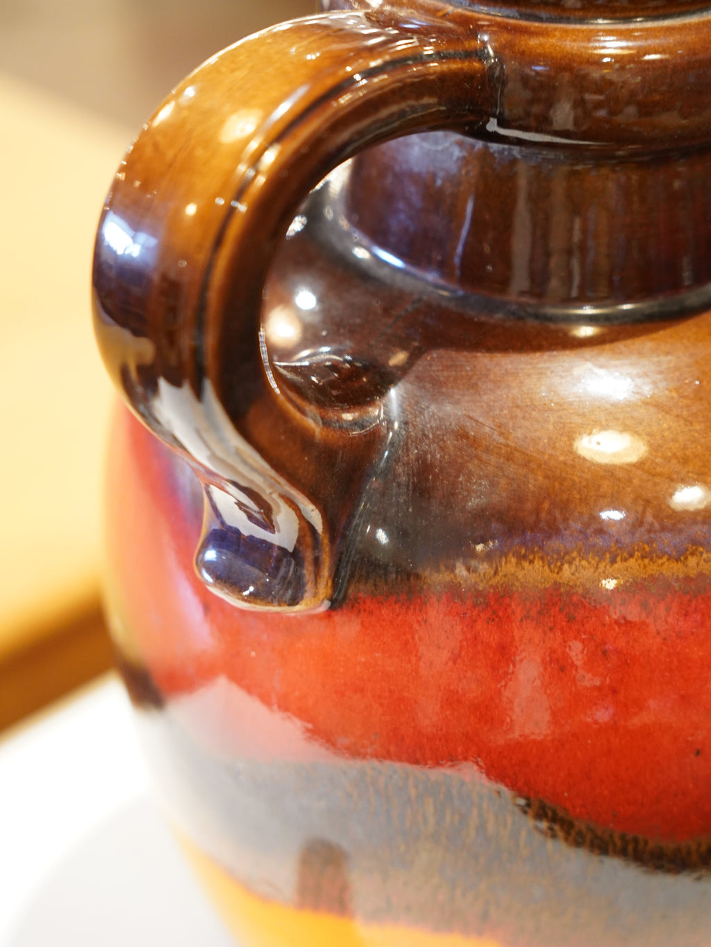 深いチョコレートブラウンをベースに、胴体中央には鮮やかな赤とオレンジ色の帯が、まるで夕焼けやマグマのように大胆なグラデーションを形成しています。釉薬が流れ落ちる境目の濃淡や、わずかに現れる気泡が、深みと味わいを加えています。