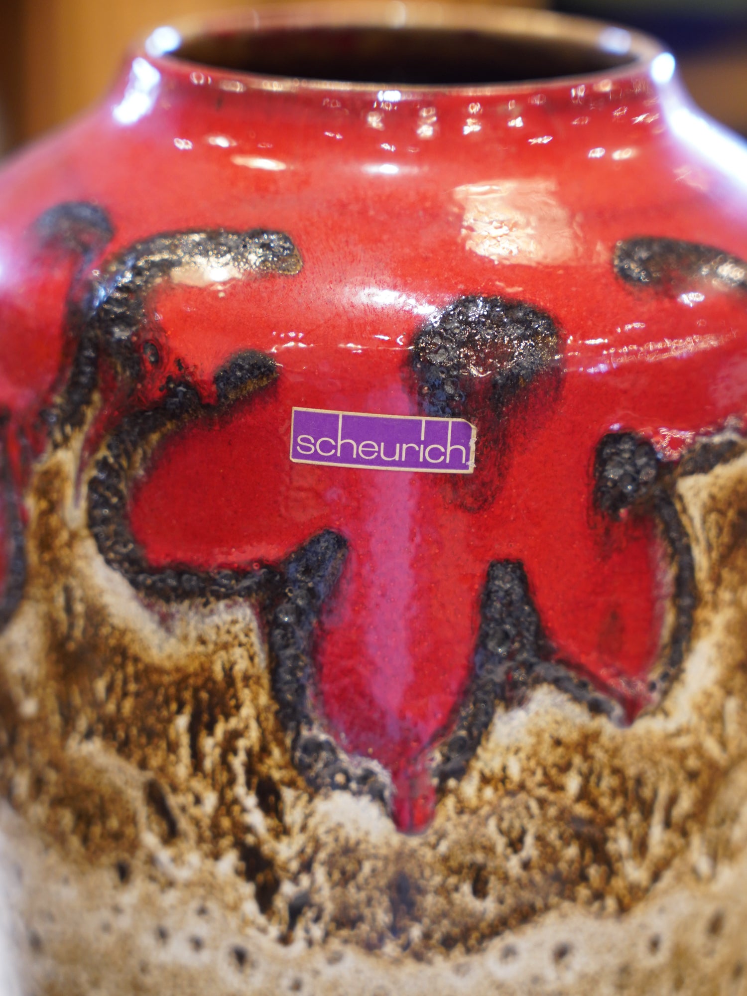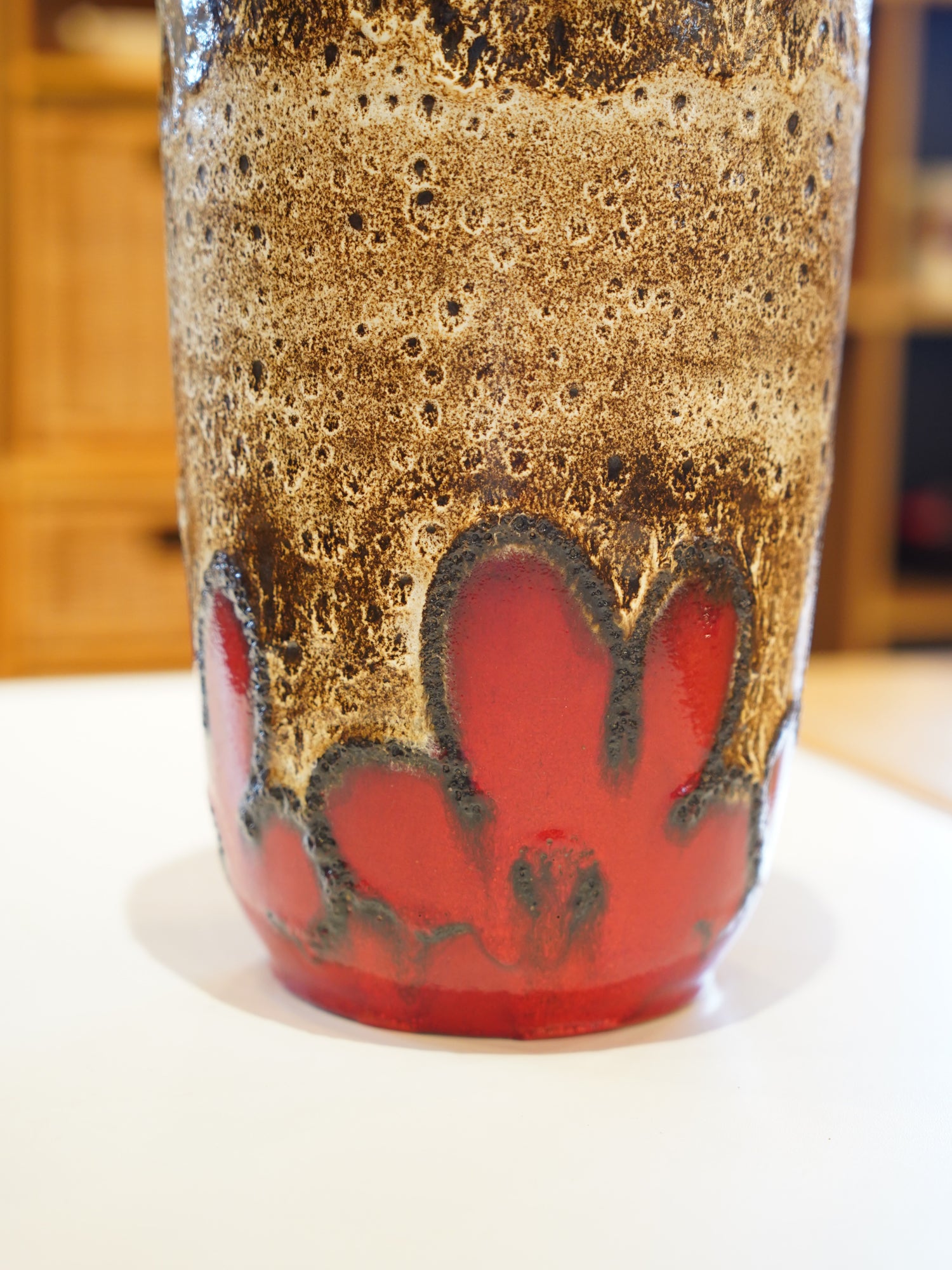 Scheurichのデザインの真髄が凝縮された本作は、その大胆な釉薬装飾が最大の特徴です。上下には、光沢のある鮮烈な赤釉が惜しみなく使われ、黒い縁取りによって抽象的な花模様がダイナミックに描かれています。この華やかな装飾とは対照的に、胴体の中央部には、マットで粗い質感のベージュ系Fat Lava釉薬が厚く施されており、まるで荒々しい岩肌のようなテクスチャを生み出しています。