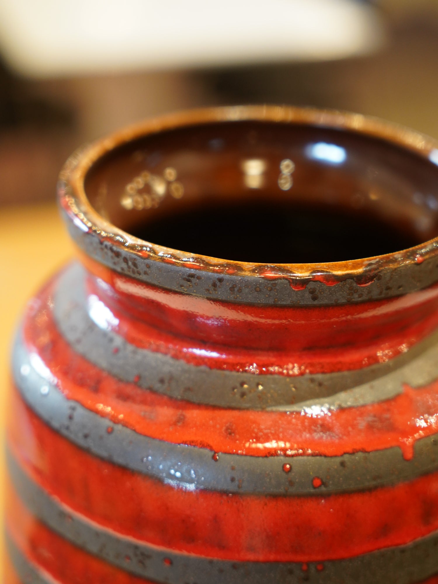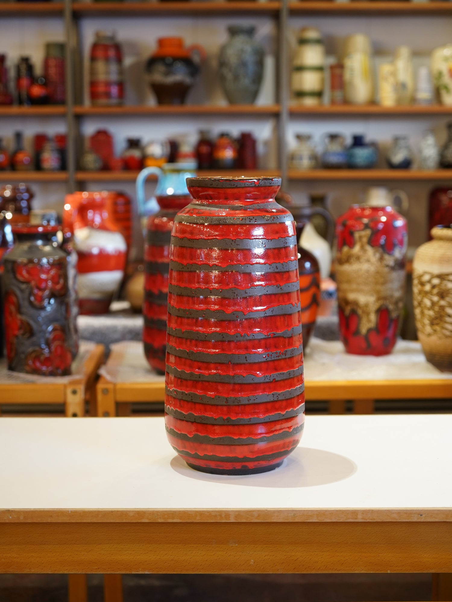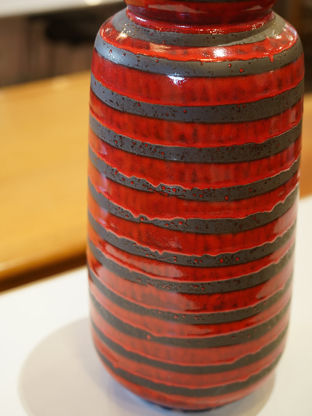 デザインの核となるのは、ベース全体を水平に巡る強烈なストライプです。ベースとなる光沢ある鮮やかな赤釉の上に、溶岩のようにざらついたマットな黒のFat Lava釉薬が厚く横帯を描いています。このストライプの対比は、作品に奥行きと力強さを与え、まるで脈動するマグマと冷えた大地のようなドラマを表現しています。