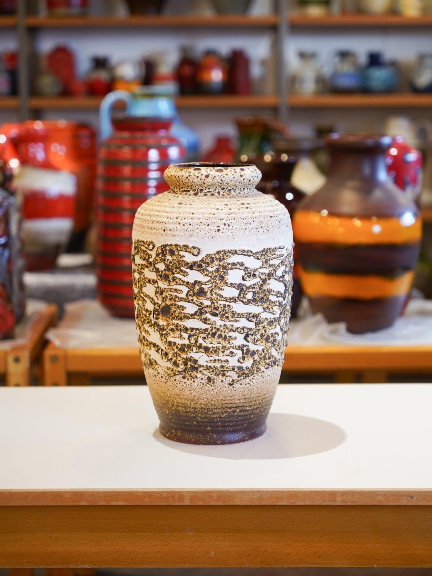 1933年に創業し、特に1960年代から70年代にかけて旧西ドイツ陶器市場で大きな成功を収めたメーカーです。彼らの特徴は、質の高い成形技術と、アバンギャルドで多様な釉薬表現にあります。特に、鮮やかなコバルトブルーの「Koralle」や、厚くざらついたFat Lavaなど、強烈な色彩とテクスチャを持つ作品で知られています。その優れたデザインと品質から、現在も世界中のコレクターに愛されています。