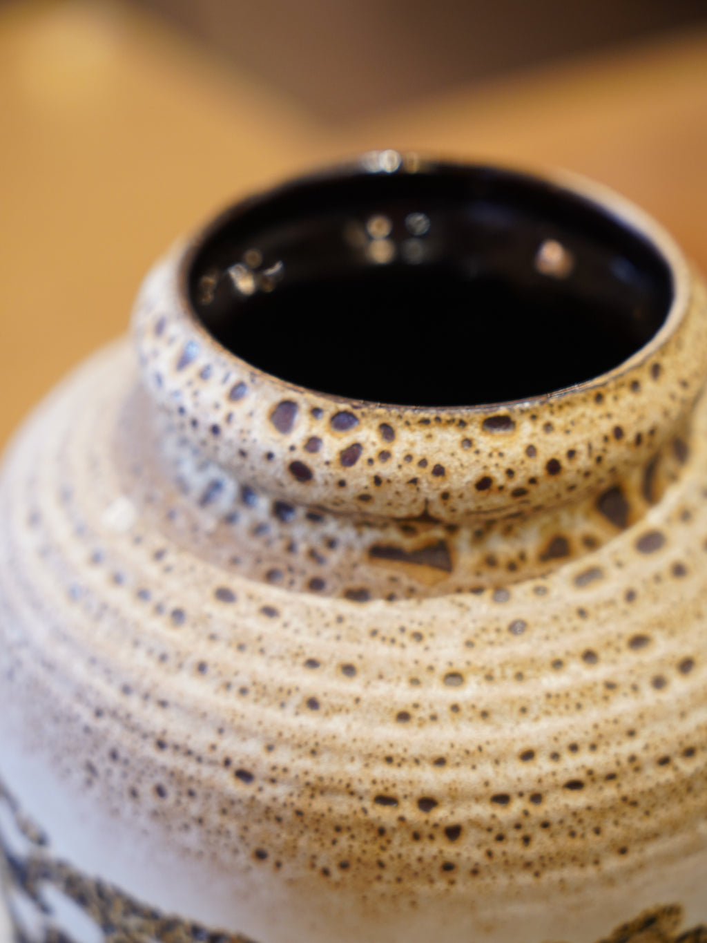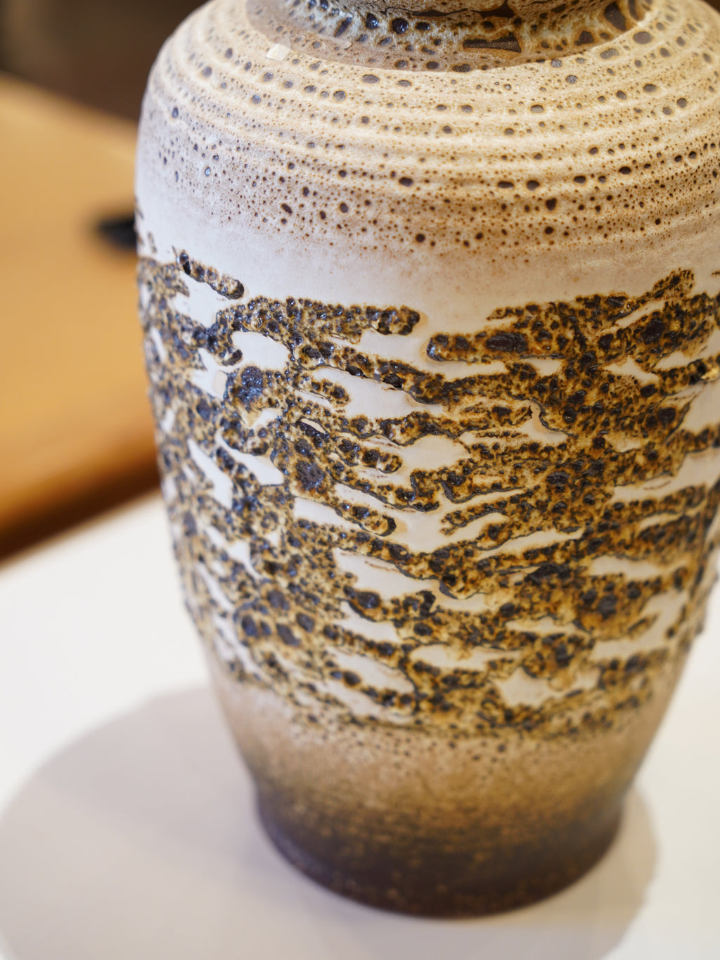 ベースの上部から中央にかけては、明るいアイボリー系の釉薬が施され、その上に茶色と黒のFat Lava釉薬が厚く盛り上がり、まるで古代の壁画や溶岩の割れ目のような有機的でアグレッシブなパターンを形成しています。下部に向かっては、マットなダークブラウンに変化し、デザイン全体に深い安定感を与えています。