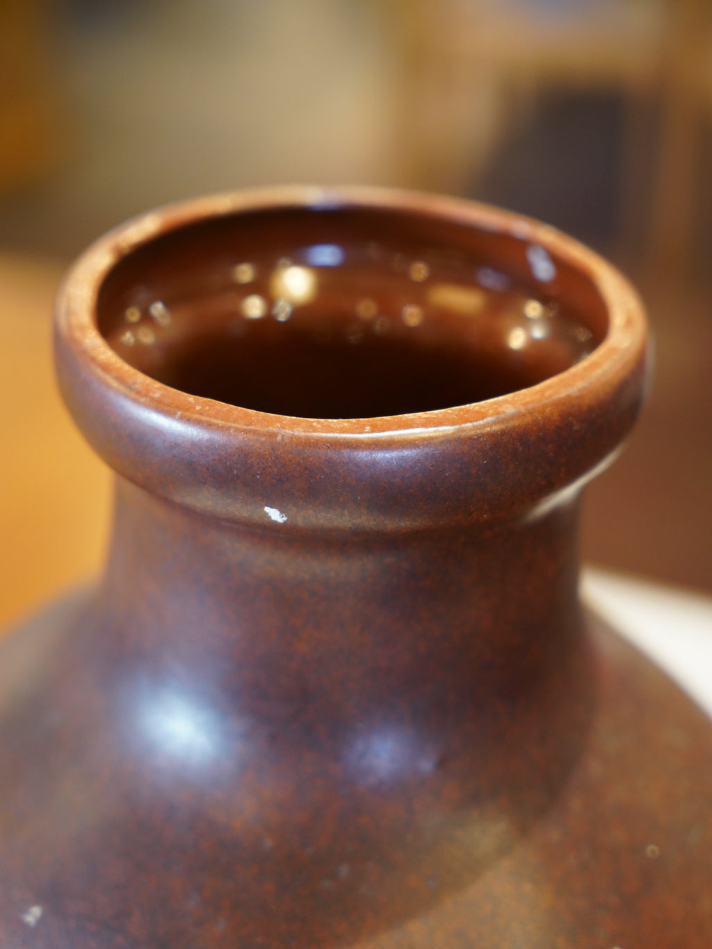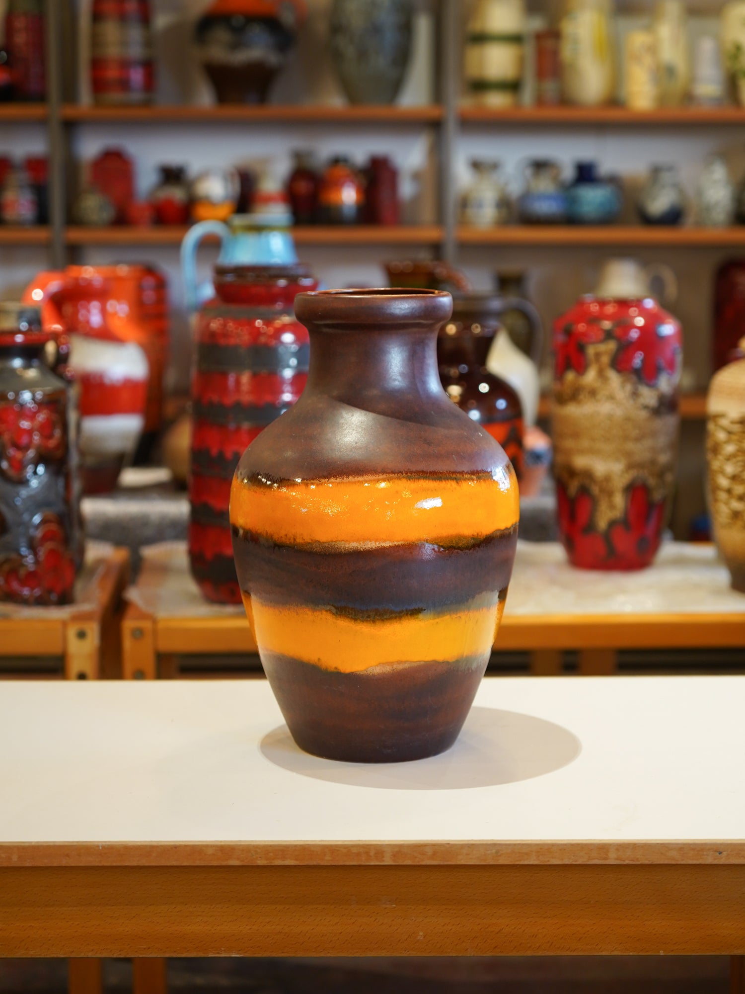 本体の深いチョコレートブラウンは艶やかで滑らかな質感であるのに対し、ぐるりと囲む鮮やかなオレンジ色の帯には、Fat Lava特有の荒々しく立体的なテクスチャが施されています。この異なる質感が、まるで溶岩が流れ固まったような、ダイナミックな迫力を演出しています。