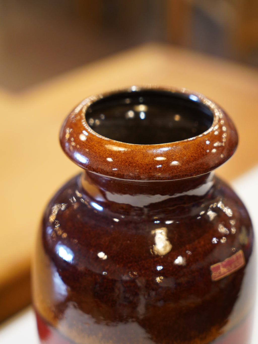 ベース全体は、深く艶やかなダークブラウンの釉薬で覆われており、重厚で落ち着いた雰囲気を持っています。その胴体の中央を、鮮烈な真紅の光沢釉が太い帯となって水平に一周しており、シックなブラウンとの劇的な対比を生み出しています。このシンプルなストライプ柄こそが、当時のミニマルでモダンなデザインの潮流を象徴しています。