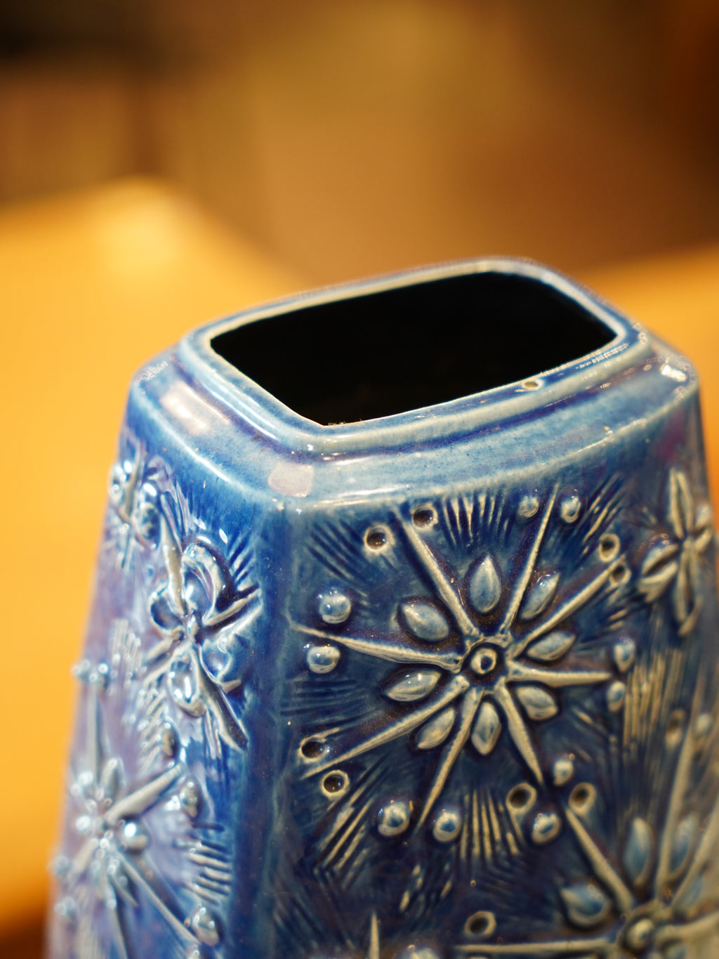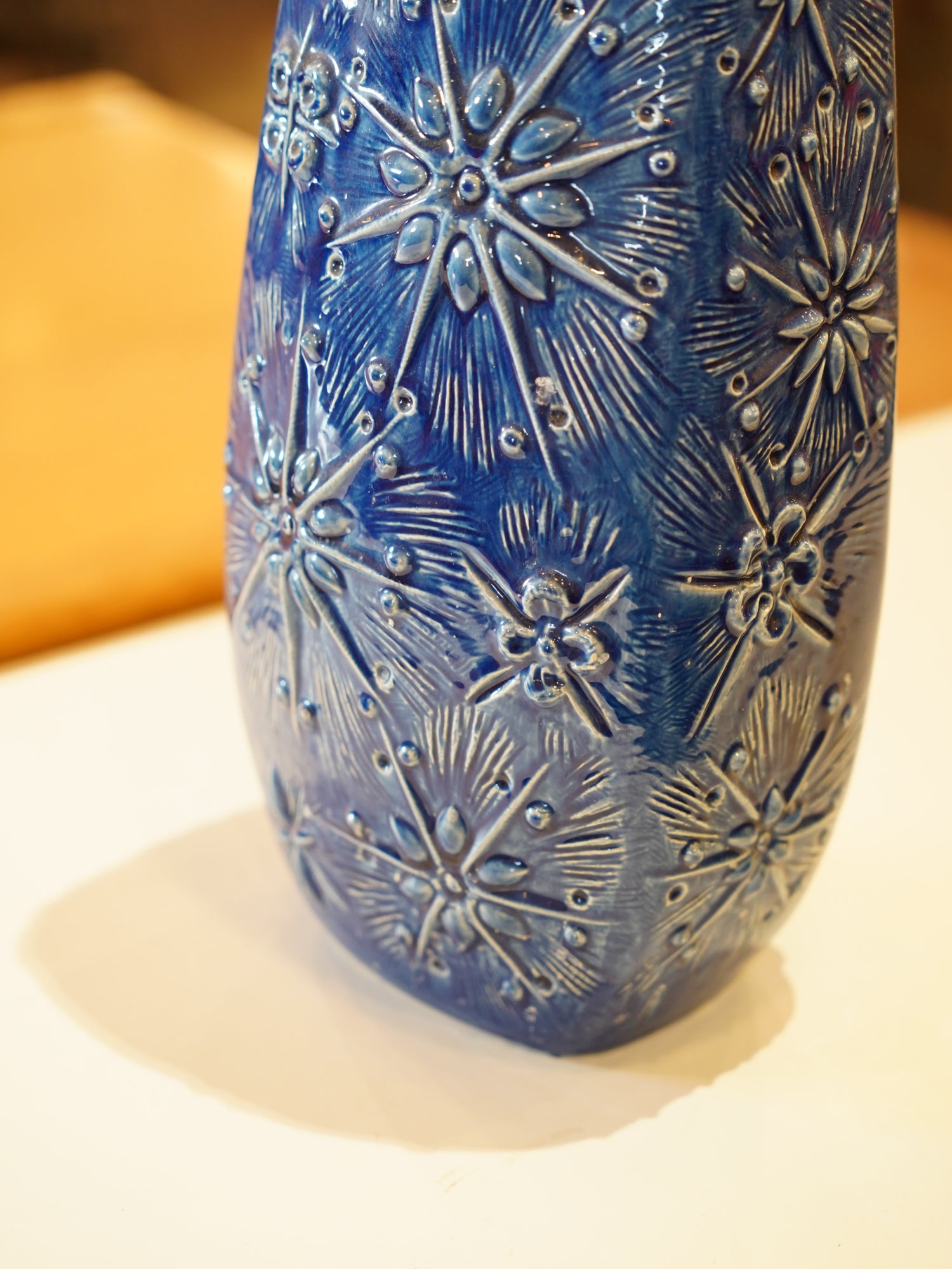 ベース全体は、深く艶やかなコバルトブルーの釉薬で覆われ、その表面に緻密な放射状の模様がくっきりと浮き彫りになっています。釉薬がレリーフの凹凸に濃淡の陰影をつけ、まるで星が煌めいているかのようなドラマティックな視覚効果を生み出しています。
