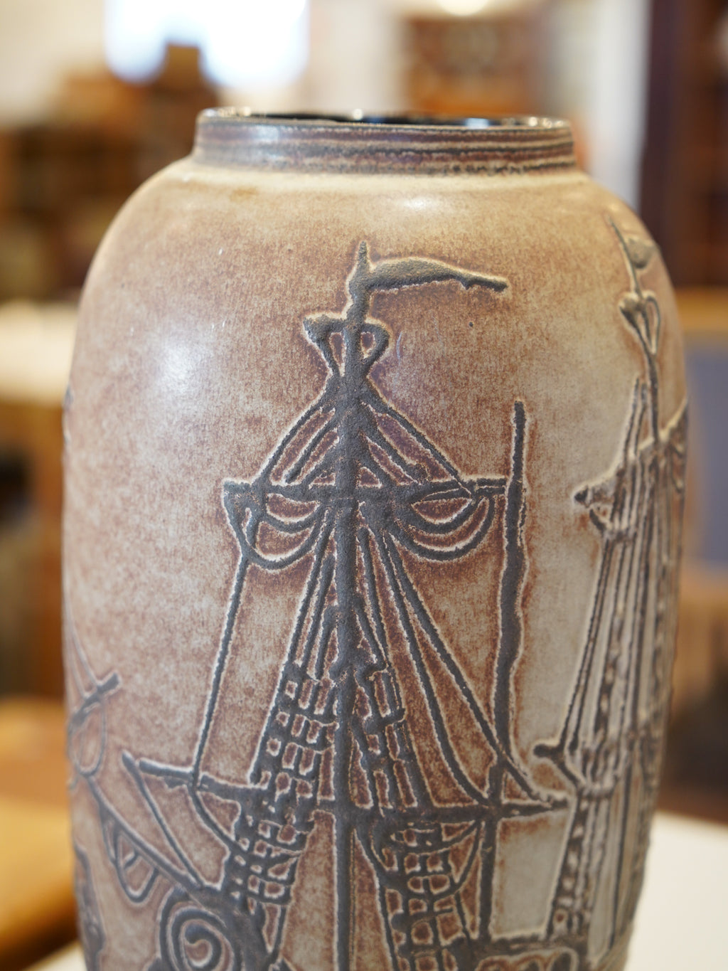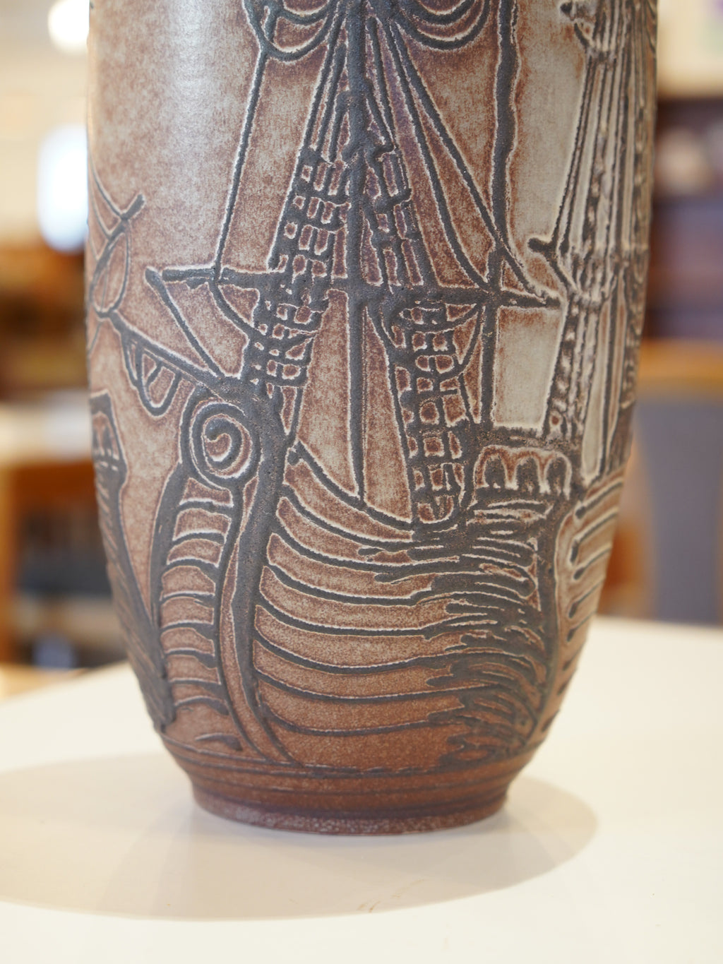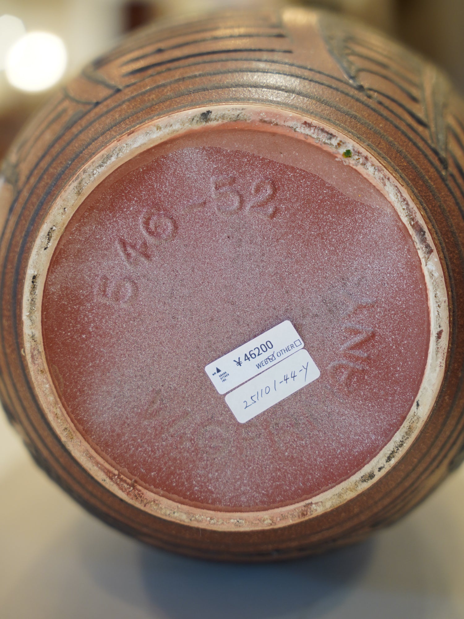 釉薬は、船のモチーフが立体的に際立つよう、落ち着いたアースカラーのマットな質感で仕上げられています。レリーフの溝に濃い釉薬が流れ込むことで、船の帆や荒々しい波がドラマチックな陰影となって浮かび上がります。底面は素焼きのまま残され、当時の製造工程と土の温もりを感じさせます。