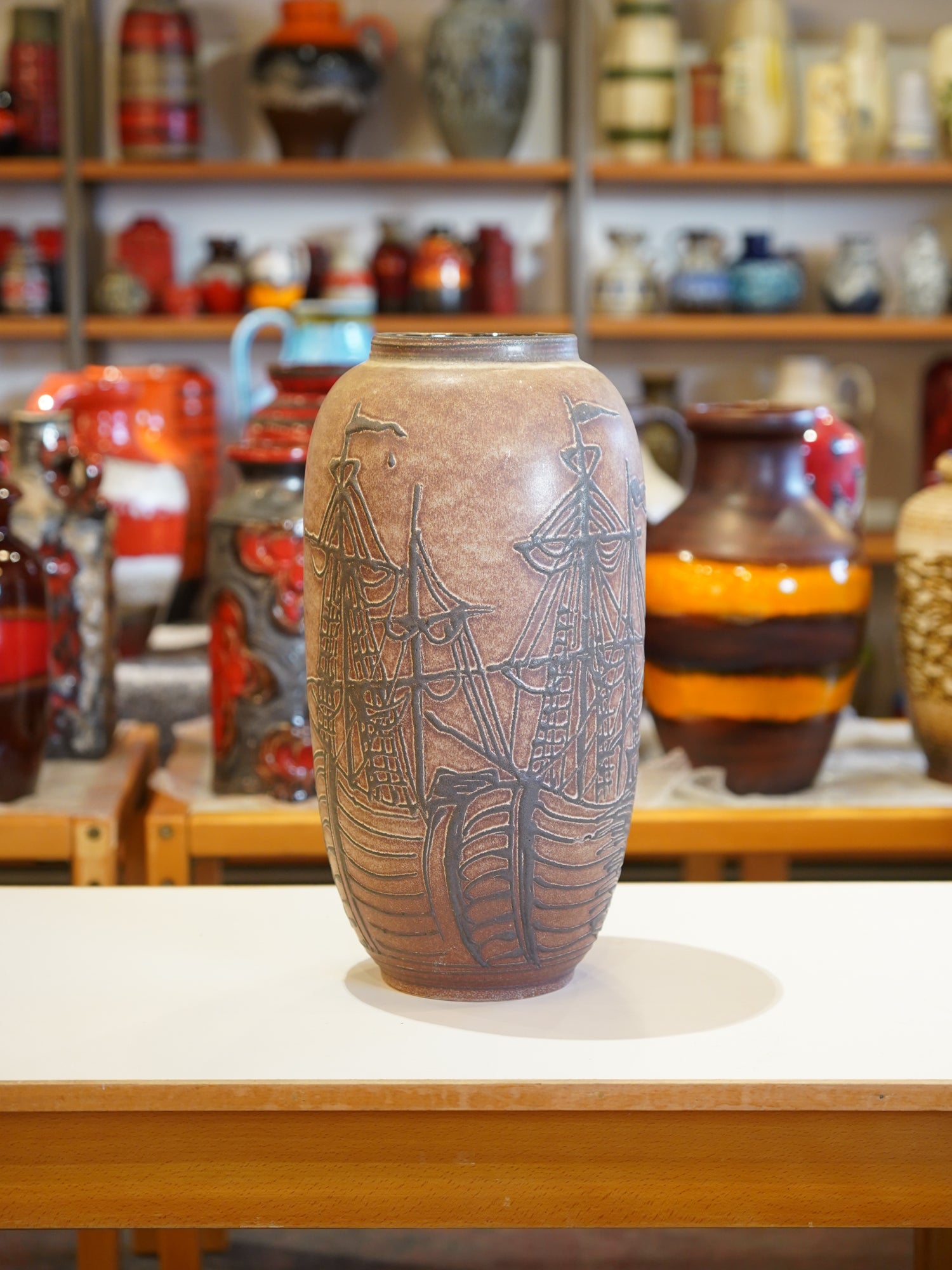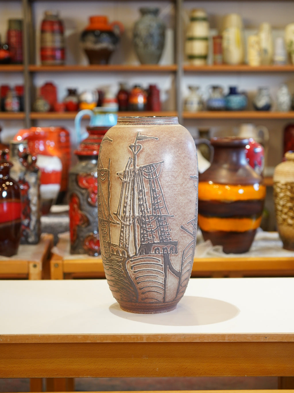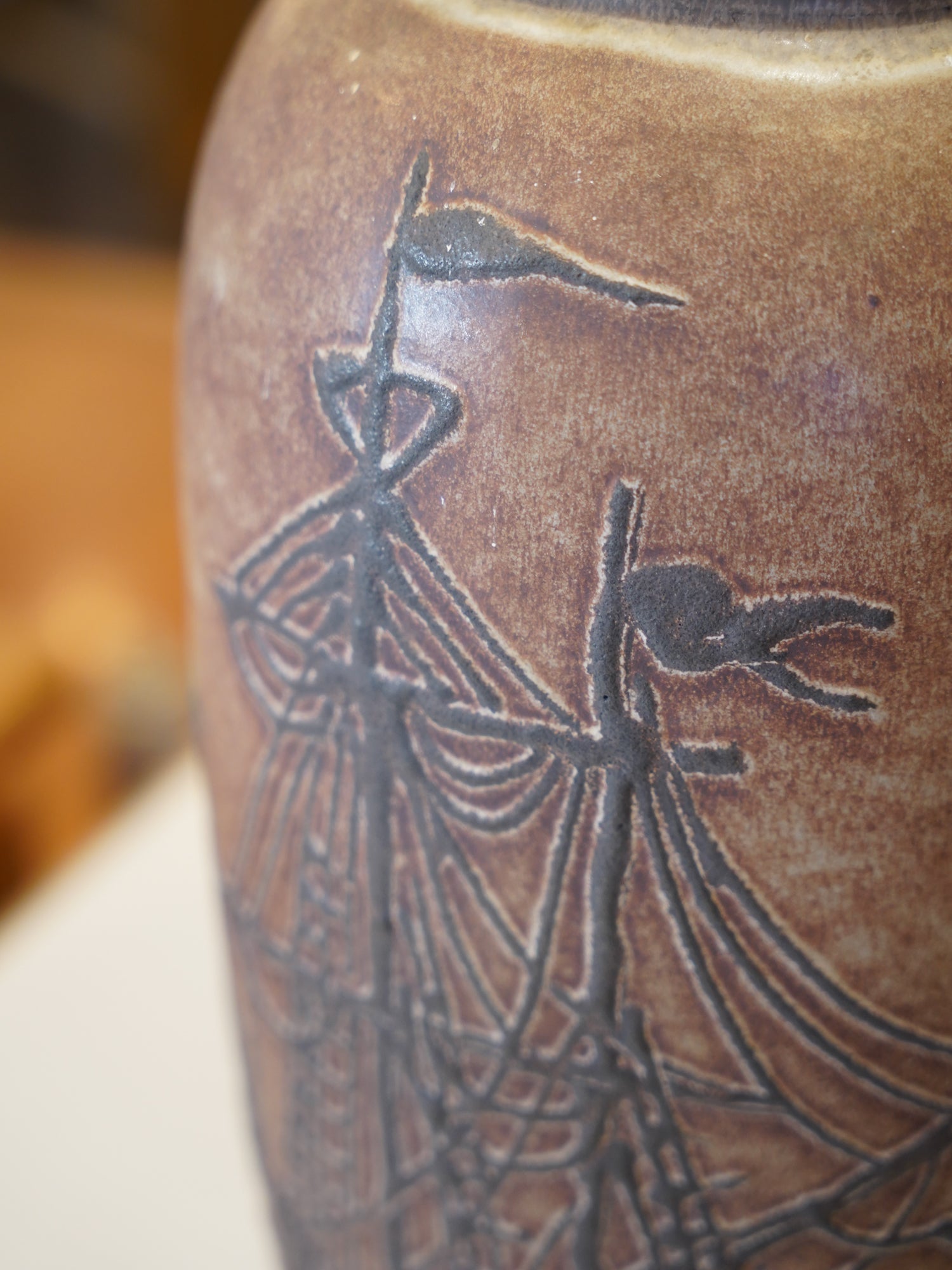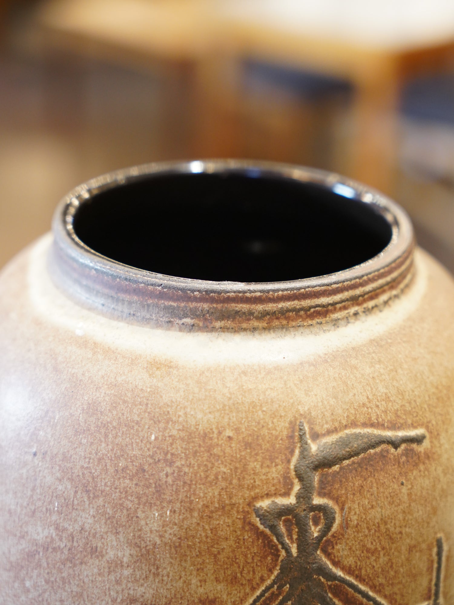 釉薬は、船のモチーフが立体的に際立つよう、落ち着いたアースカラーのマットな質感で仕上げられています。レリーフの溝に濃い釉薬が流れ込むことで、船の帆や荒々しい波がドラマチックな陰影となって浮かび上がります。底面は素焼きのまま残され、当時の製造工程と土の温もりを感じさせます。