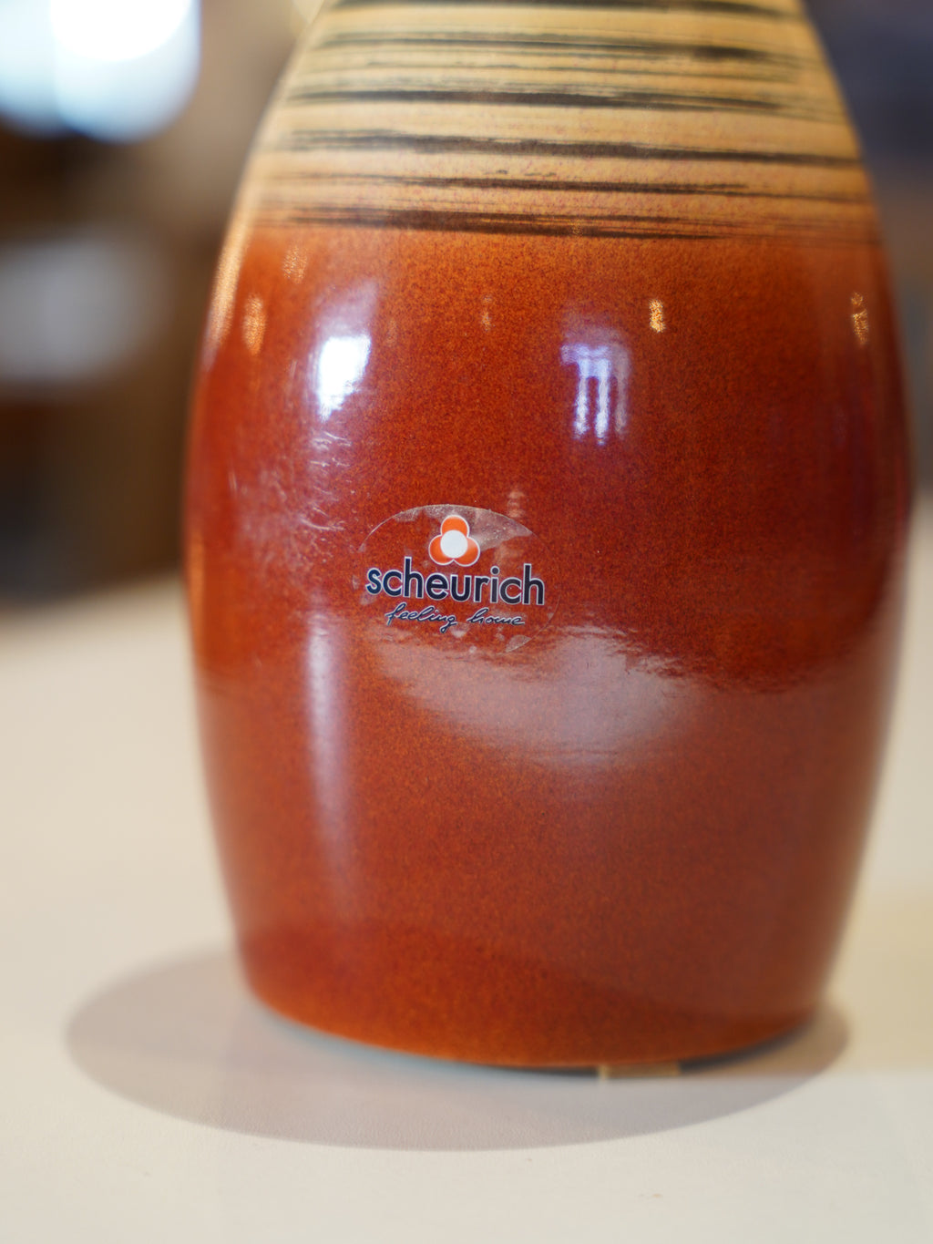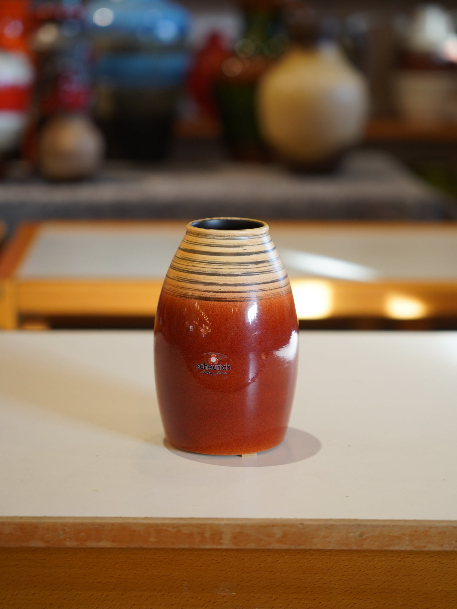 西ドイツを代表する陶器メーカー、Scheurich社が手掛けたヴィンテージフラワーベースです。底には、Scheurichのロゴ、型番「629-18」、そして「Made in GERMANY」の刻印がはっきりと確認できます。これは、デザインコード「629」の高さ約18cmのモデルであることを示しており、卓上での使用に最適なサイズです。