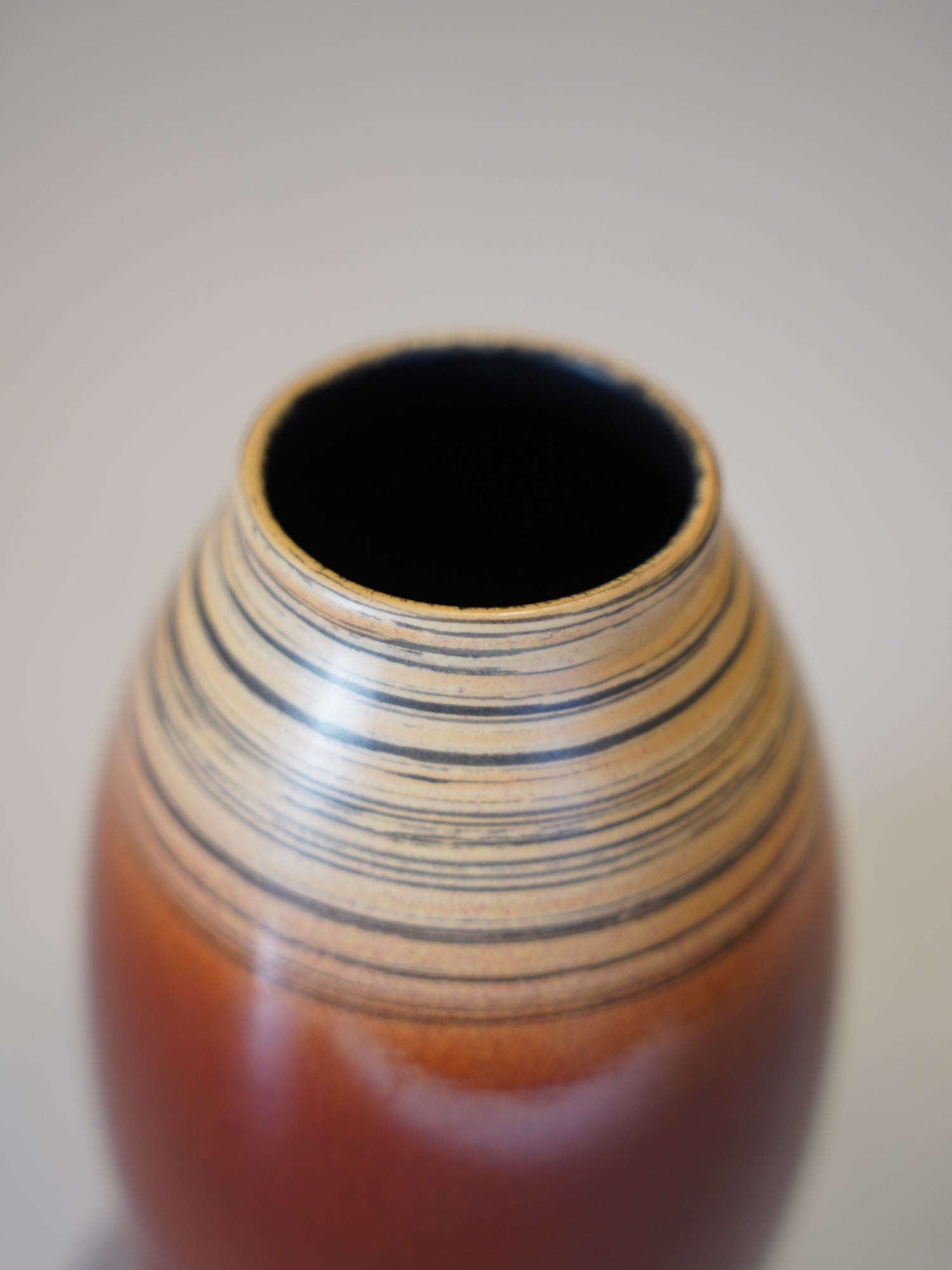 深い飴色の艶やかな釉薬で覆われ、温かみのある雰囲気を醸し出しています。特に魅力的なのは、口元から肩にかけて施された、白土の素地に濃いラインが描かれたリブ装飾です。このストライプが、花瓶全体のデザインにモダンで軽快なリズムを加えています。