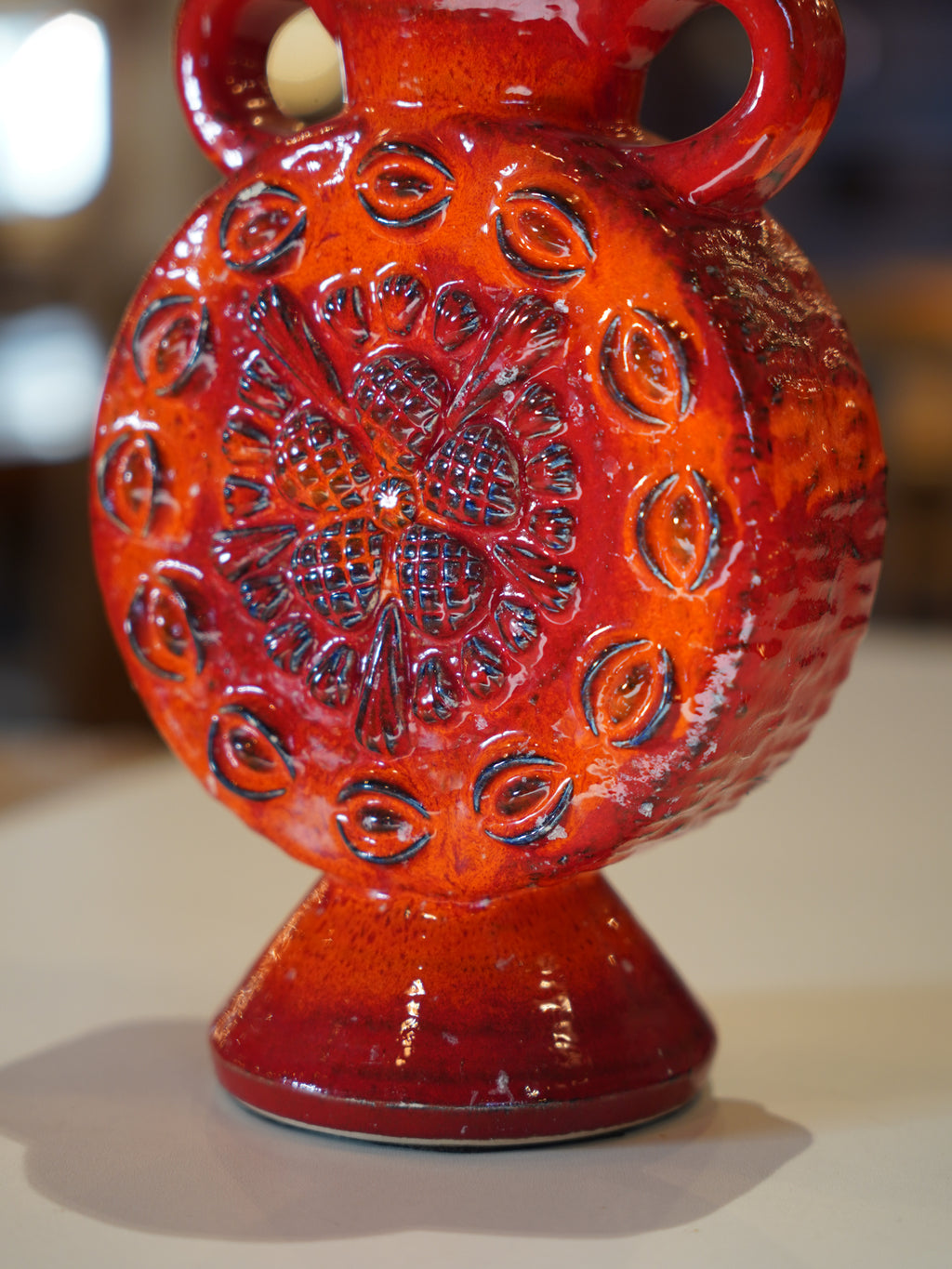 このベースの魅力は、円盤状の胴体と取っ手という力強い造形に、燃えるような朱色の艶やかな釉薬が組み合わされている点です。表面に施された大胆な花を思わせるレリーフと、その溝に溜まる釉薬の濃淡が、光と影のドラマティックな陰影を生み出しています。