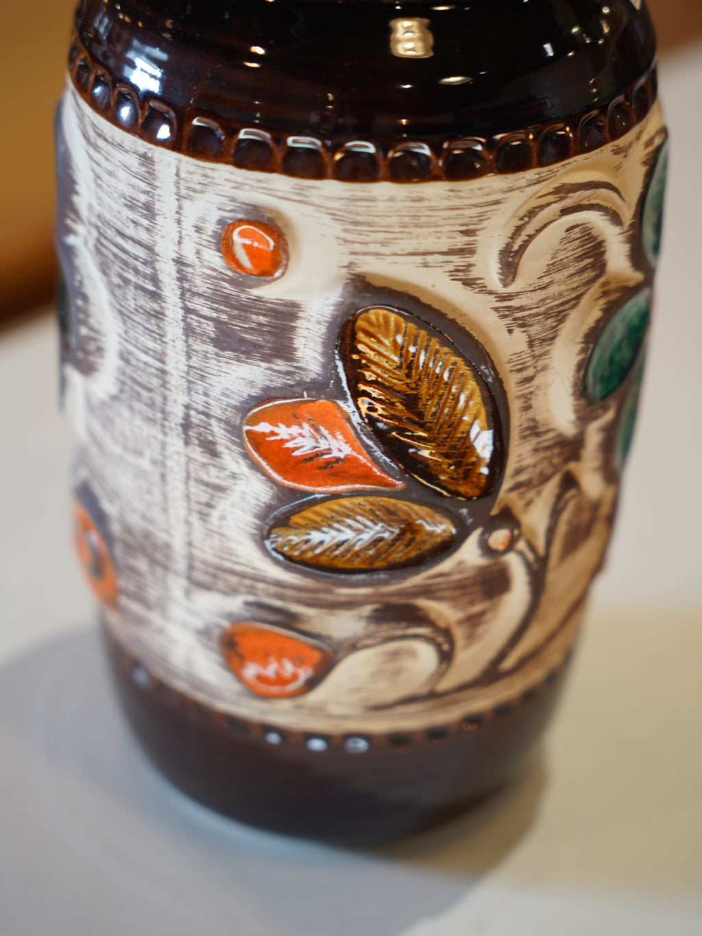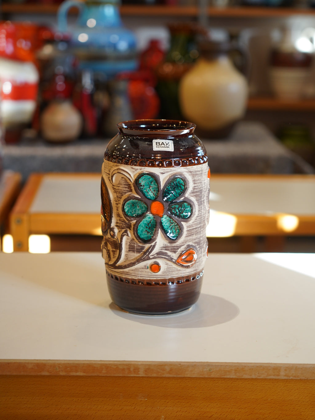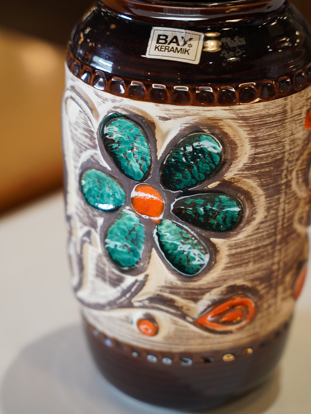 深みのあるブラウンの土台に、厚みのある釉薬で描かれたリーフが特徴的。特に目を引くのは、鮮烈なターコイズブルーとオレンジで彩られた抽象的な花模様です。これは当時のヒッピー文化やポップアートの影響を受けた、自由で実験的なデザインが許された時代背景を映しています。