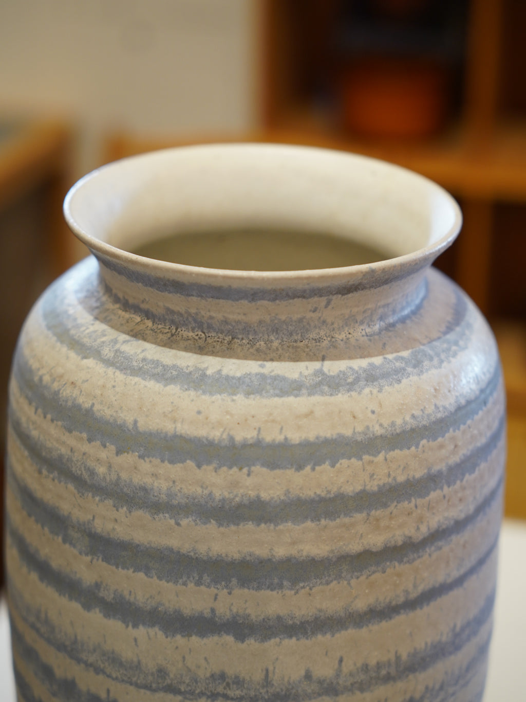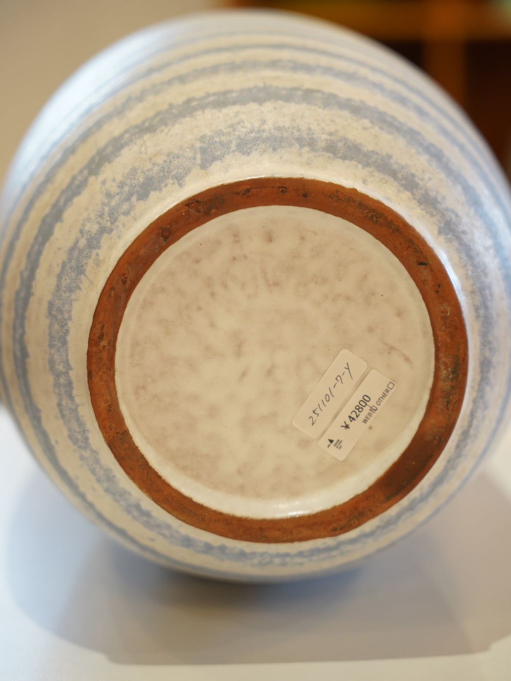 全体を覆うのは、薄いブルーグレーのストライプです。手描きのような柔らかなタッチで描かれた縞が、マットな質感のクリームホワイト釉薬の上で際立ち、地中海の風やマリンテイストを思わせます。
