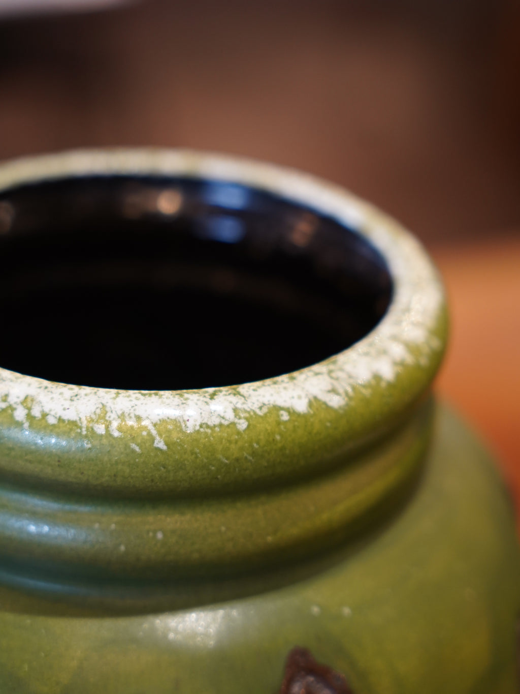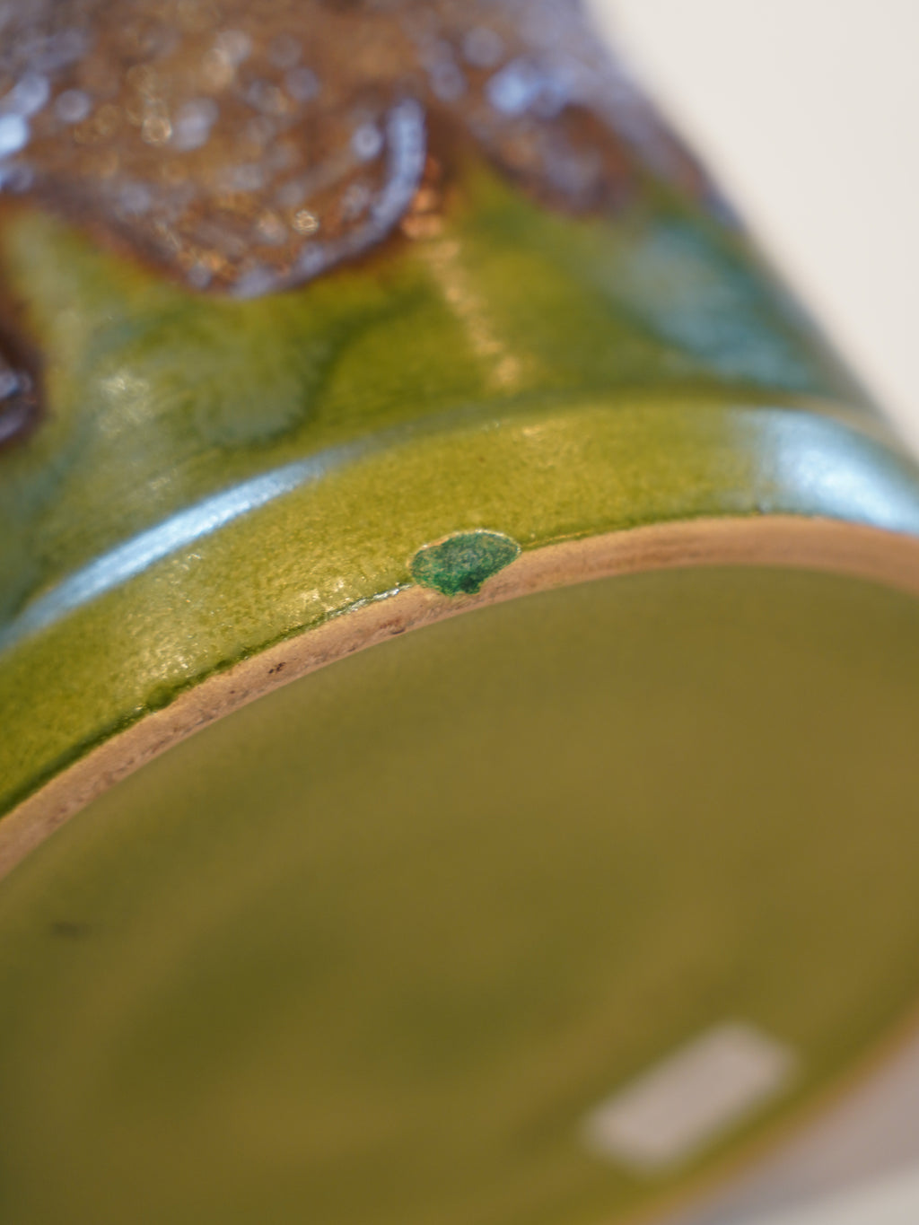 鮮やかなオリーブグリーンの光沢釉がベースとなり、その上から茶と黒の厚いFat Lava釉薬が、溶岩が流れ落ちるようにダイナミックに施されています。この立体的なテクスチャと色彩のドラマチックな対比が、このメーカーの技術力の高さを象徴しています。