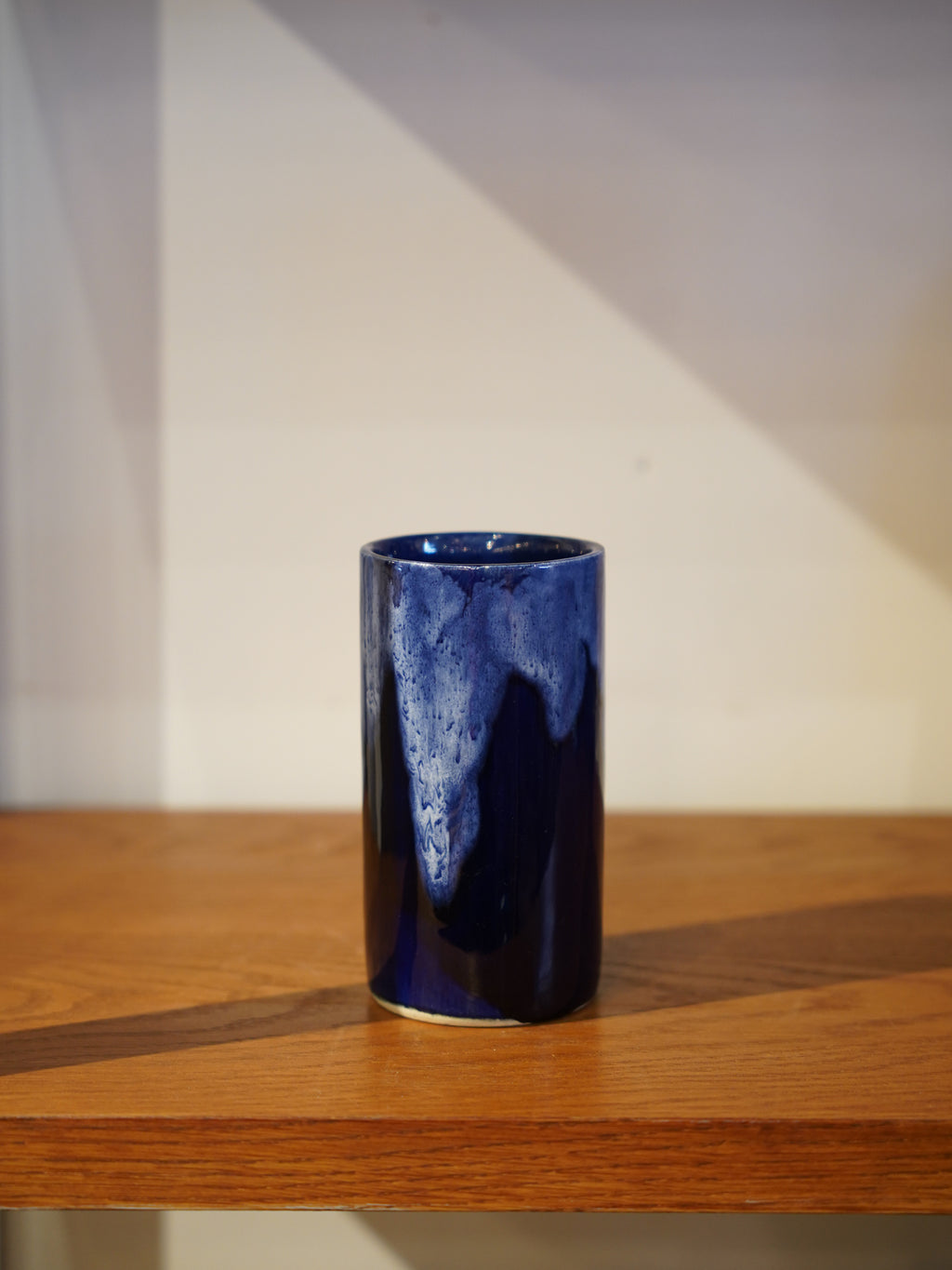 深く濃いネイビーブルーの地に、白や水色の釉薬が上部からダイナミックに流れ落ちた表現が特徴。