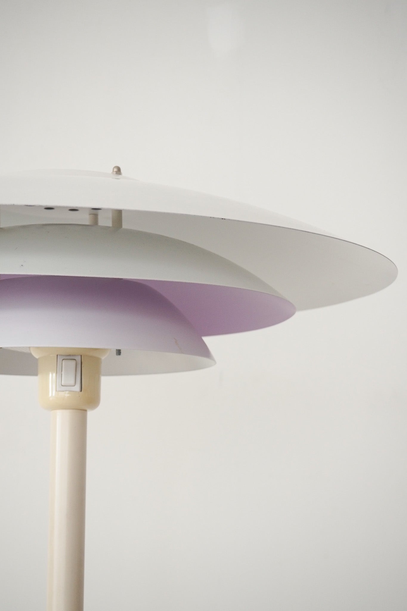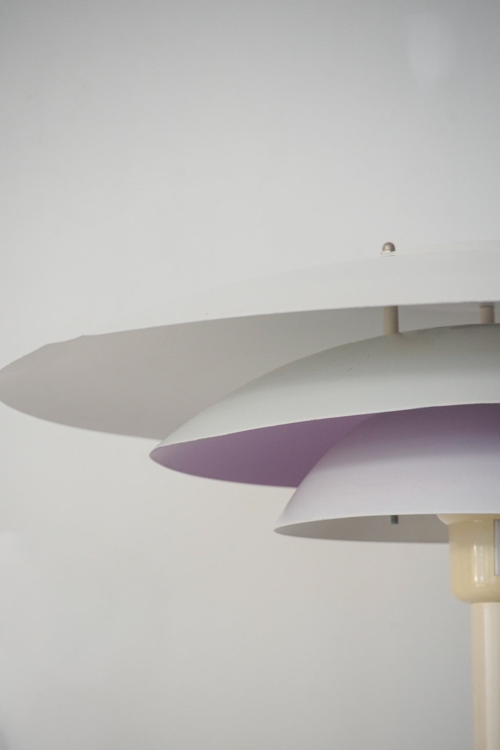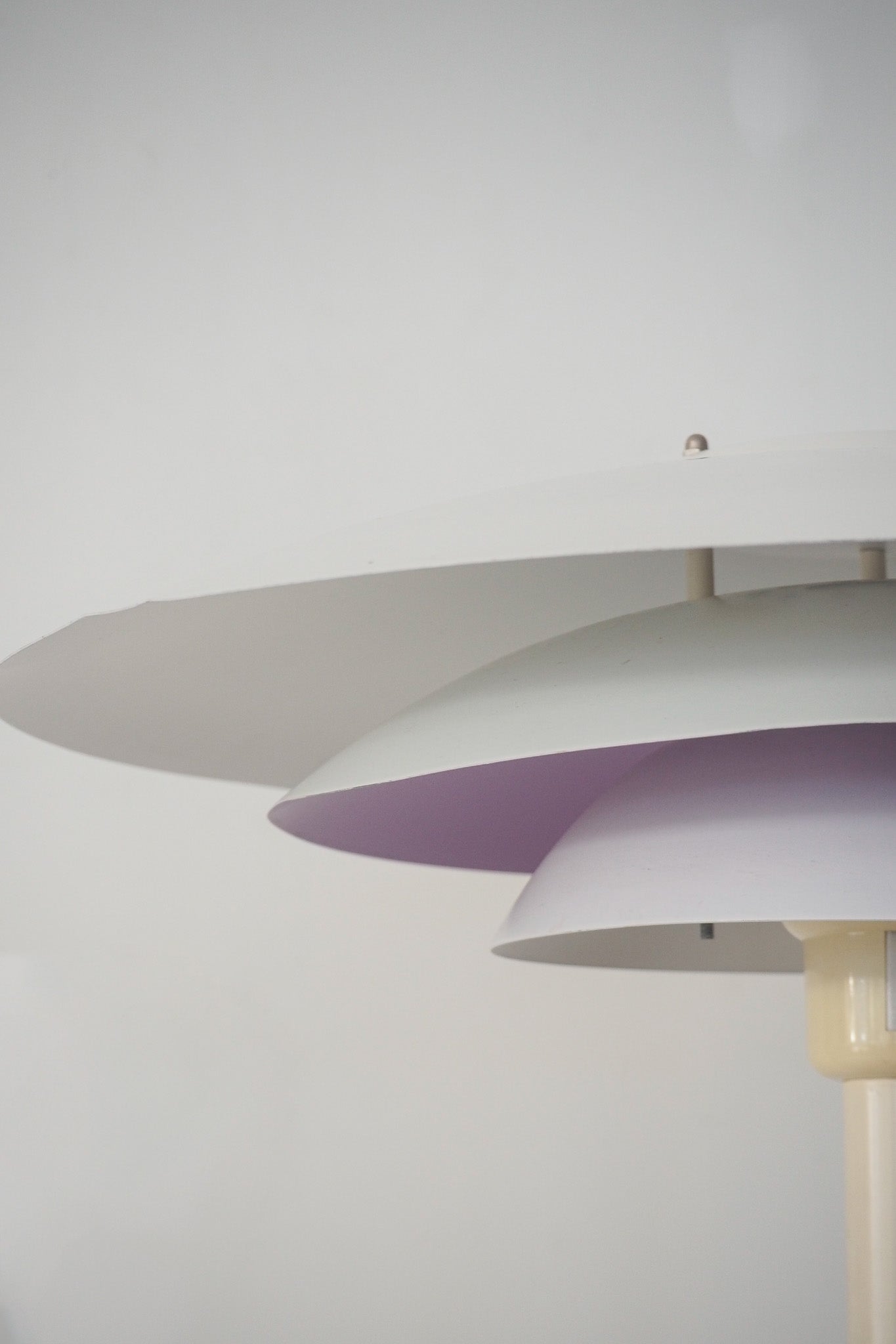 複数のシェードが層状に重なる独自の構造は、光の広がりを計算し尽くされたデザイン。すっきりと伸びる支柱とベースが、その幾何学的な美しさを際立たせています。