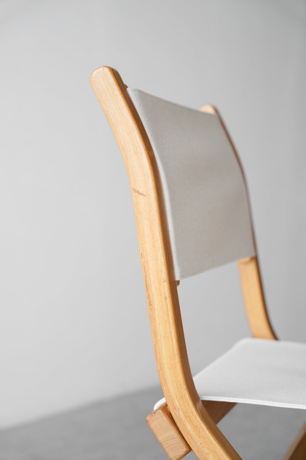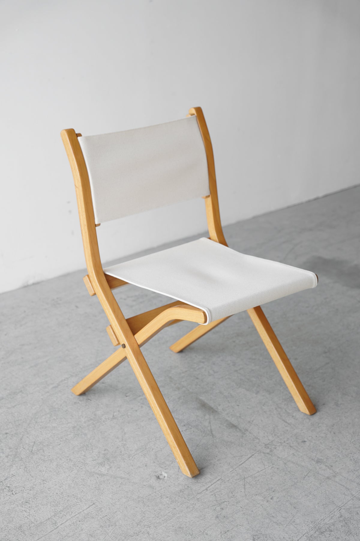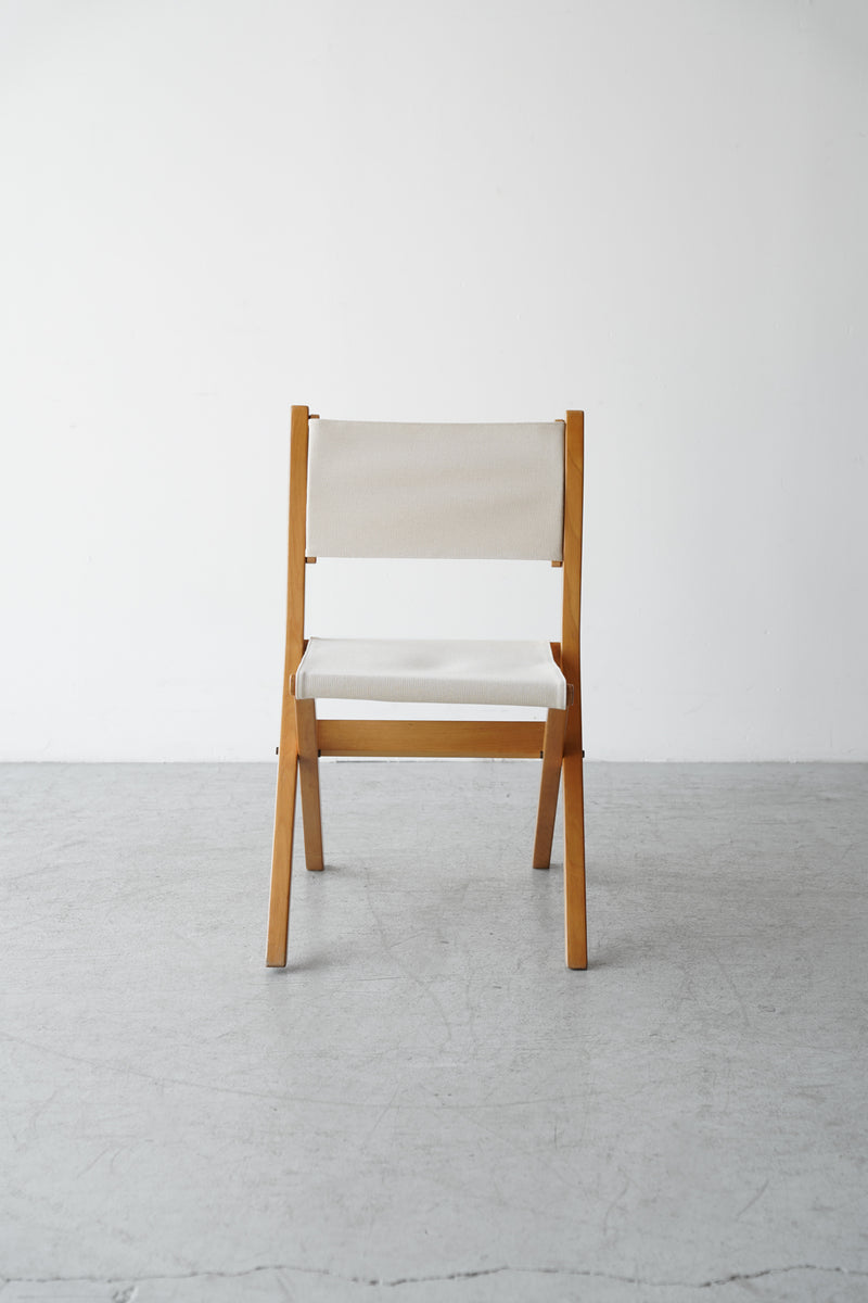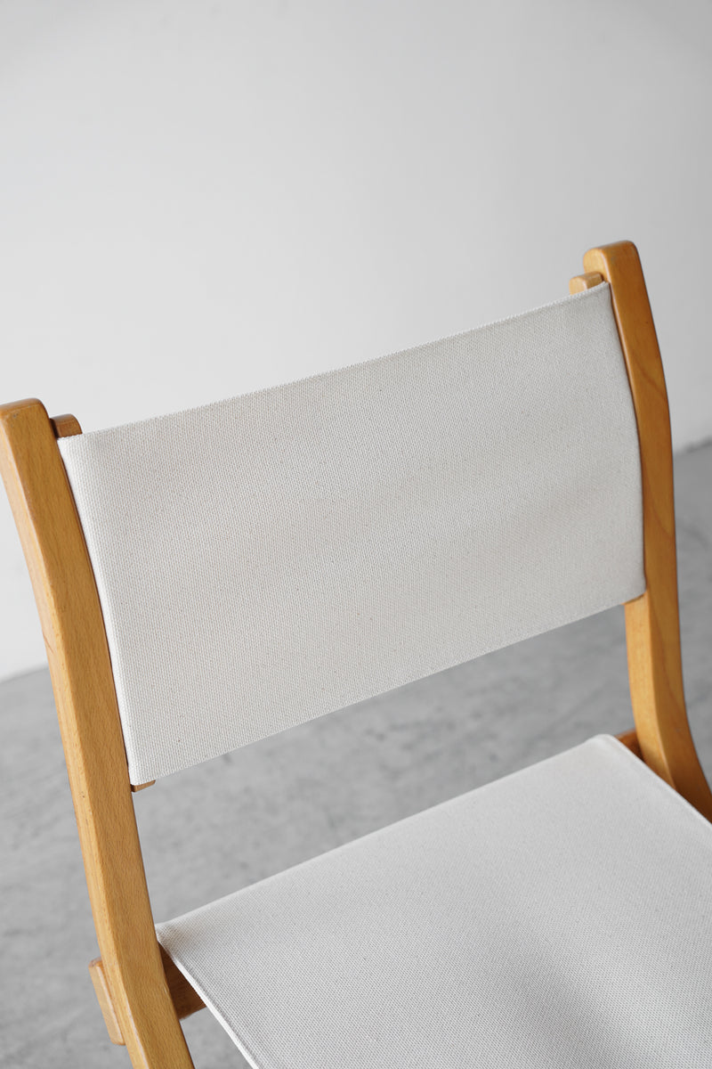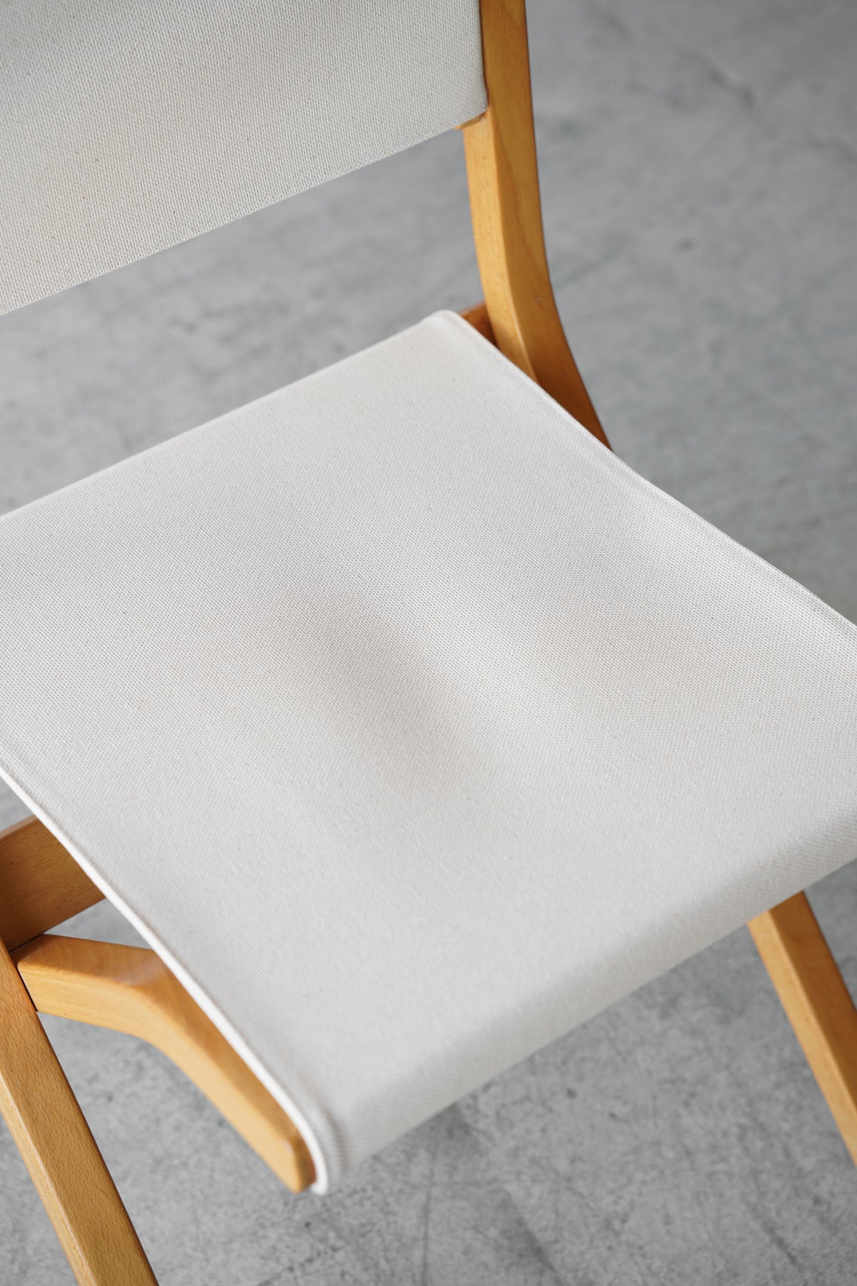 この椅子の最大の魅力は、その無駄を排したミニマルな構造と、限られたスペースでも活躍する実用性にあります。軽量ながらもしっかりとした木製フレームは、スムーズな折りたたみ機構を備えており、使用しない時はコンパクトに収納が可能です。座面と背もたれは、新たに張り替えられた白い生地が使用されており、清潔感とモダンな印象を与えます。