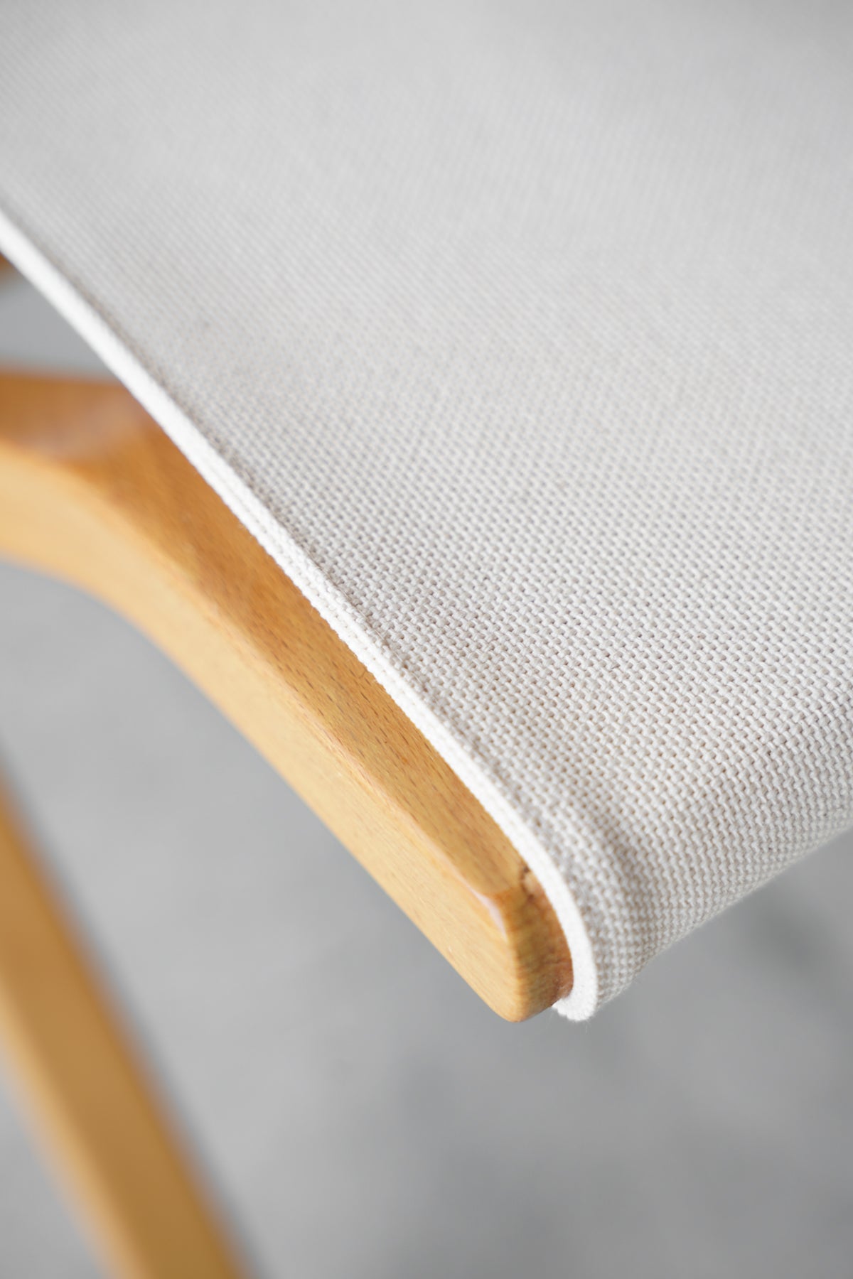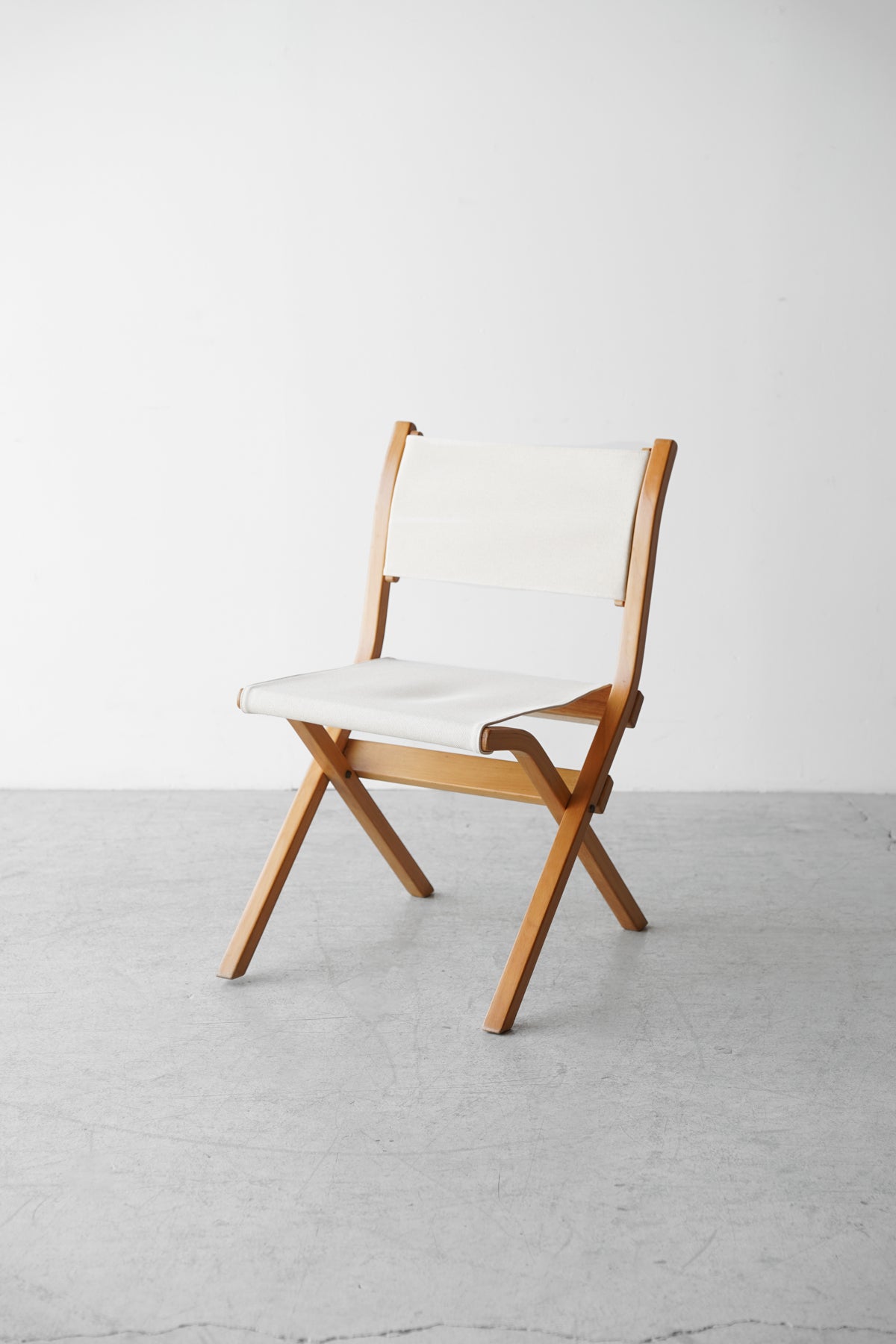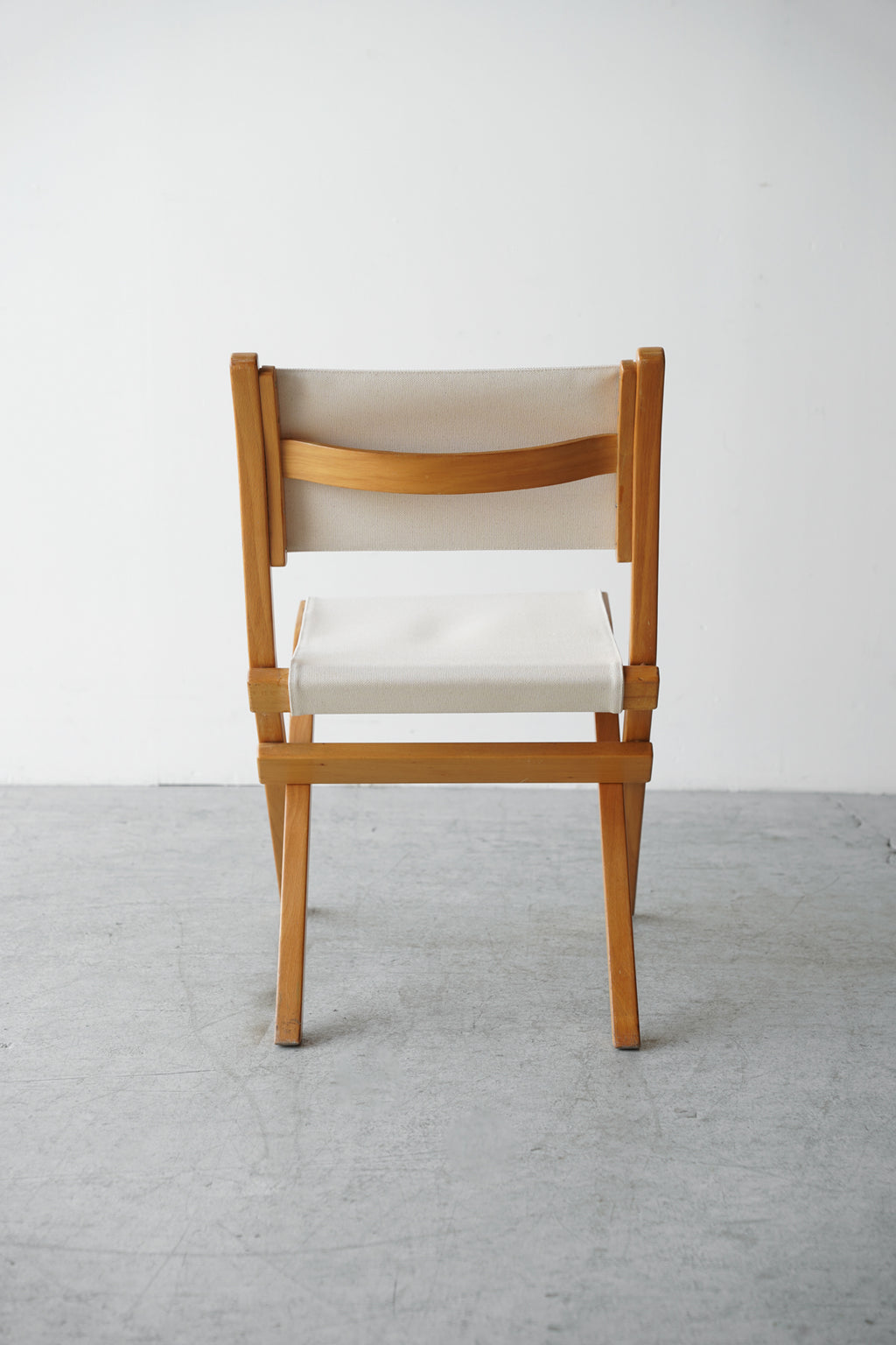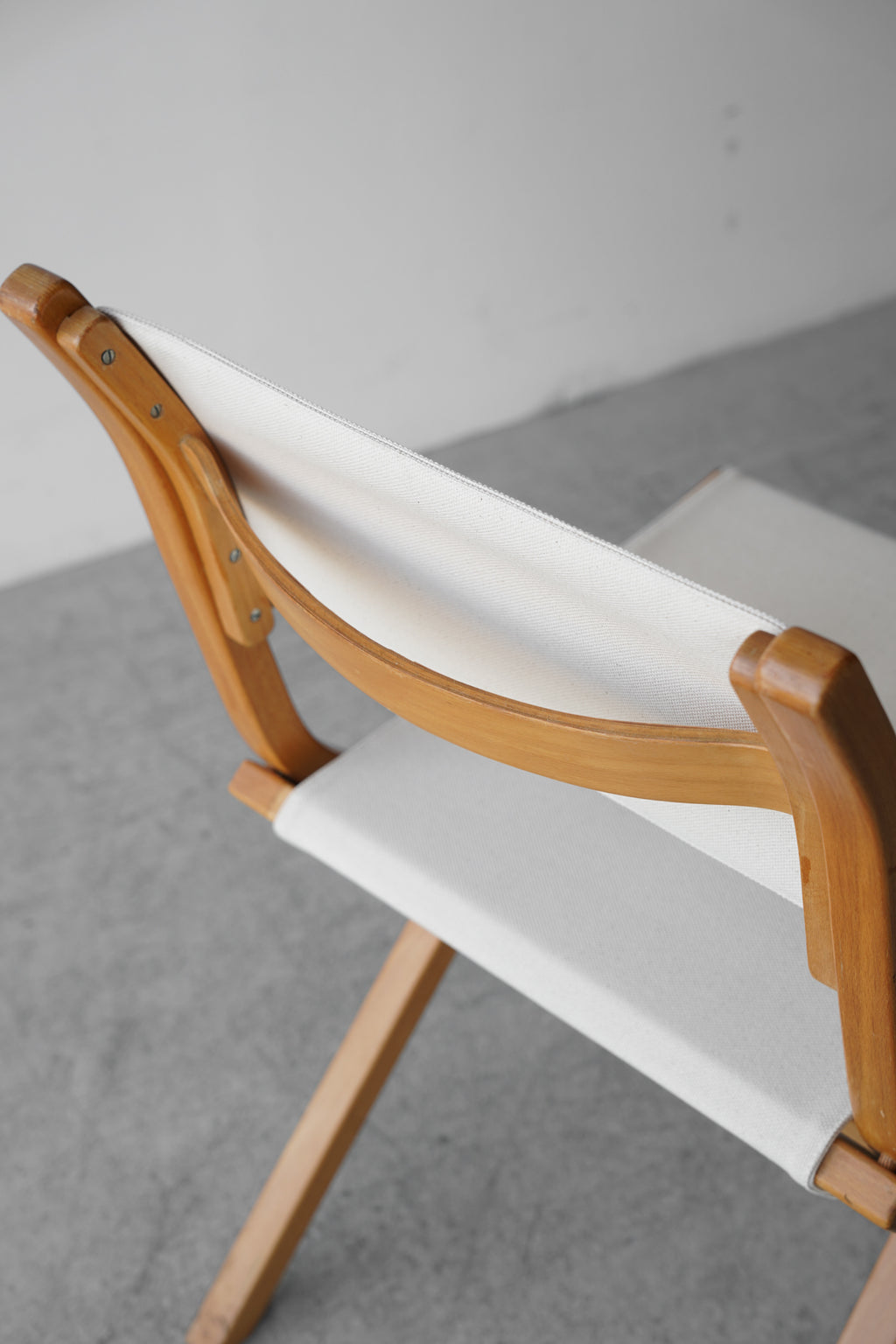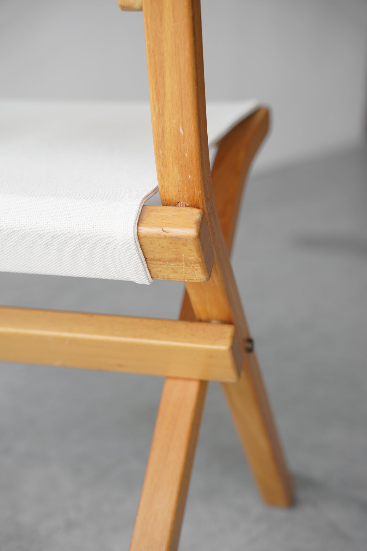 この椅子の最大の魅力は、その無駄を排したミニマルな構造と、限られたスペースでも活躍する実用性にあります。軽量ながらもしっかりとした木製フレームは、スムーズな折りたたみ機構を備えており、使用しない時はコンパクトに収納が可能です。座面と背もたれは、新たに張り替えられた白い生地が使用されており、清潔感とモダンな印象を与えます。